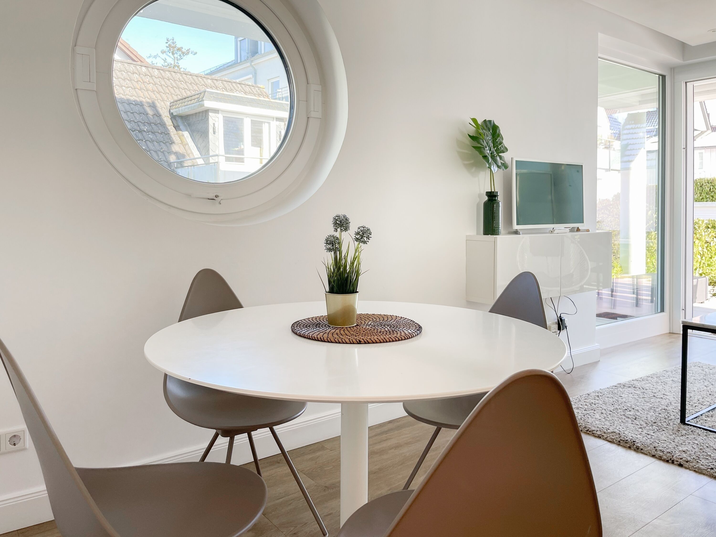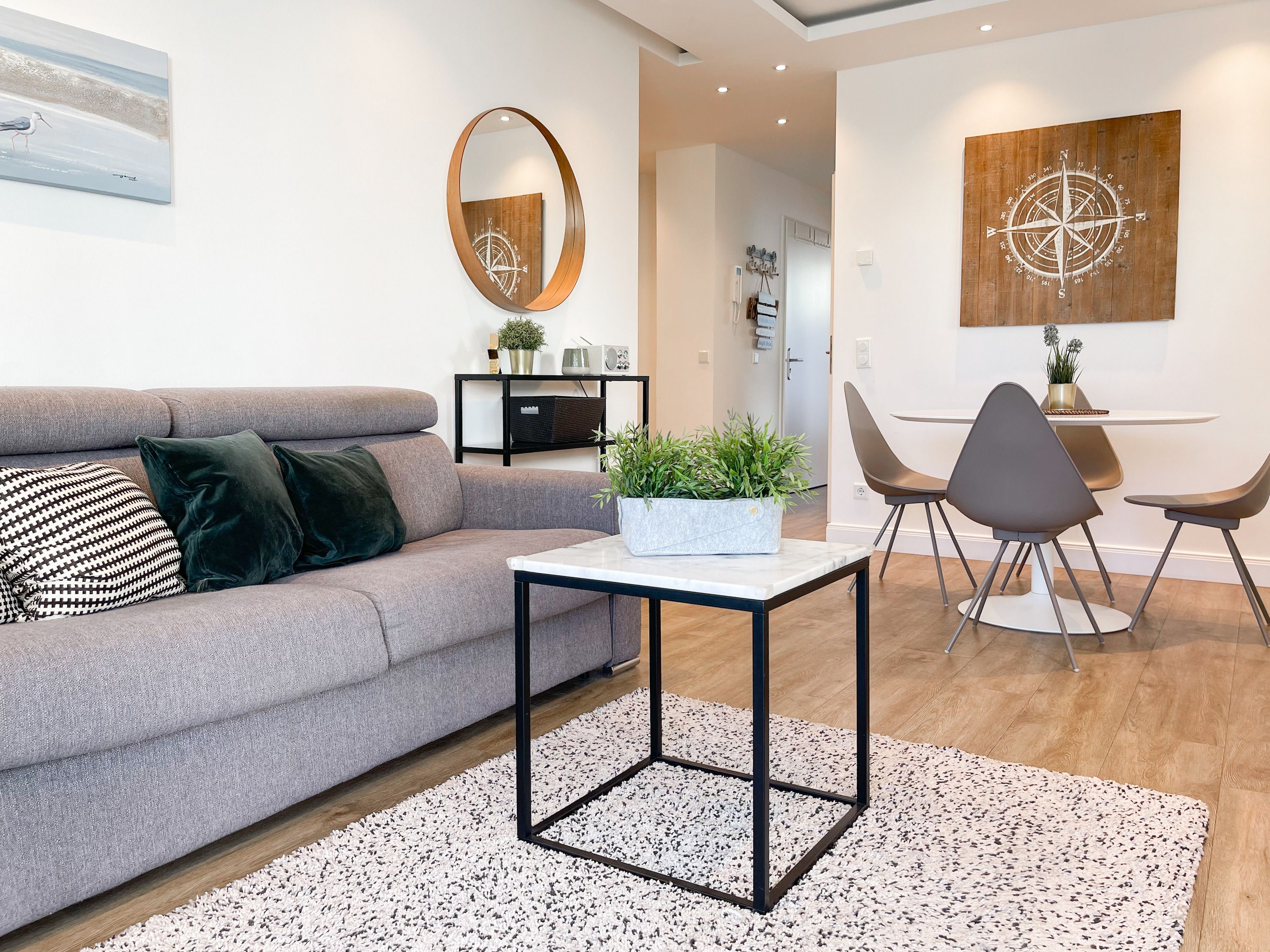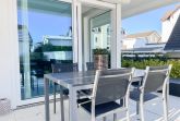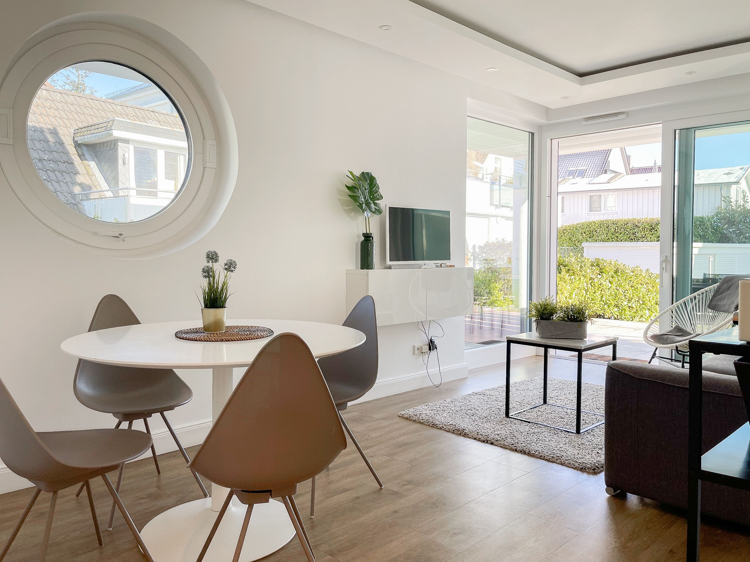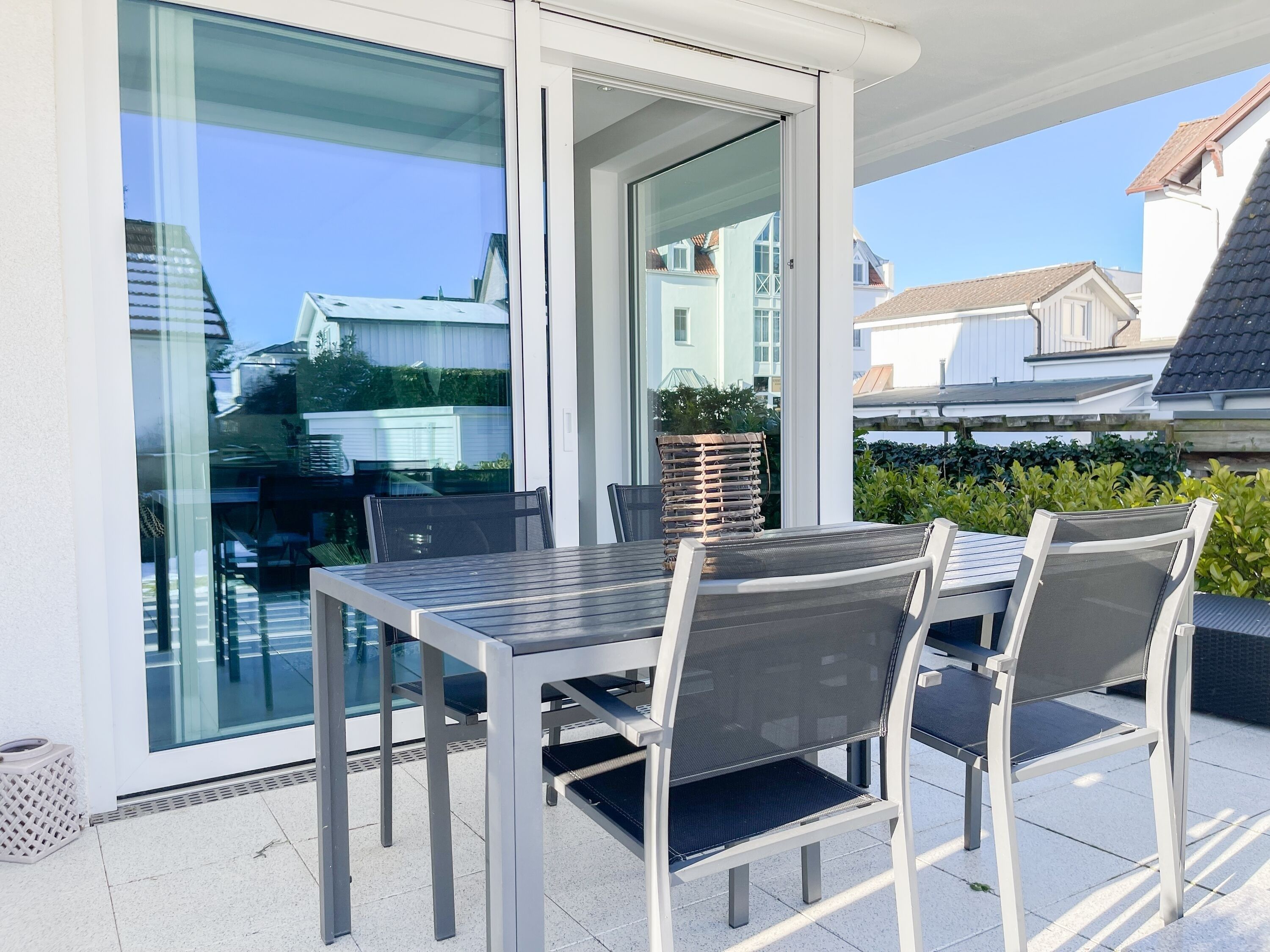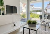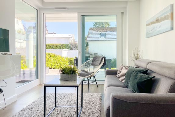 Bodentiefe Fensterelemente in der gesamten Eckwohnung, alle mit elektrischen Außenjalousien versehen, sorgen für lichtdurchflutete Räumlichkeiten. Hochwertige Bodenbeläge, die moderne, bestens ausgestattete Einbauküche und die geschmackvolle Einrichtung schaffen ein zeitgemäßes, schönes Wohnambiente. Die teilweise überdachte Sonnenterrasse ist großzügig um den gesamten Wohnbereich herum angelegt. Ausgestattet mit Gartenmöbeln und Sonnenliege ein idealer Rückzugsort zu jeder Tageszeit. Der Wohnbereich mit Terrassenzugang ist mit einem Schlafsofa (160x200), TV und WLAN ausgestattet, der integrierte Essbereich ist für 4 Personen ausgelegt. Das Schlafzimmer verfügt über ein Boxspringbett (180x200) und TV. Das hochwertige, helle Bad ist großzügig angelegt.