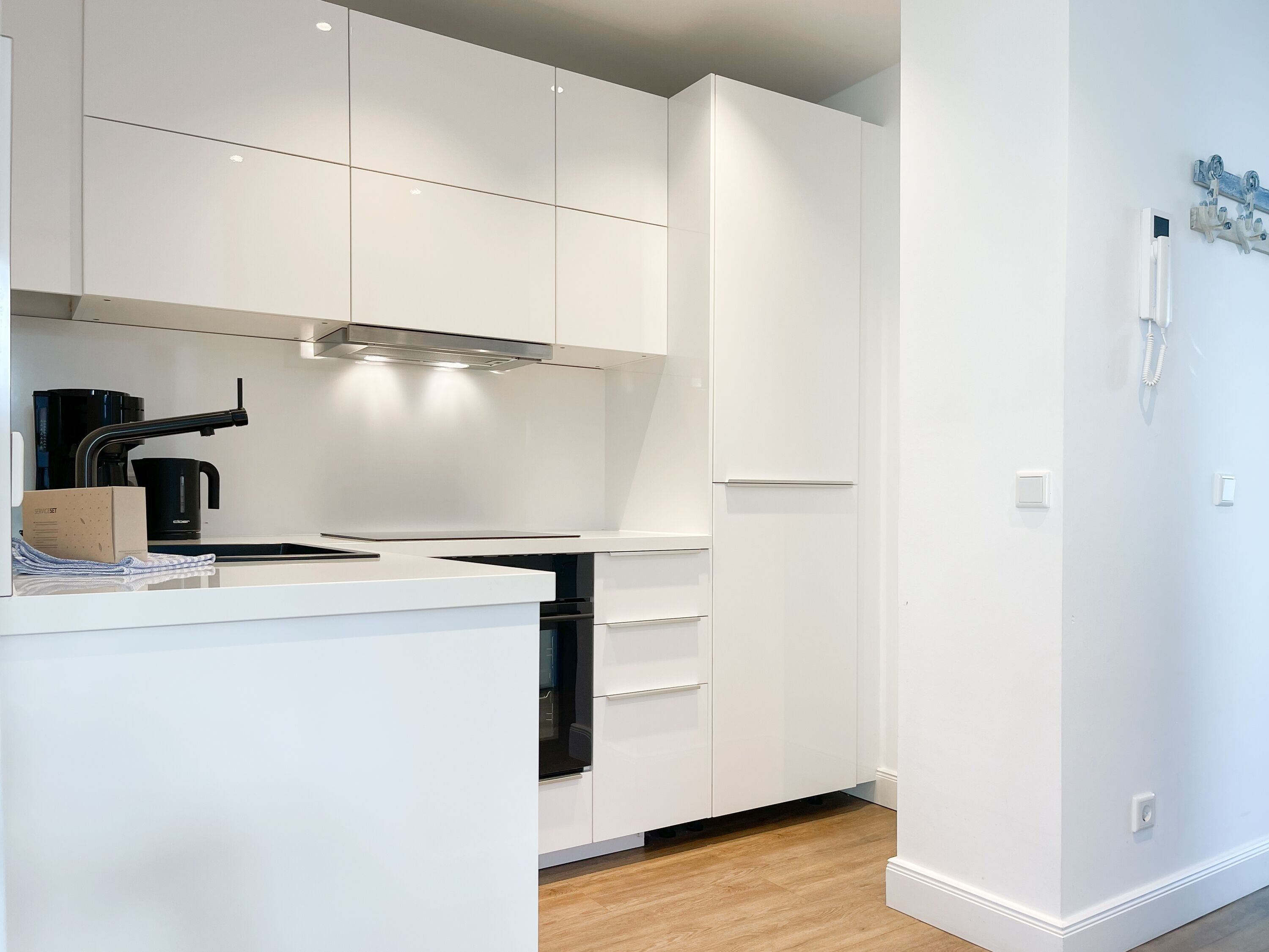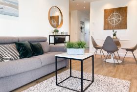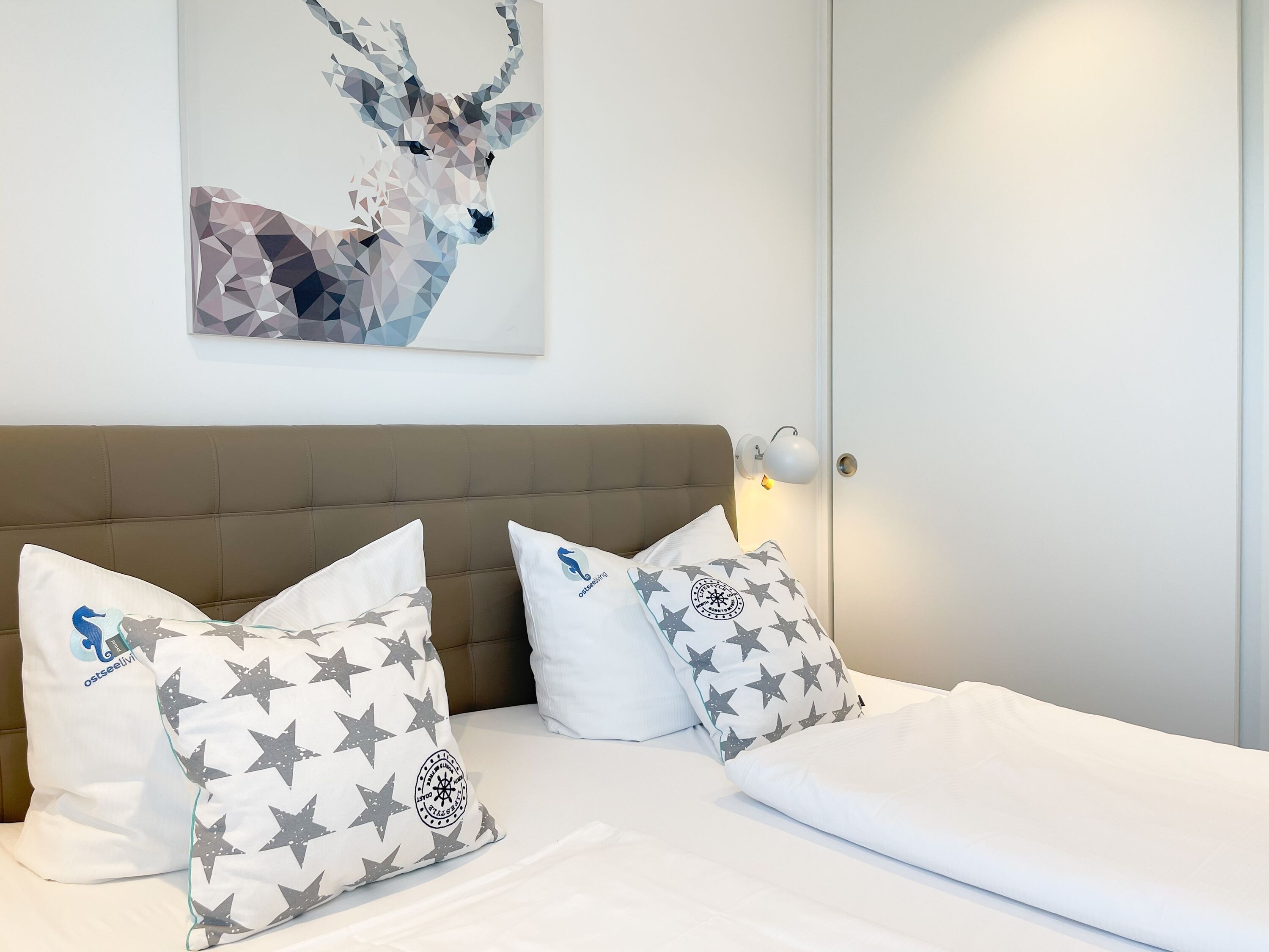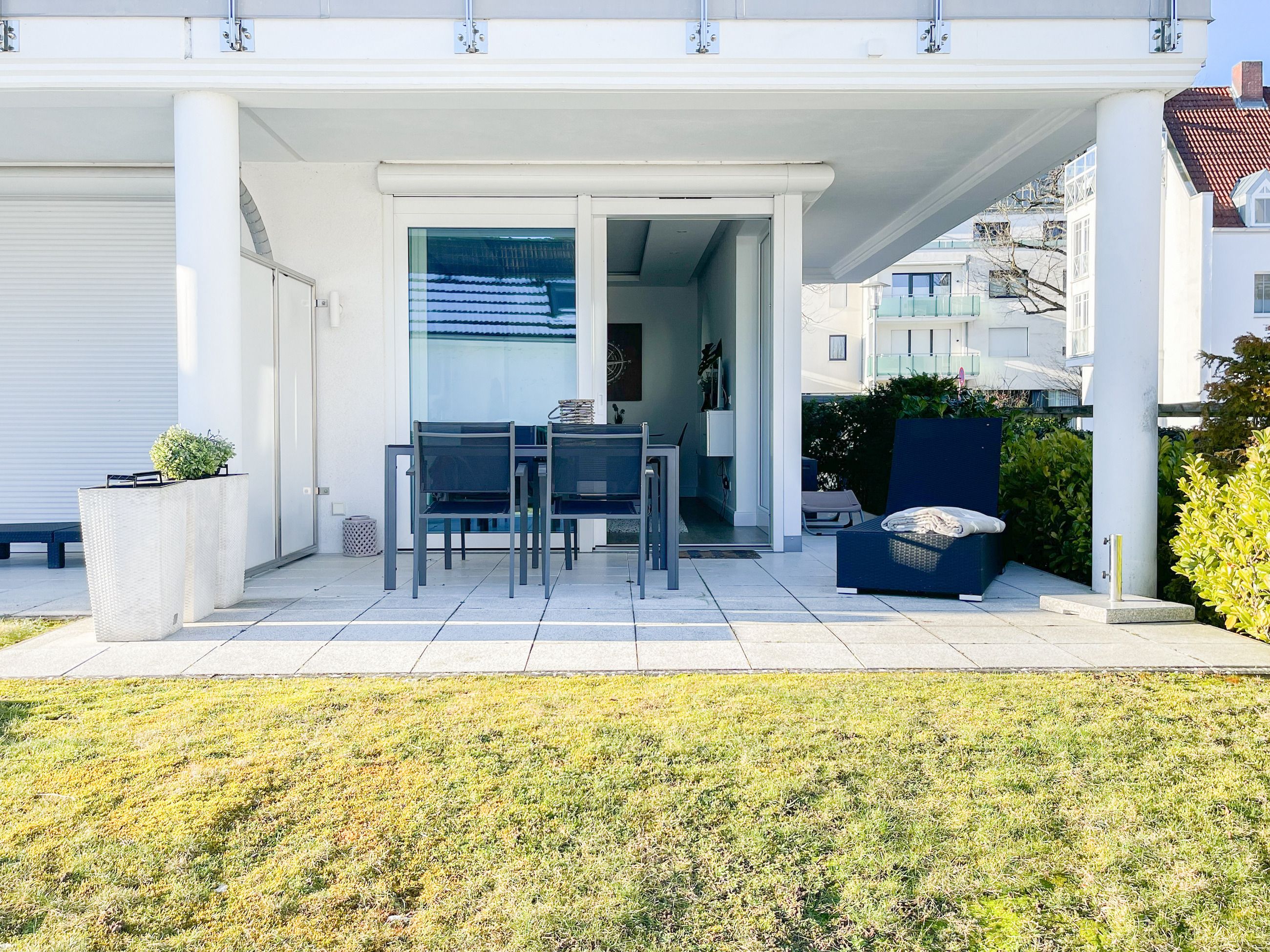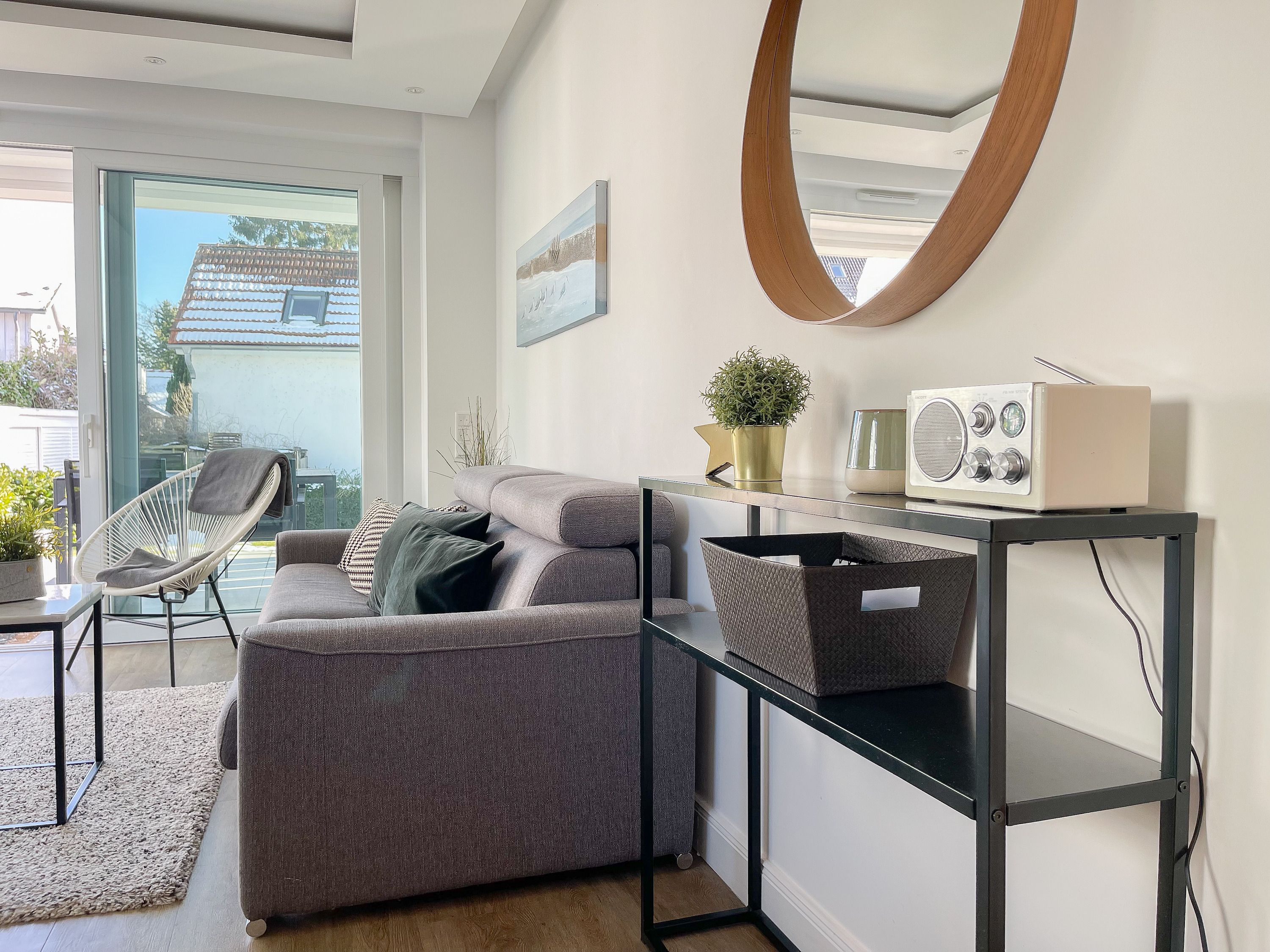 Bodentiefe Fensterelemente in der gesamten Eckwohnung, alle mit elektrischen Außenjalousien versehen, sorgen für lichtdurchflutete Räumlichkeiten. Hochwertige Bodenbeläge, die moderne, bestens ausgestattete Einbauküche und die geschmackvolle Einrichtung schaffen ein zeitgemäßes, schönes Wohnambiente. Die teilweise überdachte Sonnenterrasse ist großzügig um den gesamten Wohnbereich herum angelegt. Ausgestattet mit Gartenmöbeln und Sonnenliege ein idealer Rückzugsort zu jeder Tageszeit. Der Wohnbereich mit Terrassenzugang ist mit einem Schlafsofa (160x200), TV und WLAN ausgestattet, der integrierte Essbereich ist für 4 Personen ausgelegt. Das Schlafzimmer verfügt über ein Boxspringbett (180x200) und TV. Das hochwertige, helle Bad ist großzügig angelegt.