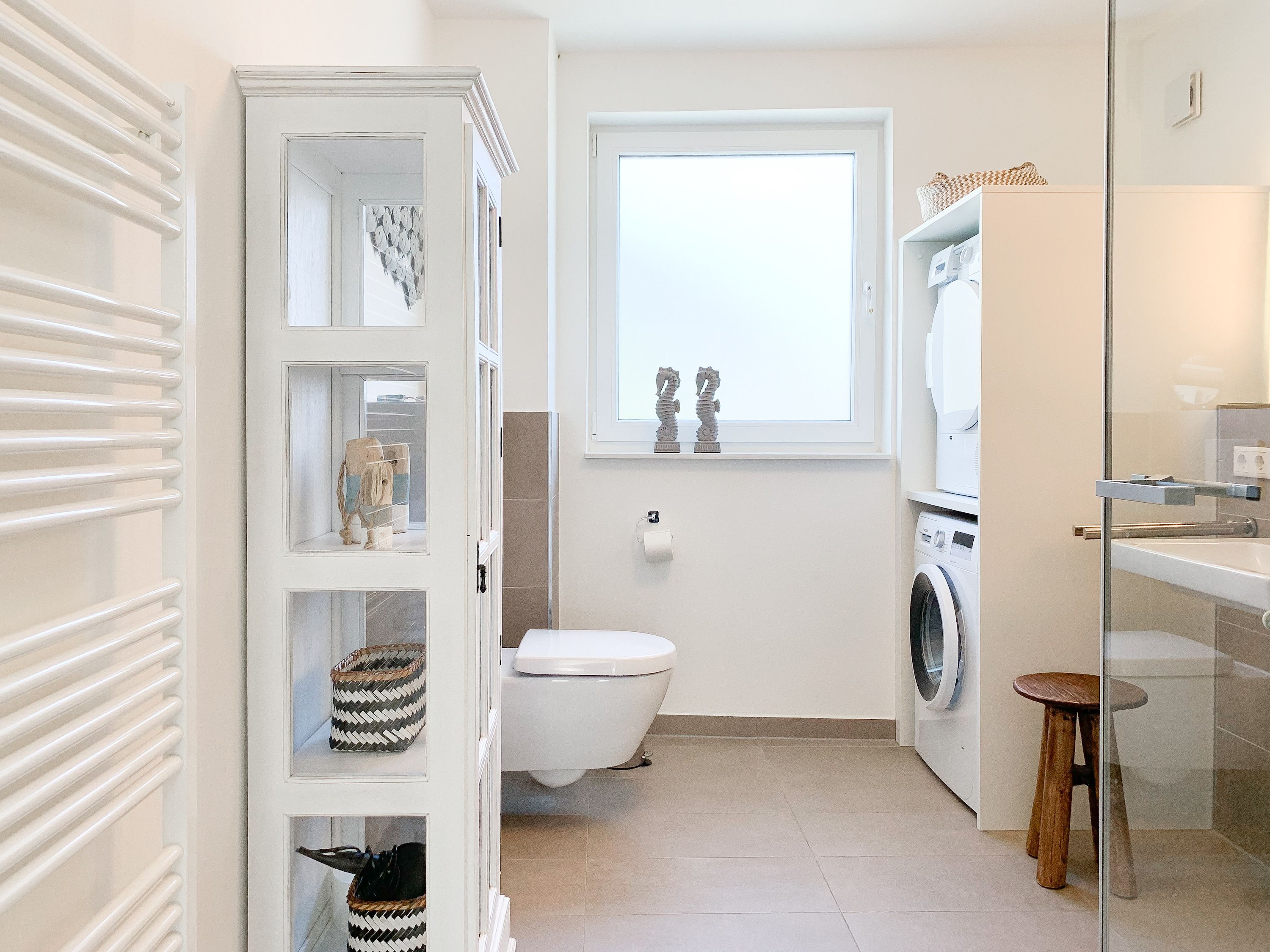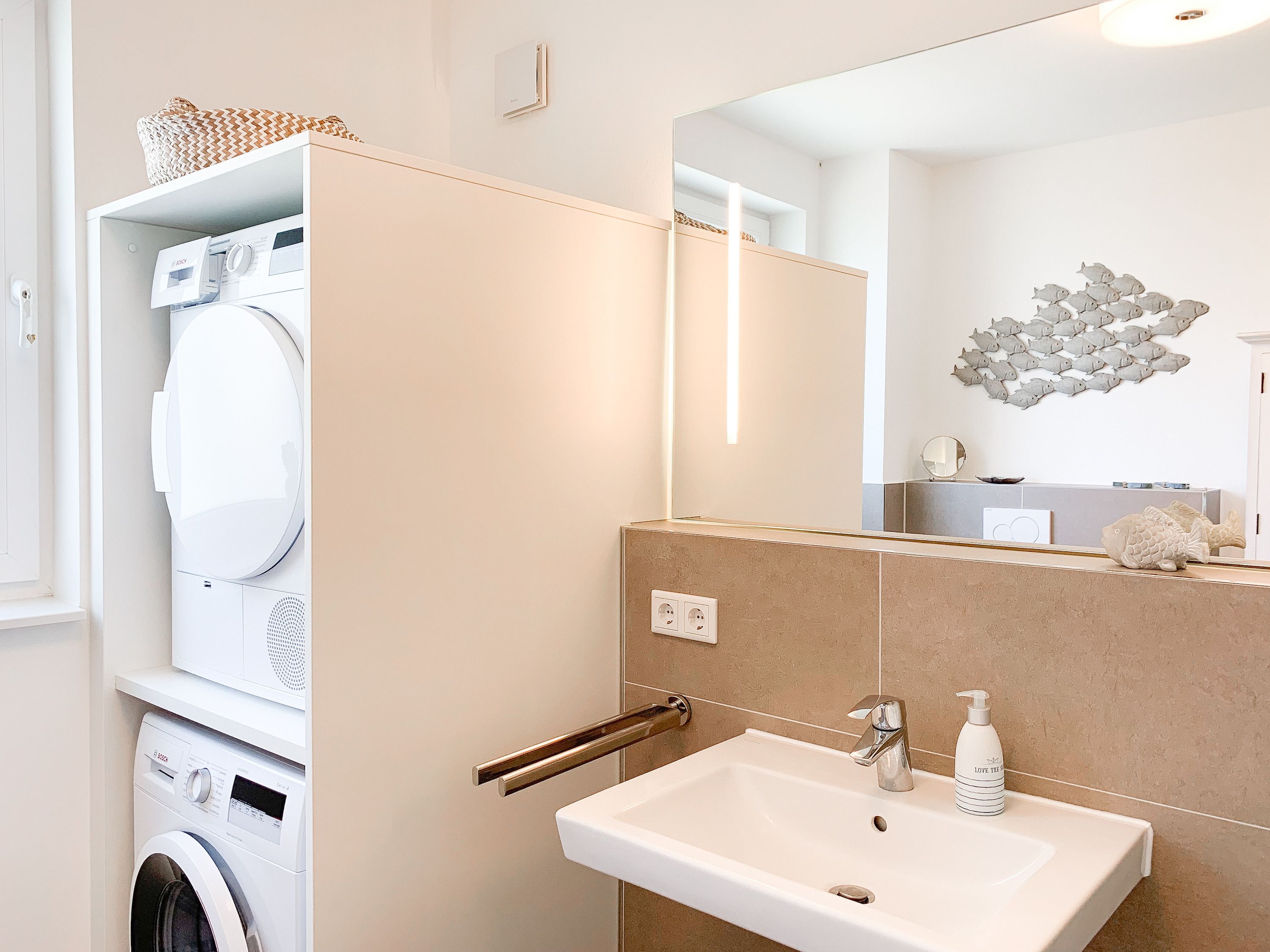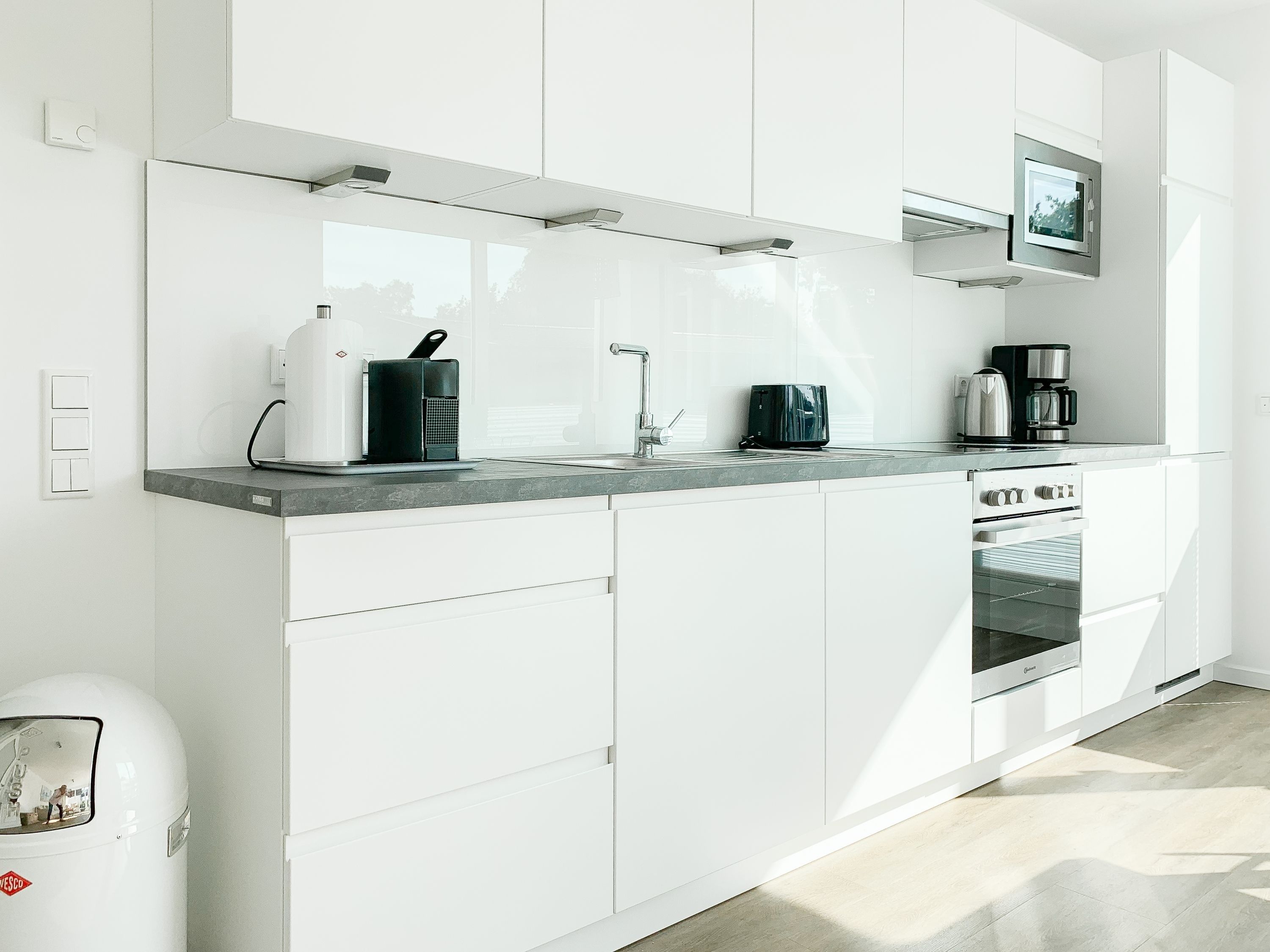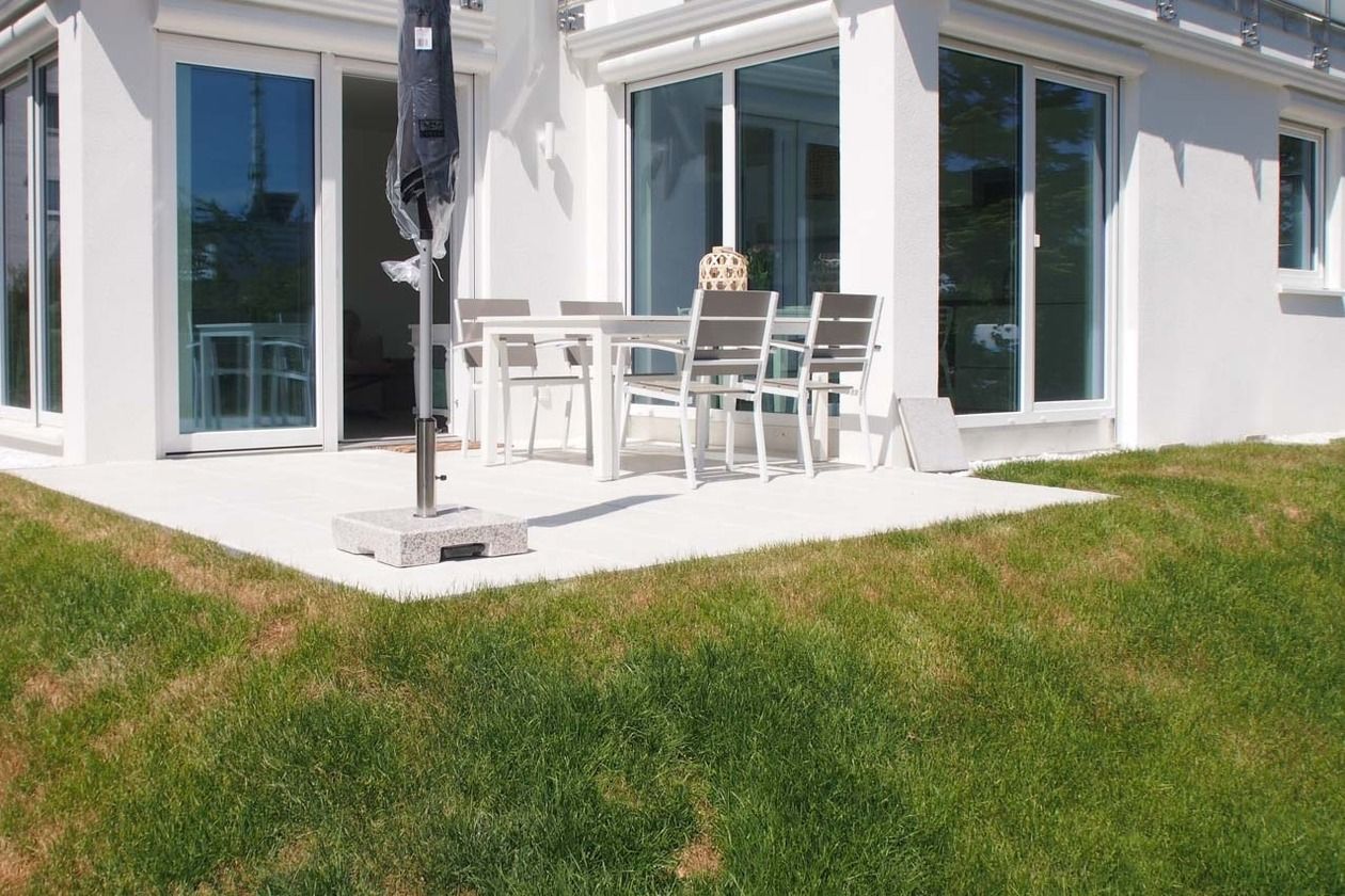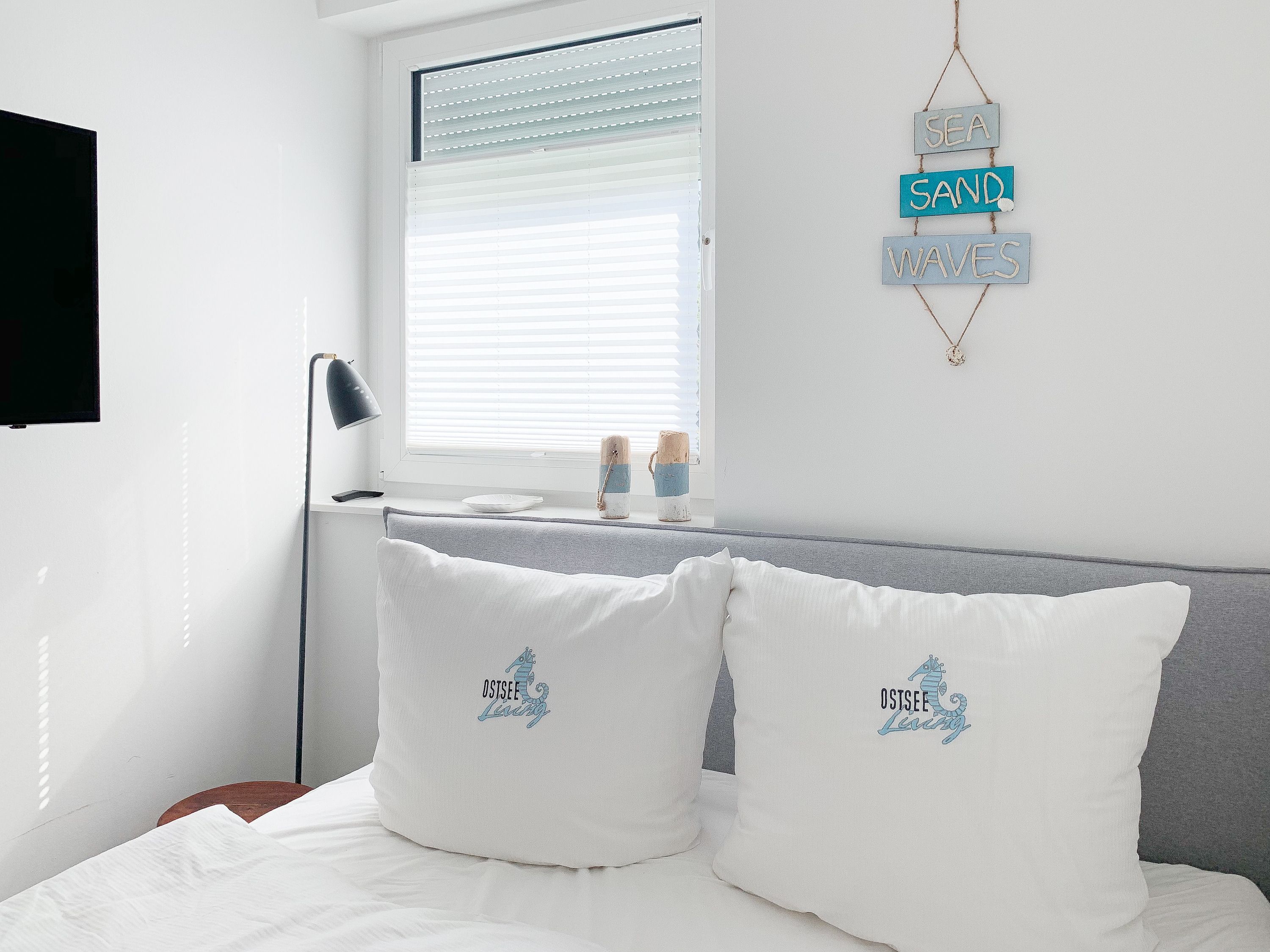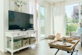 Die Ferienwohnung ist hochwertig ausgestattet und geschmackvoll eingerichtet. Bodentiefe Fensterflächen sorgen für einen lichtdurchfluteten Wohnbereich mit einem gemütlichen Sofa, Sessel und TV. Die vorgelagerte Sonnenterrasse ist ein wunderbarer Platz, um entspannte Urlaubstage zu genießen. Die offene Einbauküche mit angrenzendem Essbereich ist bestens mit allen technischen Geräten ausgestattet, um höchsten Ansprüchen zu genügen. Es stehen zwei separate Schlafzimmer zur Verfügung, die beide mit Boxspringbetten (180x200 und 160x200), Kleiderschrank und TV ausgestattet sind. Das hochwertige Duschbad mit integrierter Waschmaschine und integriertem Trockner ist großzügig angelegt und bietet reichlich Tageslicht. Die gesamte Wohnung ist mit elektrischen Außenjalousien versehen und verfügt über eine Fußbodenheizung für ein angenehmes Raumklima.