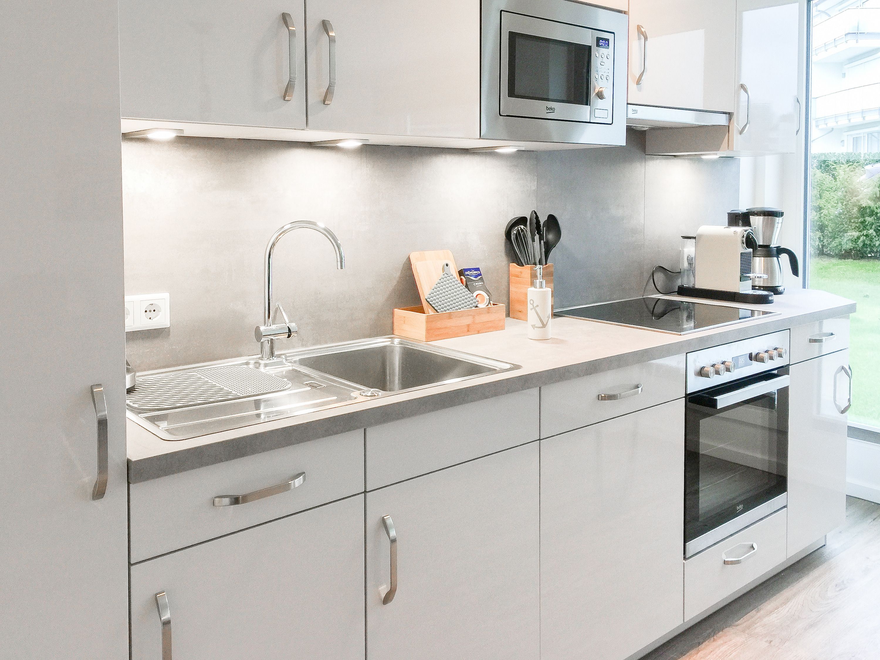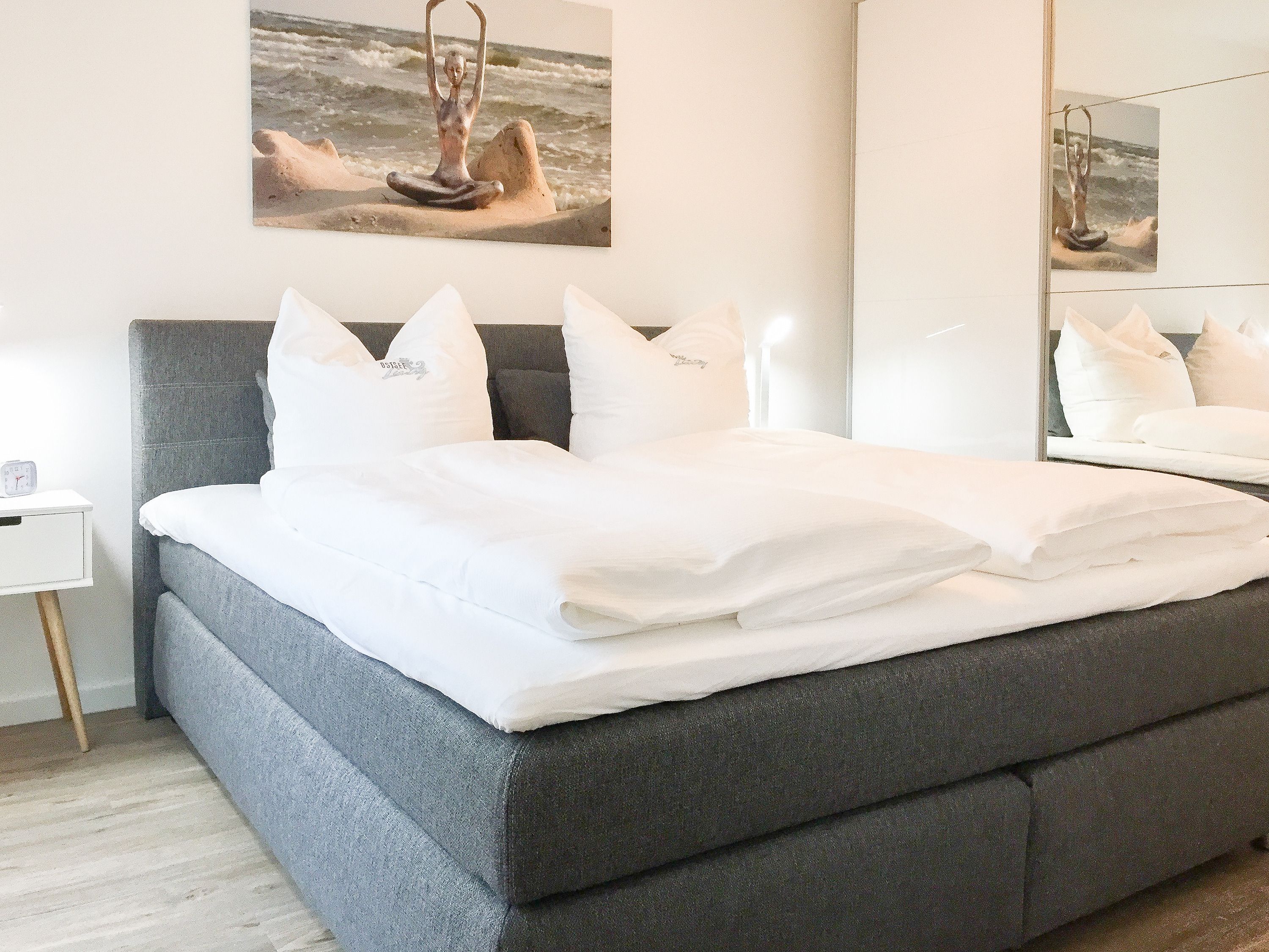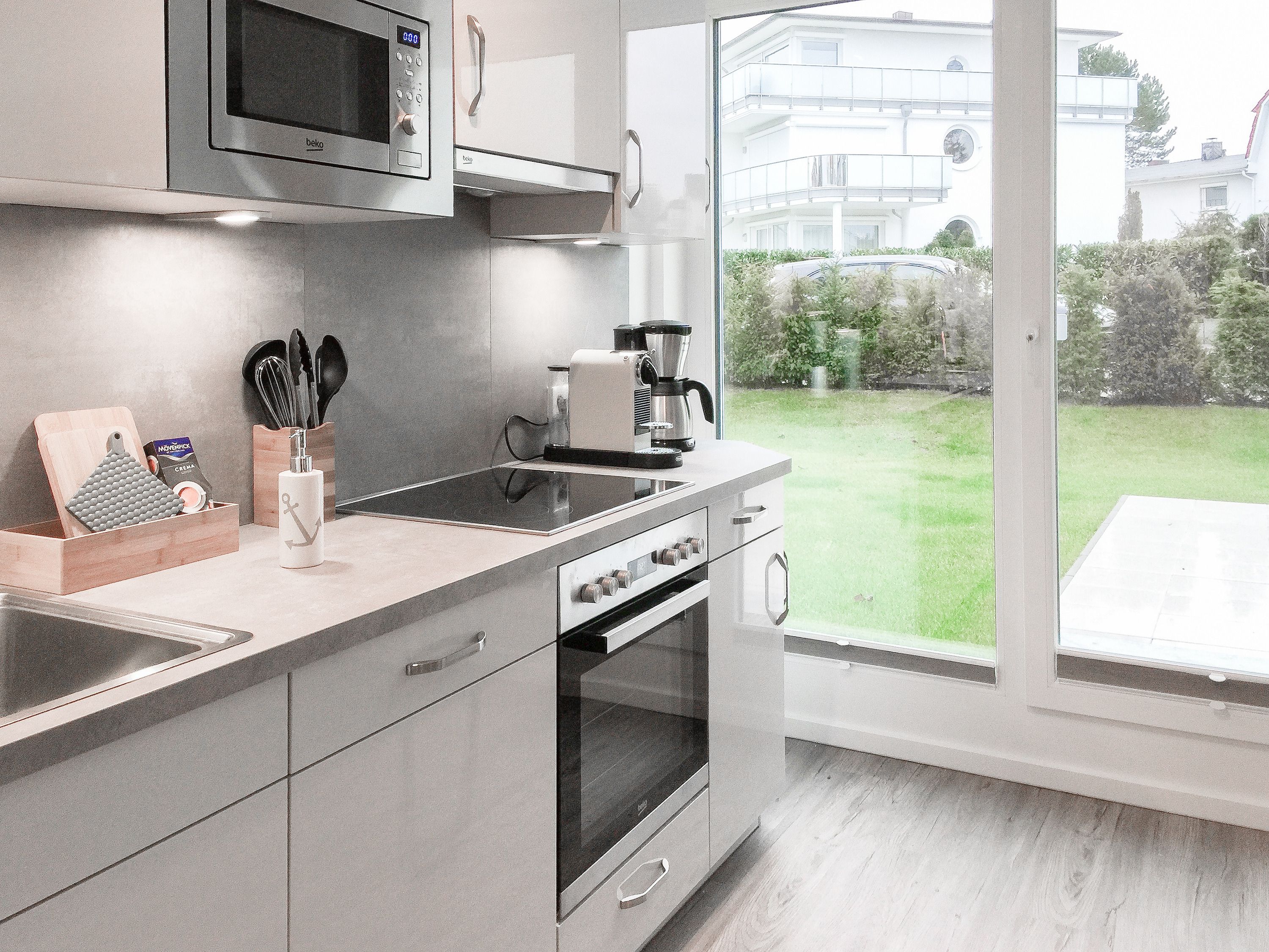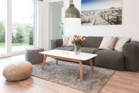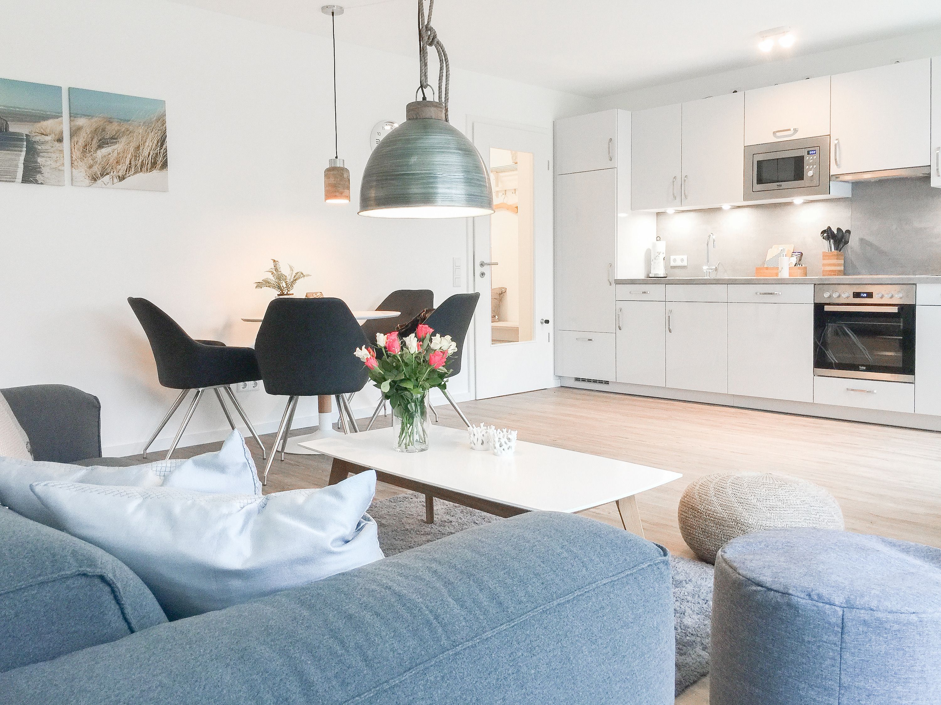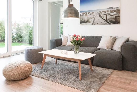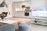 Die ca. 60 qm großzügig geschnittene Wohnung mit 3 Räumen, bietet genügend Platz für 4 Personen und befindet sich im Erdgeschoss einer Neubau-Wohnanlage. Die moderne Einbauküche ist direkt mit dem gemütlichen Wohn-Essbereich verbunden. Schöne Designböden sowie liebevolle, maritime Dekorationselemente sorgen für Behaglichkeit und spiegeln die Nähe zum Meer wieder. Alle bodentiefen Fenster sind mit elektrischen Außenjalousien ausgestattet und sorgen am Tag für lichtdurchflutete Räume. Zwei Schlafzimmer, eingerichtet mit einem Boxspringbett (180x200) und einem Doppelbett (140x200), lassen Sie nach einem ereignisreichen Urlaubstag perfekt zur Ruhe kommen. Das Bad bietet eine ebenso moderne Ausstattung wie die anderen Bereiche der Wohnung. Selbstverständlich gehören die kostenlose WLAN Nutzung, Radio und ein großer Flat Screen-TV zum Entertainment-Paket. Auf der dazugehörigen, möblierten Terrasse mit elektrischer Markise können Sie die Sonnentage an der frischen Luft genießen, entspannen oder einfach Ihre Seele baumeln lassen.