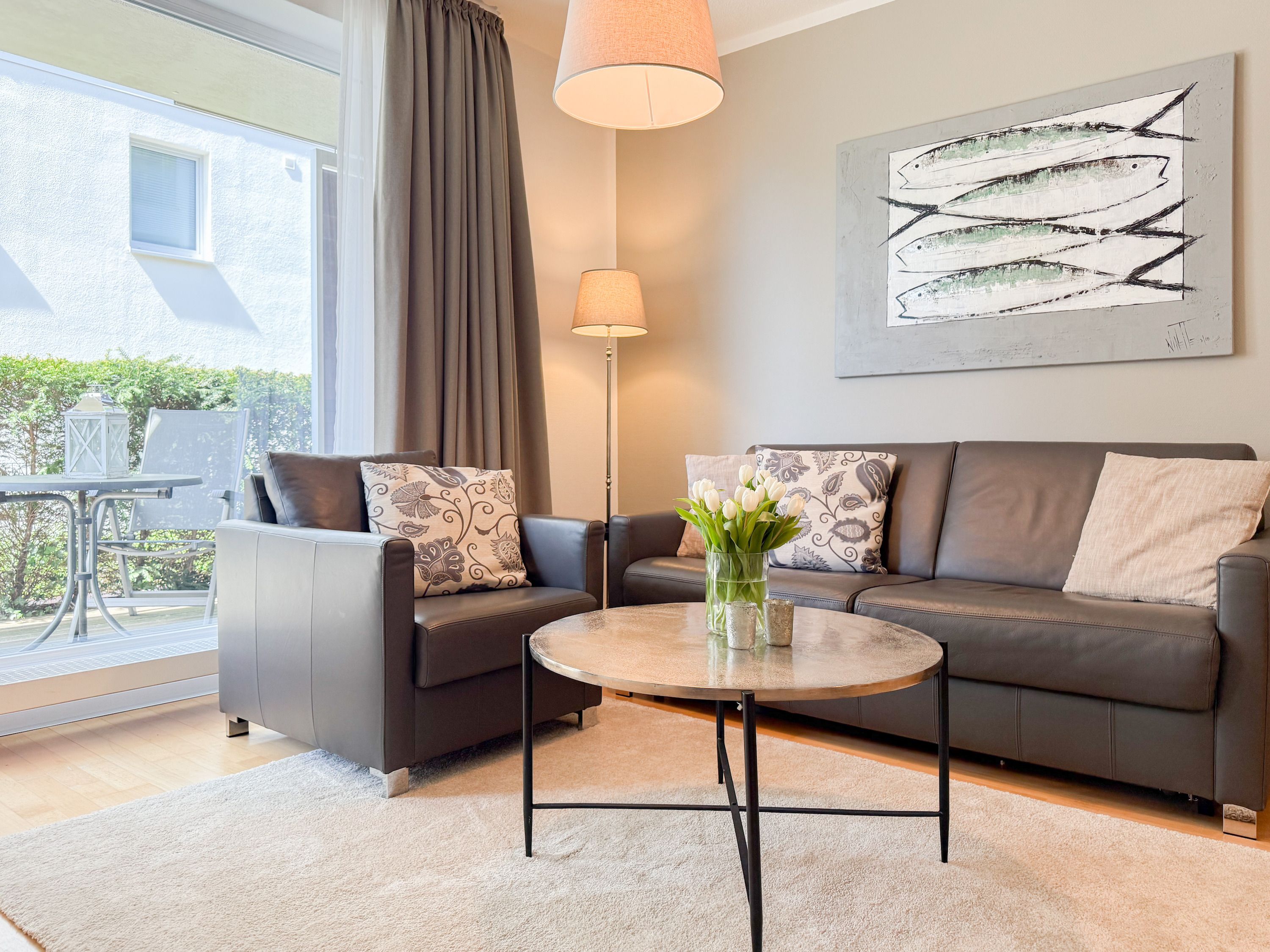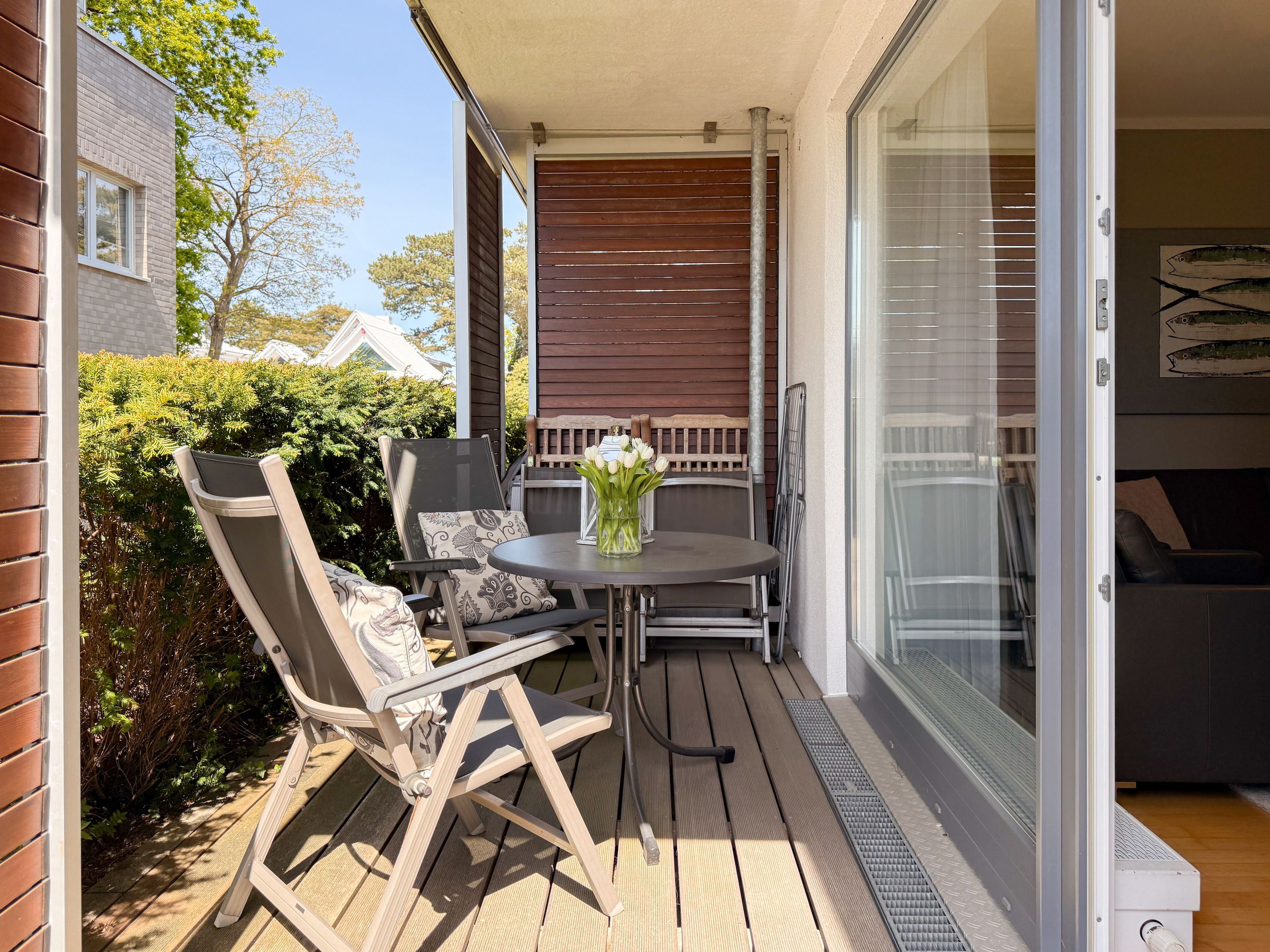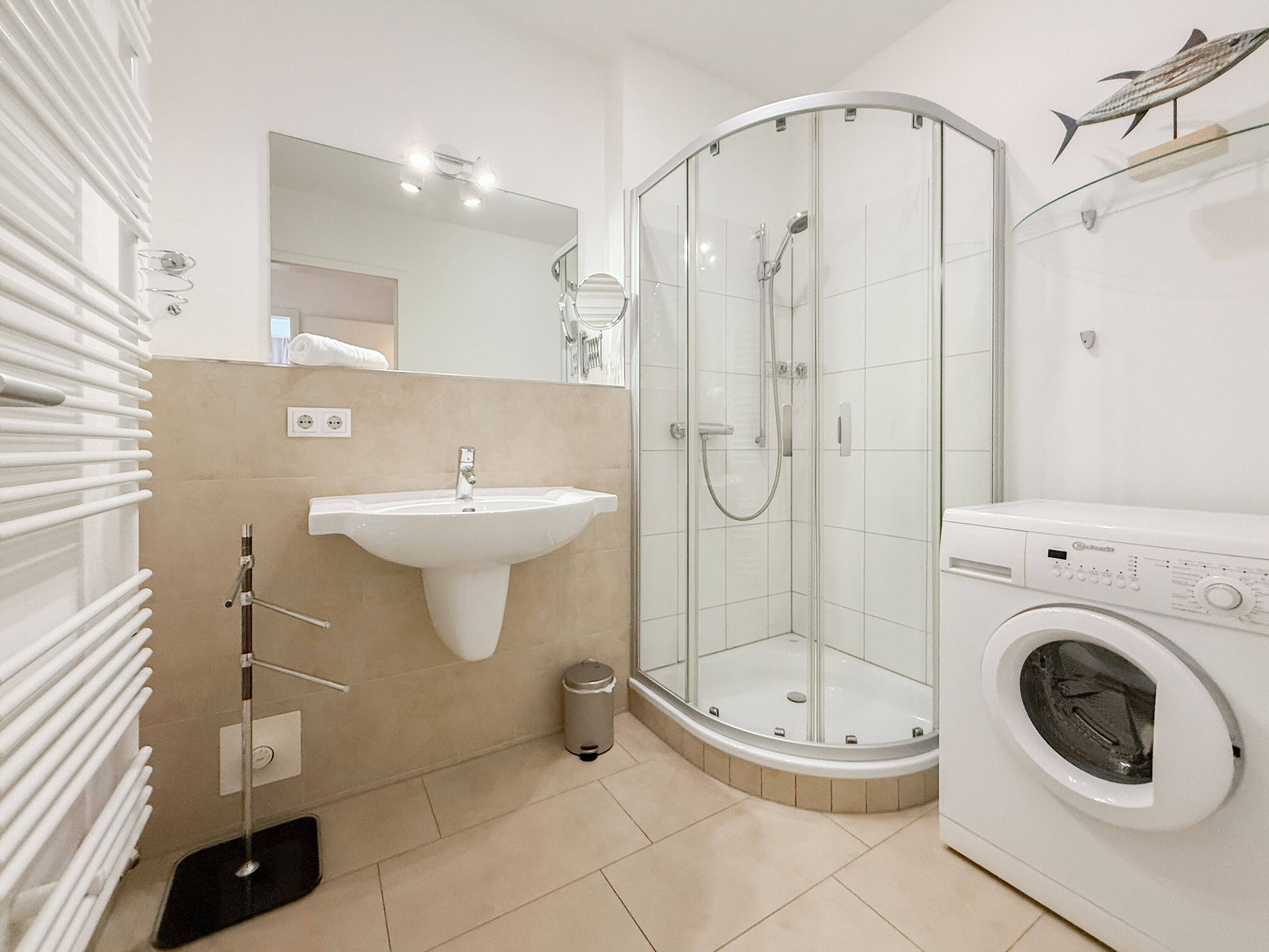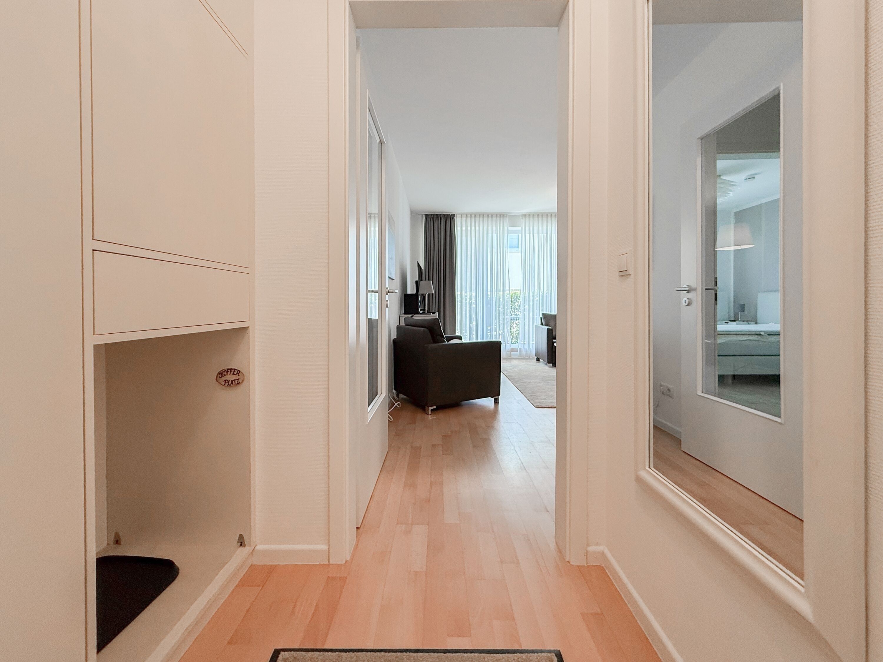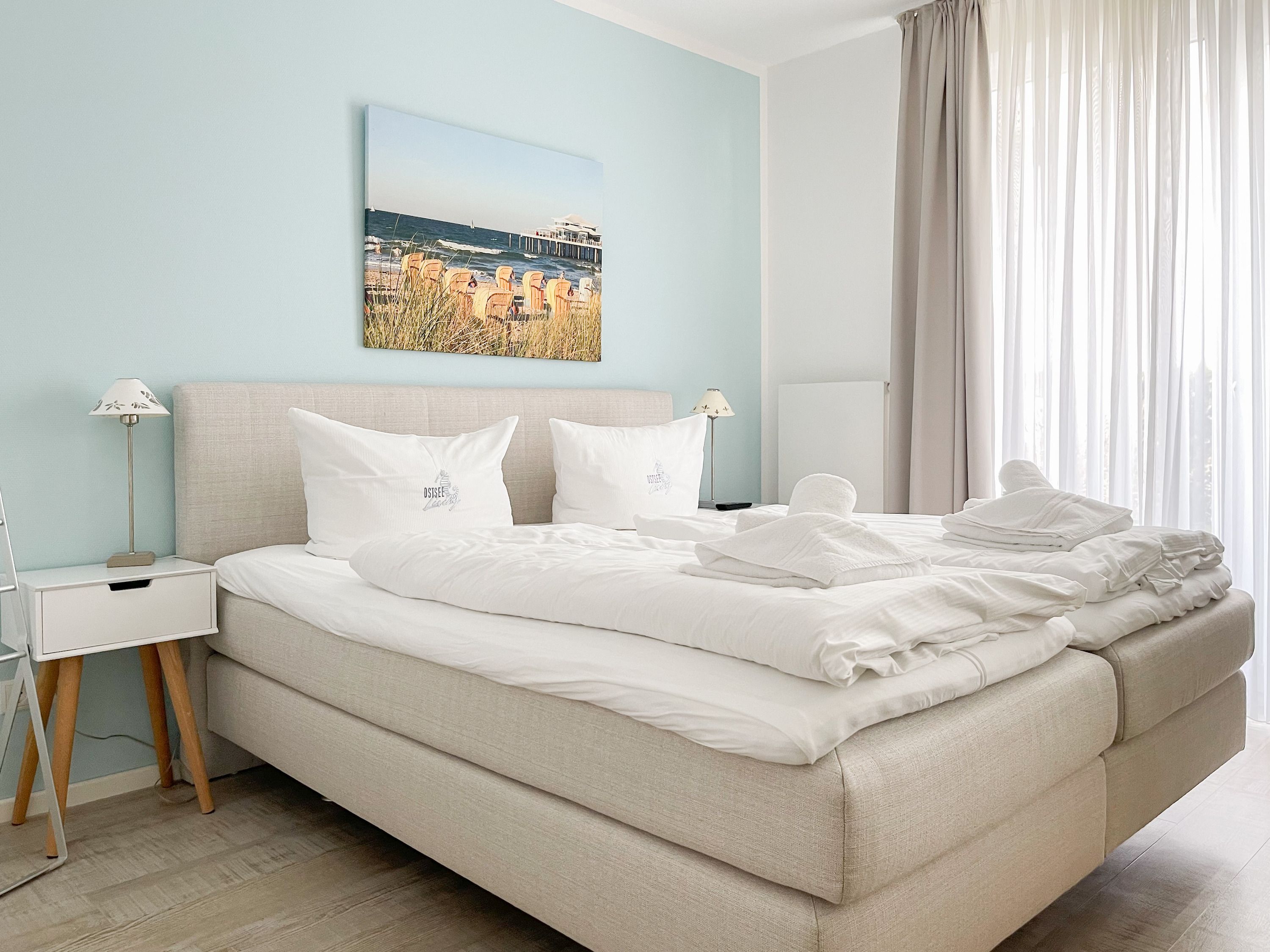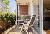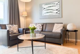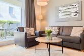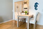 Es erwartet Sie eine geschmackvoll eingerichtete Ferienwohnung mit bodentiefen Fenstern, die lichtdurchflutete Räume für einen erholsamen Ostseeurlaub in schönem Ambiente schaffen. Die großzügige Westterrasse ist sowohl vom Wohn- als auch vom Schlafzimmer aus zu erreichen - ein herrlicher Rückzugsort, um den Abend bei einem Glas Wein ausklingen zu lassen. Im Wohnbereich erwartet Sie ein hochwertiges Sofa mit Schlaffunktion (160x200), TV und Radio. WLAN steht Ihnen selbstverständlich kostenlos zur Verfügung. Der angrenzende Essbereich bietet ausreichend Platz für gemeinsame Mahlzeiten und gemütliches Beisammensein. Die integrierte Einbauküche verfügt über alle technischen Geräte und eine gute Ausstattung zum gemeinsamen Kochen. Das Schlafzimmer ist mit einem hochwertigen Boxspringbett (180x200), einem geräumigen Schrank und einem zusätzlichen Fernseher ausgestattet. Alle Fenster sind mit Verdunkelungsvorhängen versehen. Das großzügige Bad ist mit Dusche, Waschbecken, Fön, Handtuchtrockner und integrierter Waschmaschine ausgestattet. Das WC befindet sich in einem separaten Raum.