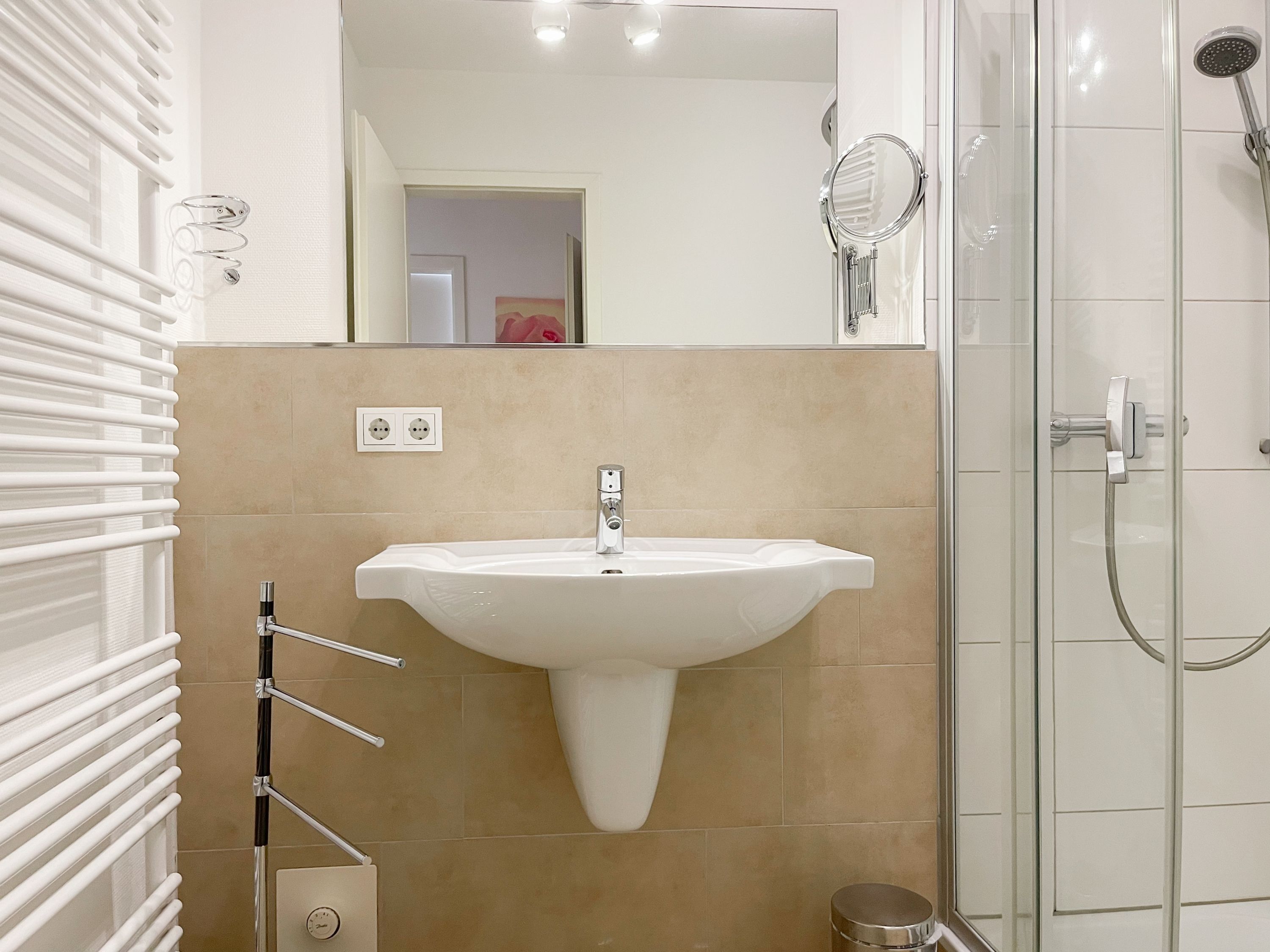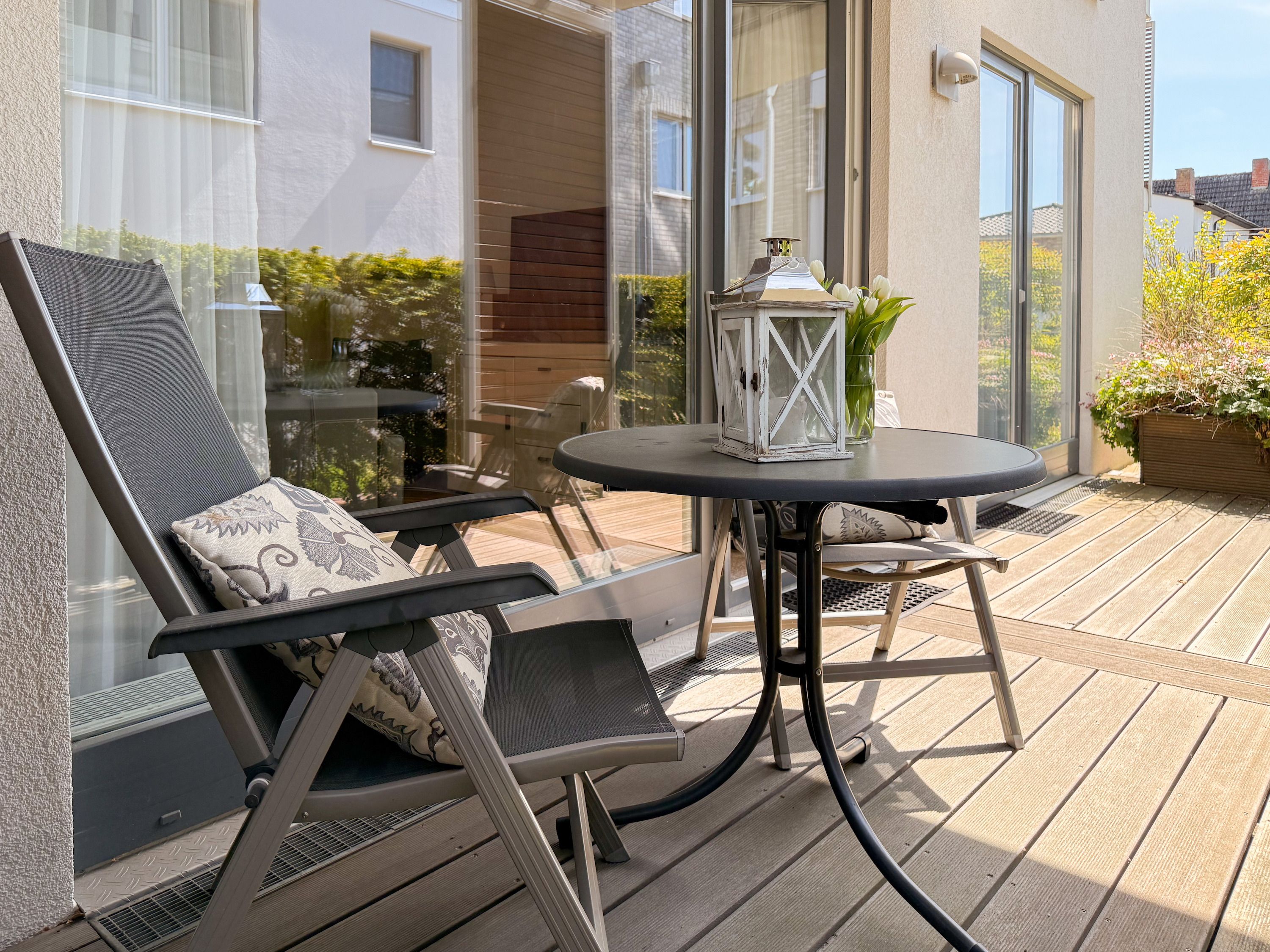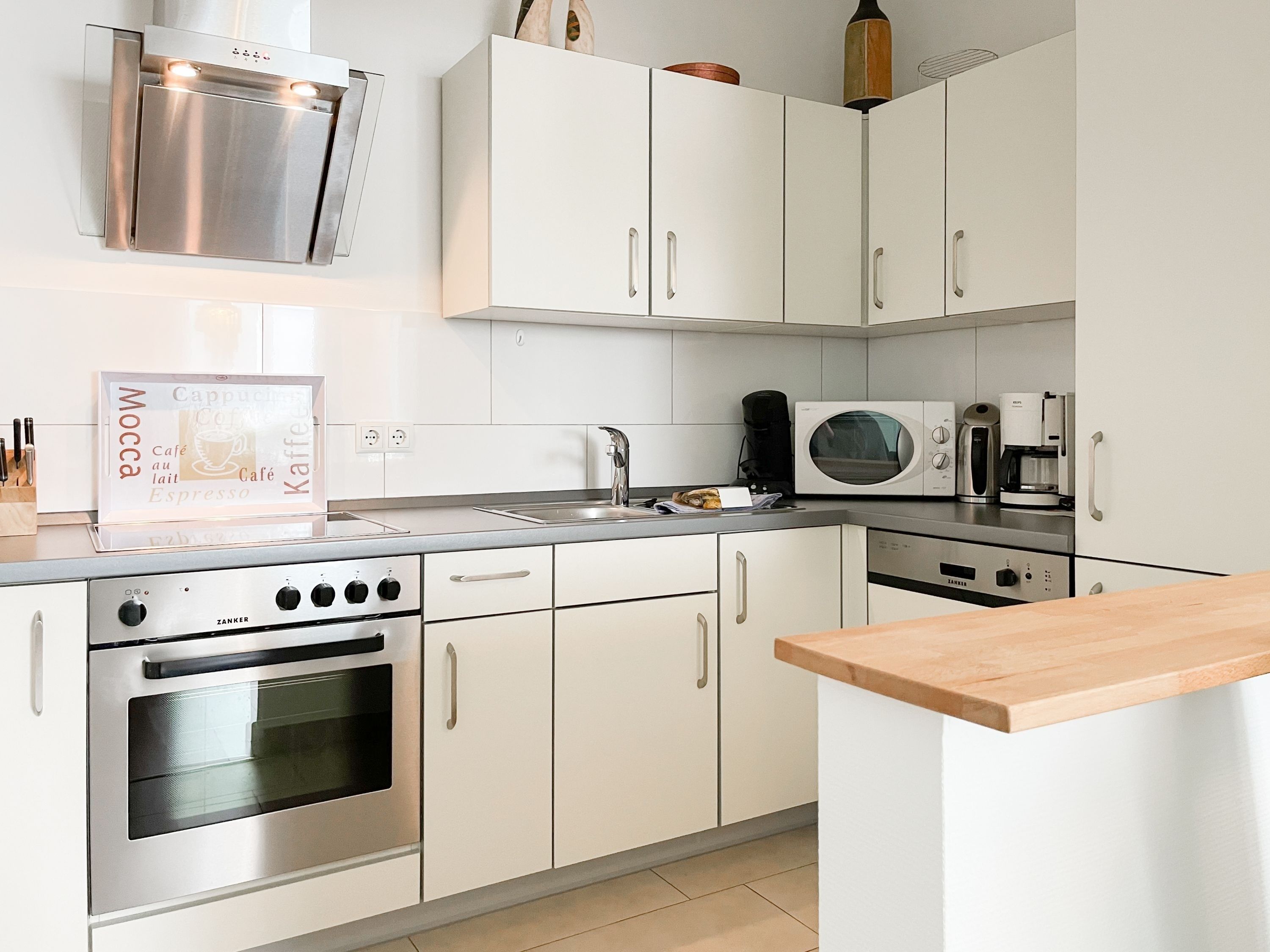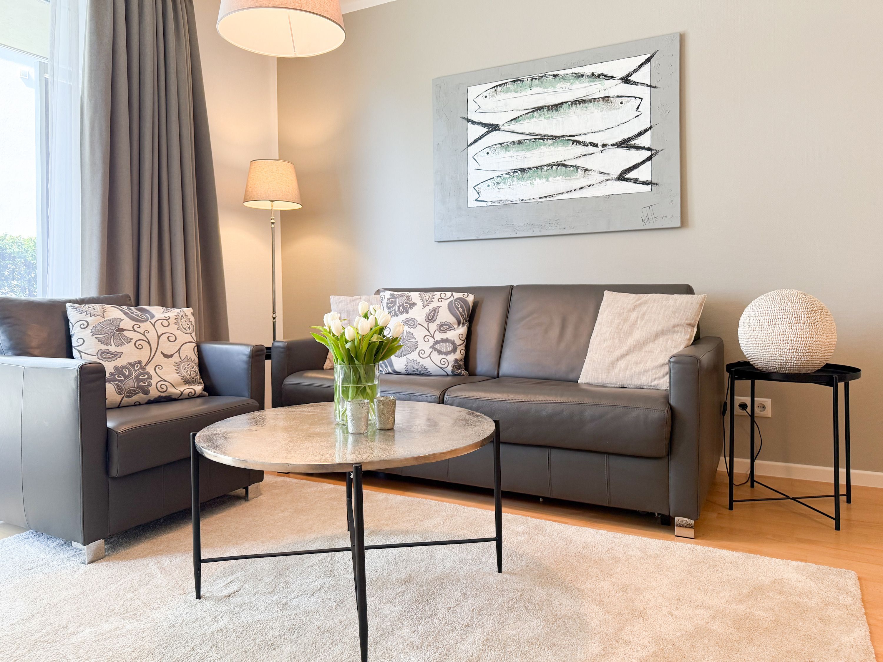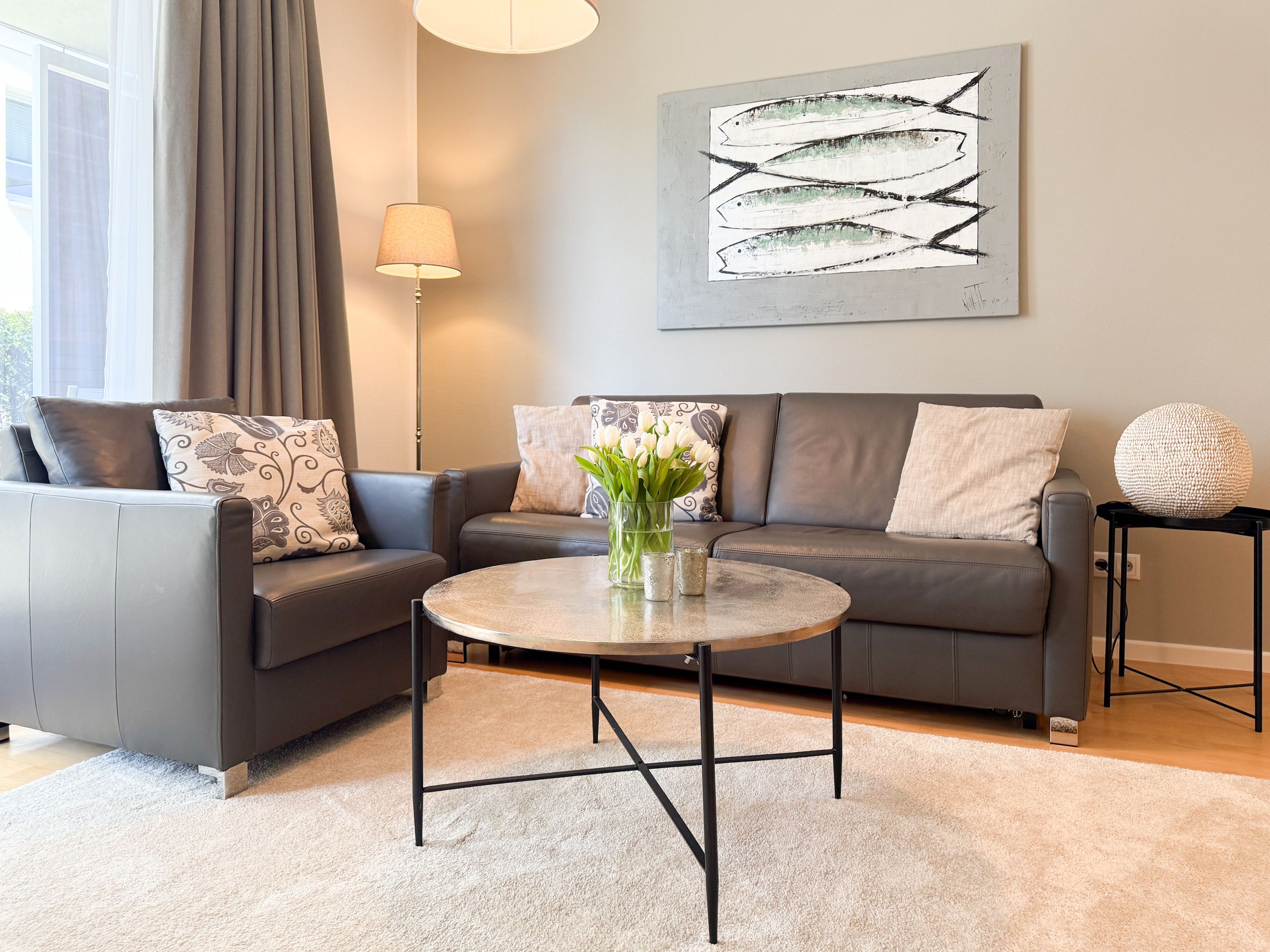 Es erwartet Sie eine geschmackvoll eingerichtete Ferienwohnung mit bodentiefen Fenstern, die lichtdurchflutete Räume für einen erholsamen Ostseeurlaub in schönem Ambiente schaffen. Die großzügige Westterrasse ist sowohl vom Wohn- als auch vom Schlafzimmer aus zu erreichen - ein herrlicher Rückzugsort, um den Abend bei einem Glas Wein ausklingen zu lassen. Im Wohnbereich erwartet Sie ein hochwertiges Sofa mit Schlaffunktion (160x200), TV und Radio. WLAN steht Ihnen selbstverständlich kostenlos zur Verfügung. Der angrenzende Essbereich bietet ausreichend Platz für gemeinsame Mahlzeiten und gemütliches Beisammensein. Die integrierte Einbauküche verfügt über alle technischen Geräte und eine gute Ausstattung zum gemeinsamen Kochen. Das Schlafzimmer ist mit einem hochwertigen Boxspringbett (180x200), einem geräumigen Schrank und einem zusätzlichen Fernseher ausgestattet. Alle Fenster sind mit Verdunkelungsvorhängen versehen. Das großzügige Bad ist mit Dusche, Waschbecken, Fön, Handtuchtrockner und integrierter Waschmaschine ausgestattet. Das WC befindet sich in einem separaten Raum.