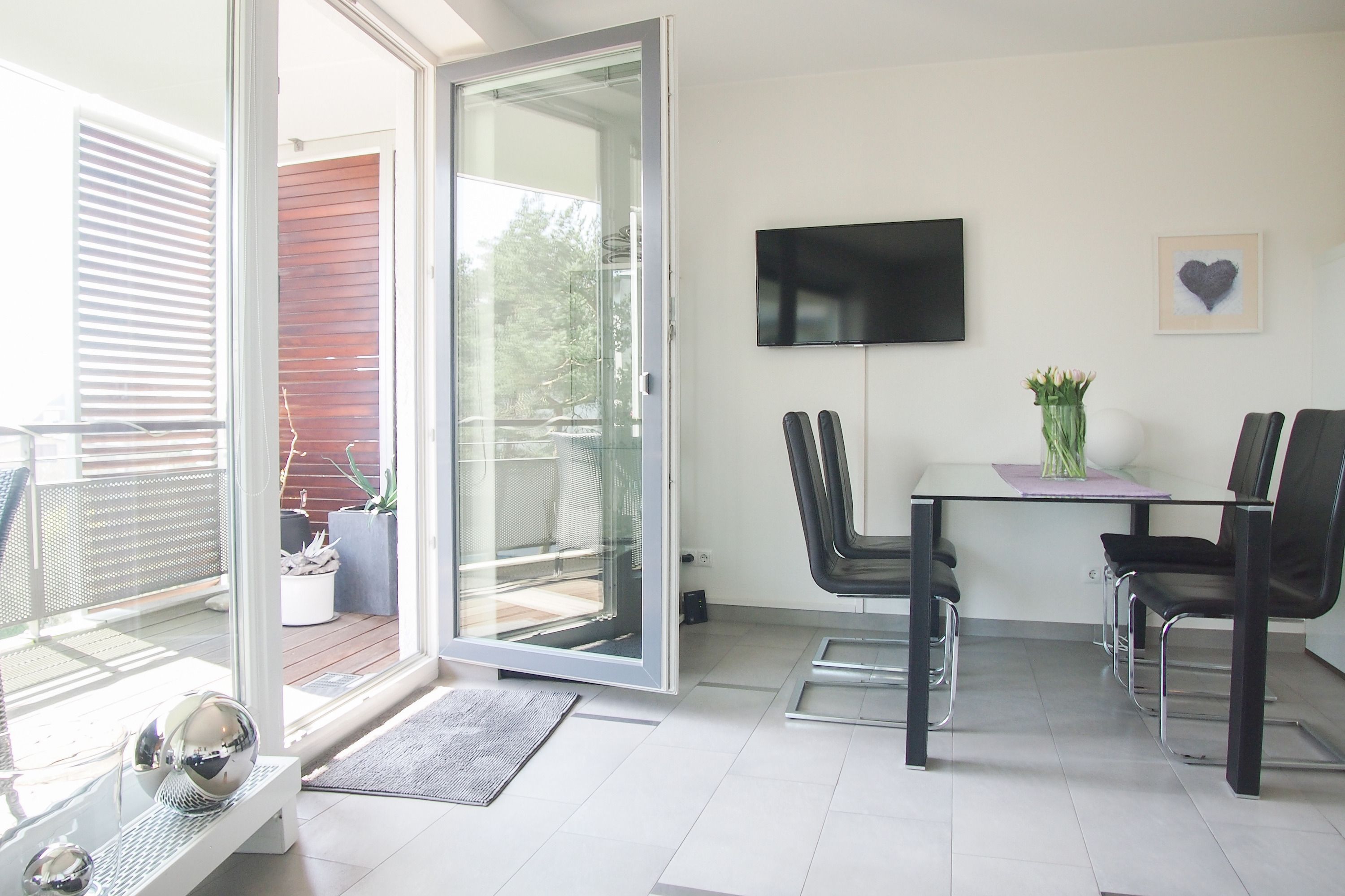 Bei der Einrichtung und Ausstattung des Objektes wurde nicht gespart und sehr viel Wert aufs Detail gelegt. Große, bodentiefe Fensterelemente in der gesamten Wohnung sorgen für helle und sonnige Wohnräume und ermöglichen einen schönen Ausblick. Es erwartet Sie ein großzügiges Schlafzimmer mit Doppelbett (180x200) und Balkonzugang, ein modernes Duschbad und ein kombinierter Wohn- Essbereich mit integrierter, komplett ausgestatteter Einbauküche (Mikrowelle, Backofen, Kochfeld und Spülmaschine). Im Wohnbereich befindet sich neben einer komfortablen Schlafcouch (160x190), ein Flat-TV, Stereo Anlage und kostenloser Internetzugang über WLAN.