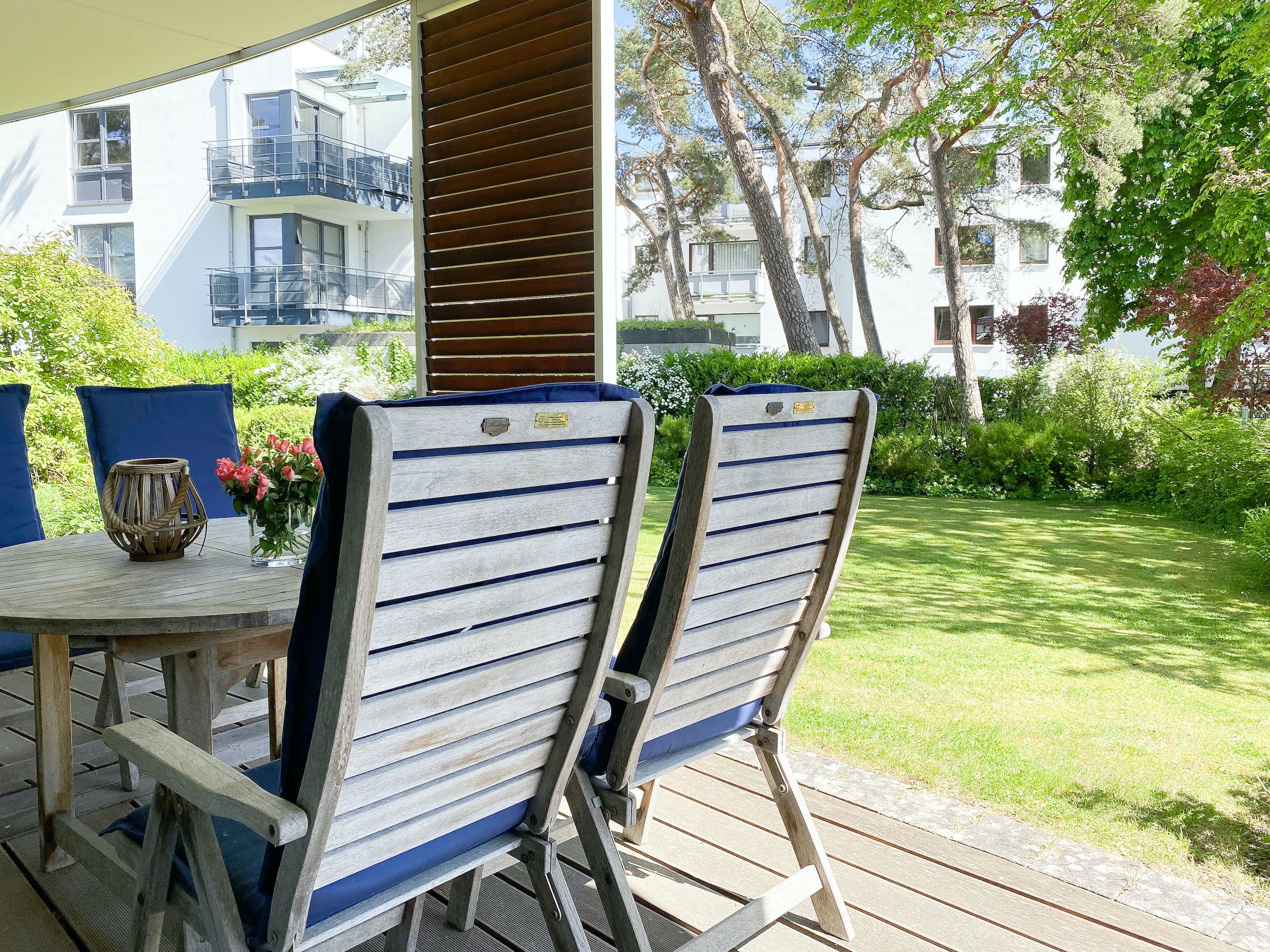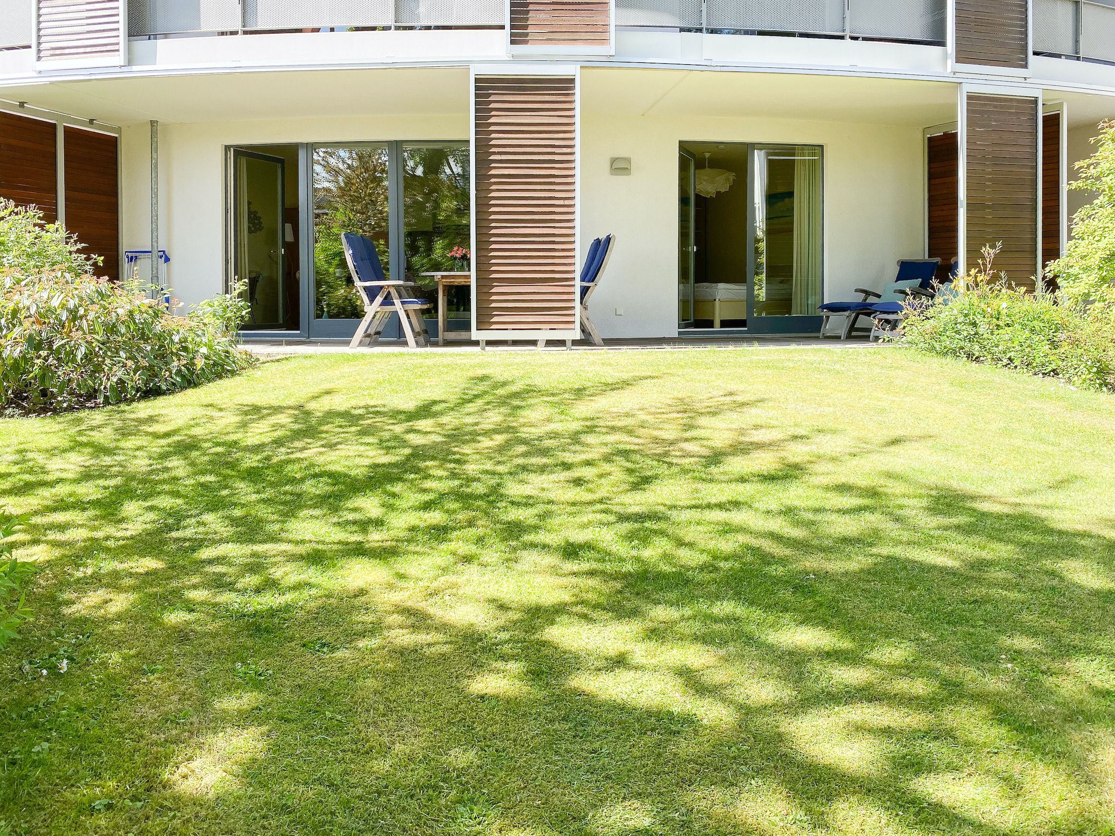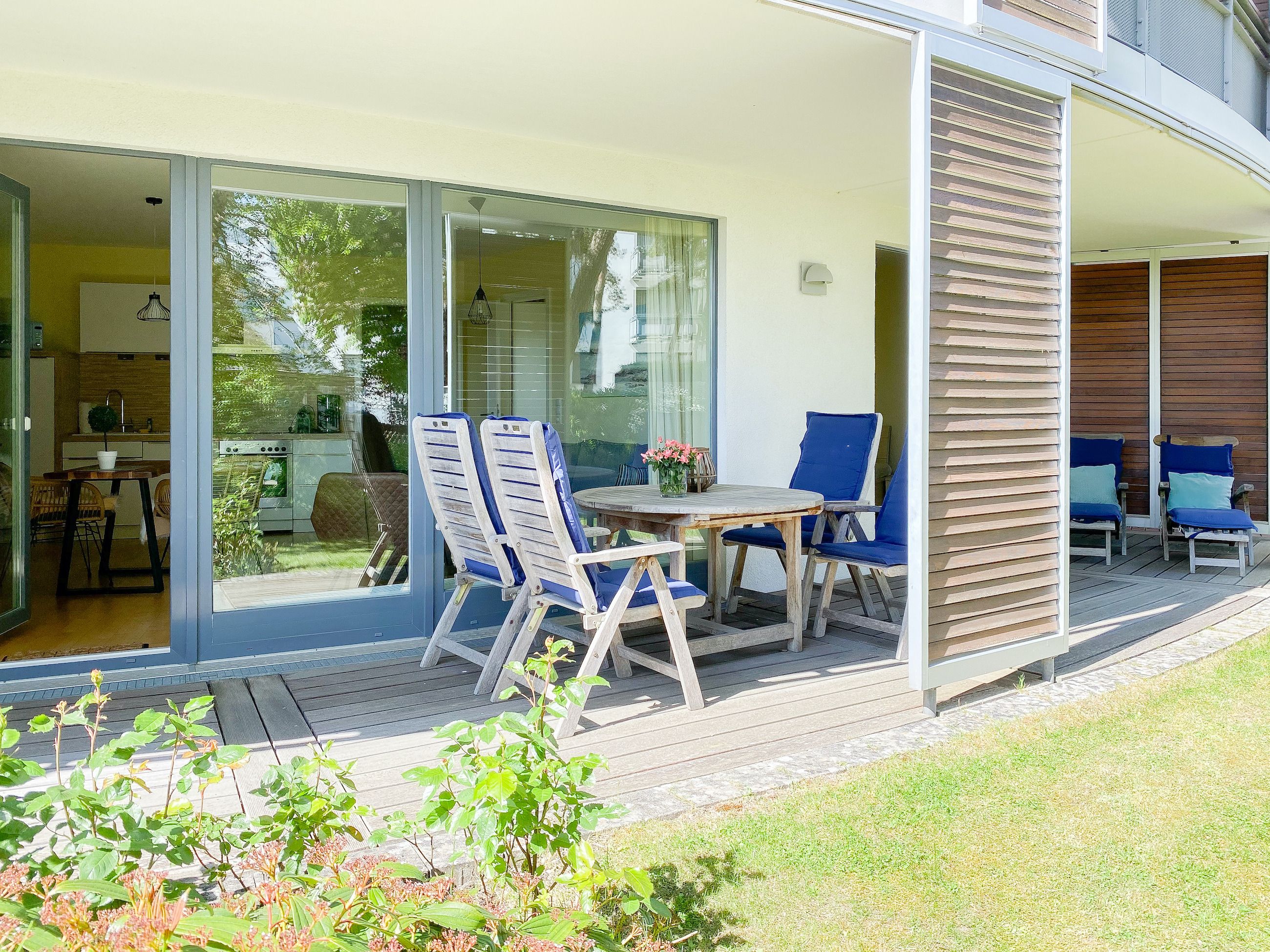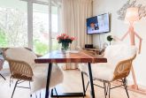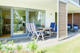 Bodentiefe Fensterflächen sorgen für helle Räumlichkeiten und die geschmackvolle Einrichtung in warmen Farben schafft eine angenehme Wohnatmosphäre. Die überdachte XXL Sonnenterrasse, die sich über die gesamte Breite der Wohnung erstreckt und mit hochwertigen Gartenmöbeln sowie Sonnenliegen ausgestattet ist, macht diese Wohnung zu etwas Besonderem. Die angrenzende Rasenfläche kann ebenfalls genutzt werden. Im Wohnbereich erwartet Sie ein hochwertiges Sofa mit Schlaffunktion, TV, Radio und WLAN sowie ein Schreibtisch zur Erledigung wichtiger Korrespondenz. Der integrierte Essbereich ist für 3 Personen eingerichtet und die offene Einbauküche ist mit Backofen, Mikrowelle und Geschirrspüler bestens ausgestattet. Das Schlafzimmer verfügt über ein Doppelbett (180x200), einen geräumigen Schrank und TV. Alle Fenster sind mit Verdunkelungsvorhängen versehen. Das moderne Duschbad ist großzügig angelegt.