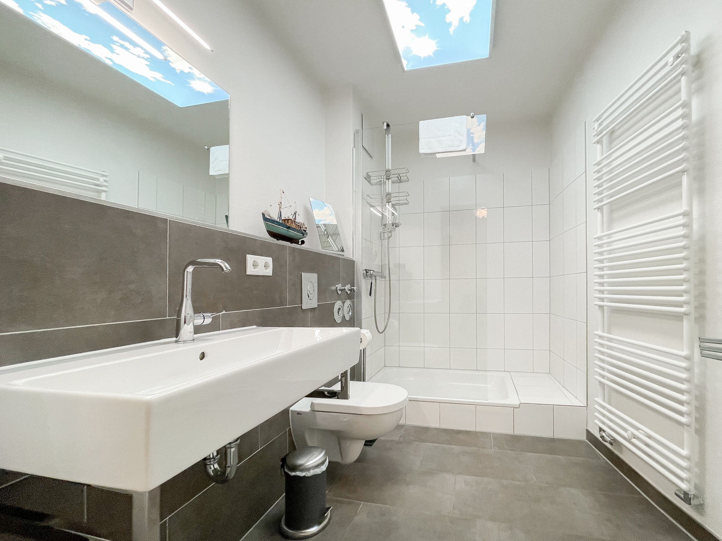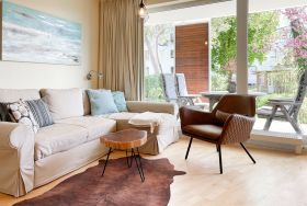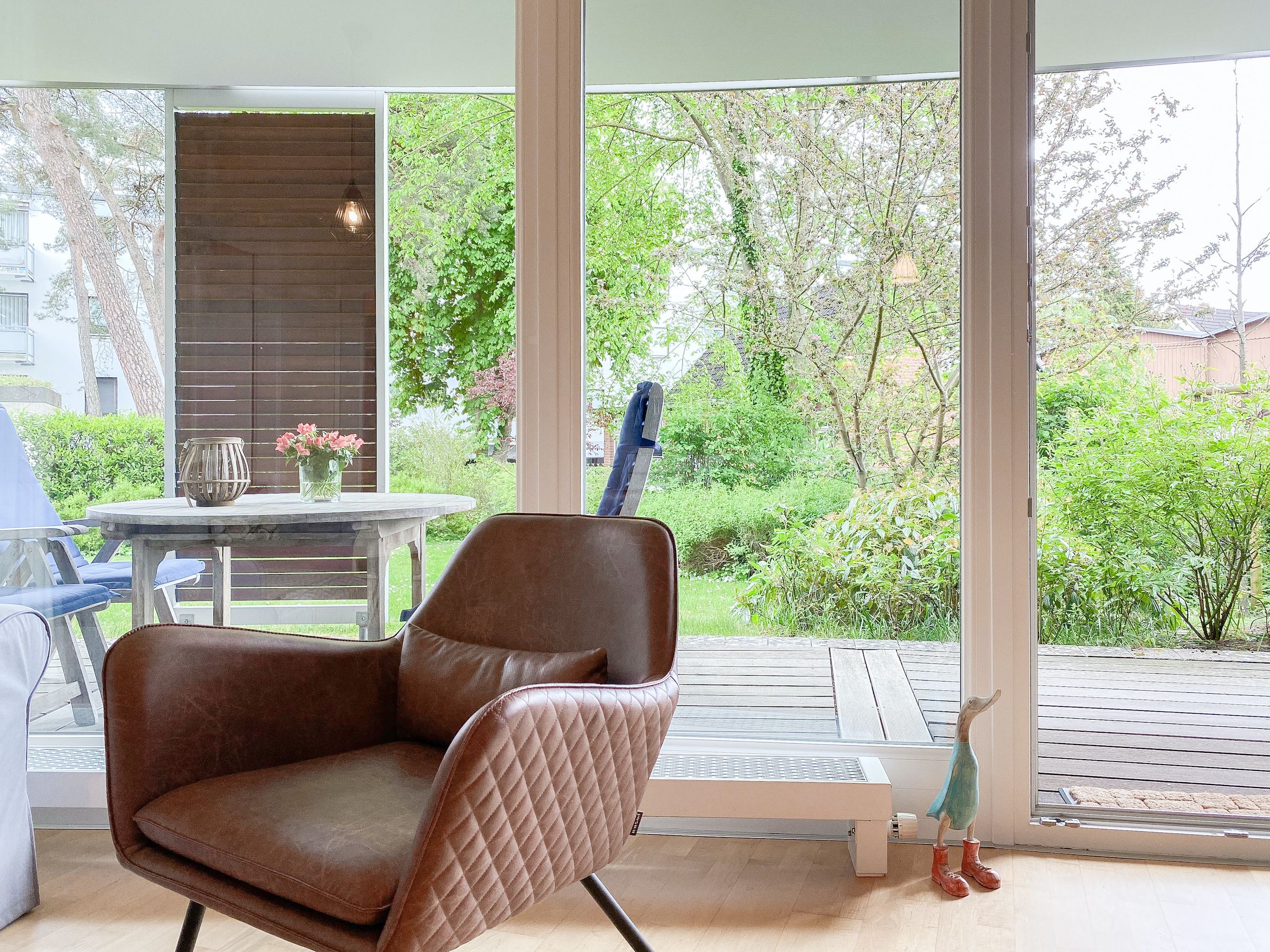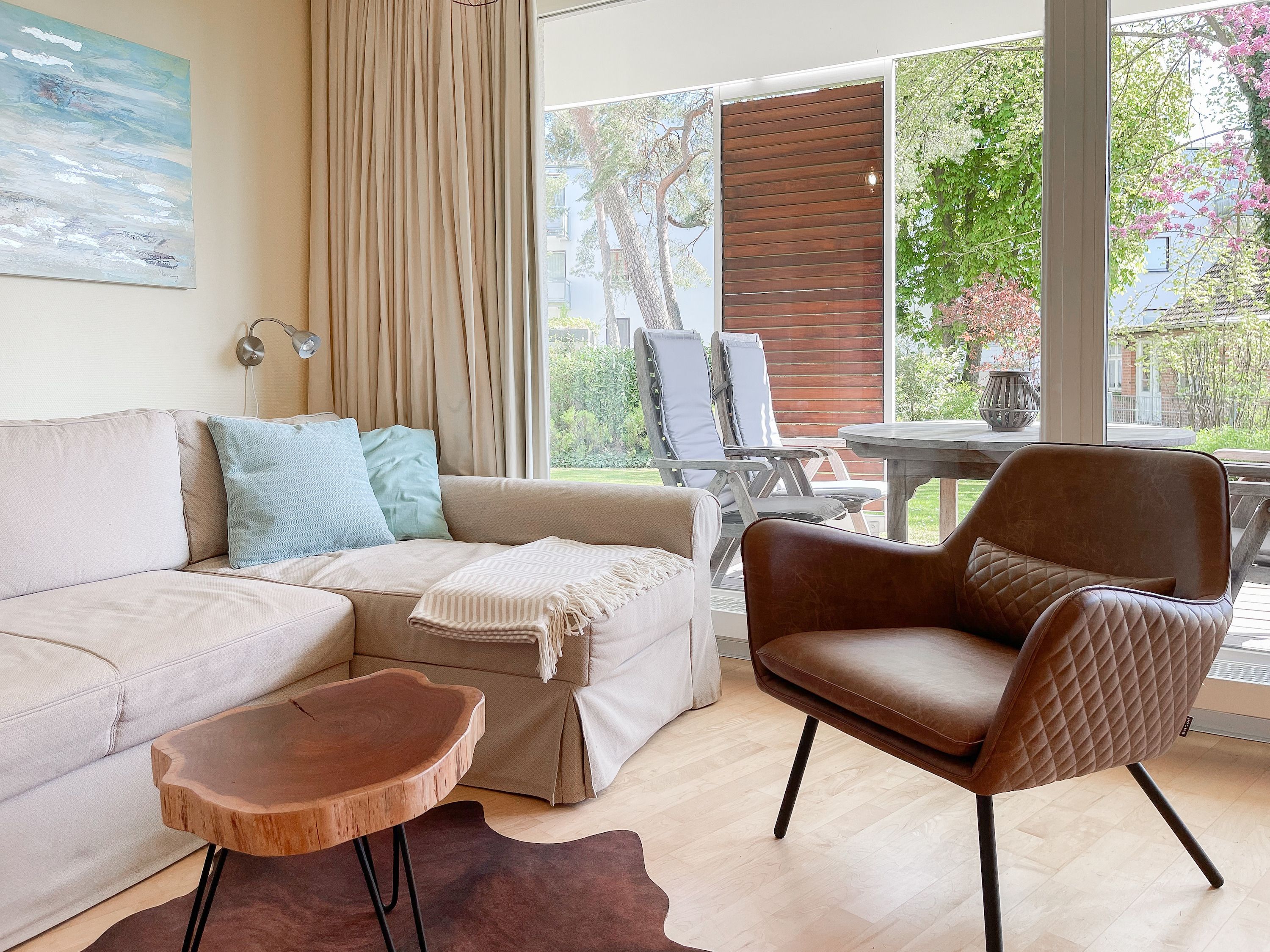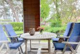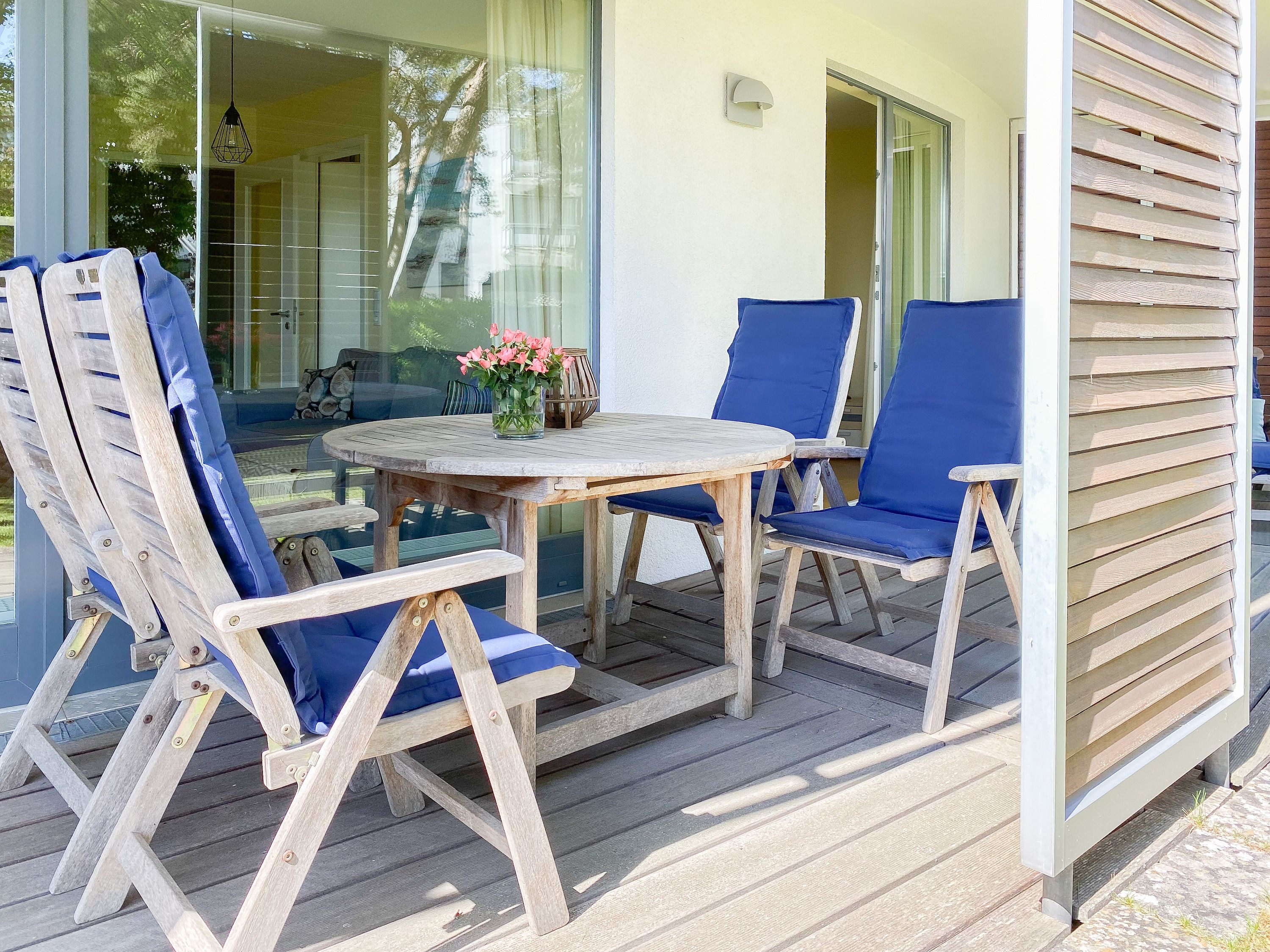 Bodentiefe Fensterflächen sorgen für helle Räumlichkeiten und die geschmackvolle Einrichtung in warmen Farben schafft eine angenehme Wohnatmosphäre. Die überdachte XXL Sonnenterrasse, die sich über die gesamte Breite der Wohnung erstreckt und mit hochwertigen Gartenmöbeln sowie Sonnenliegen ausgestattet ist, macht diese Wohnung zu etwas Besonderem. Die angrenzende Rasenfläche kann ebenfalls genutzt werden. Im Wohnbereich erwartet Sie ein hochwertiges Sofa mit Schlaffunktion, TV, Radio und WLAN sowie ein Schreibtisch zur Erledigung wichtiger Korrespondenz. Der integrierte Essbereich ist für 3 Personen eingerichtet und die offene Einbauküche ist mit Backofen, Mikrowelle und Geschirrspüler bestens ausgestattet. Das Schlafzimmer verfügt über ein Doppelbett (180x200), einen geräumigen Schrank und TV. Alle Fenster sind mit Verdunkelungsvorhängen versehen. Das moderne Duschbad ist großzügig angelegt.