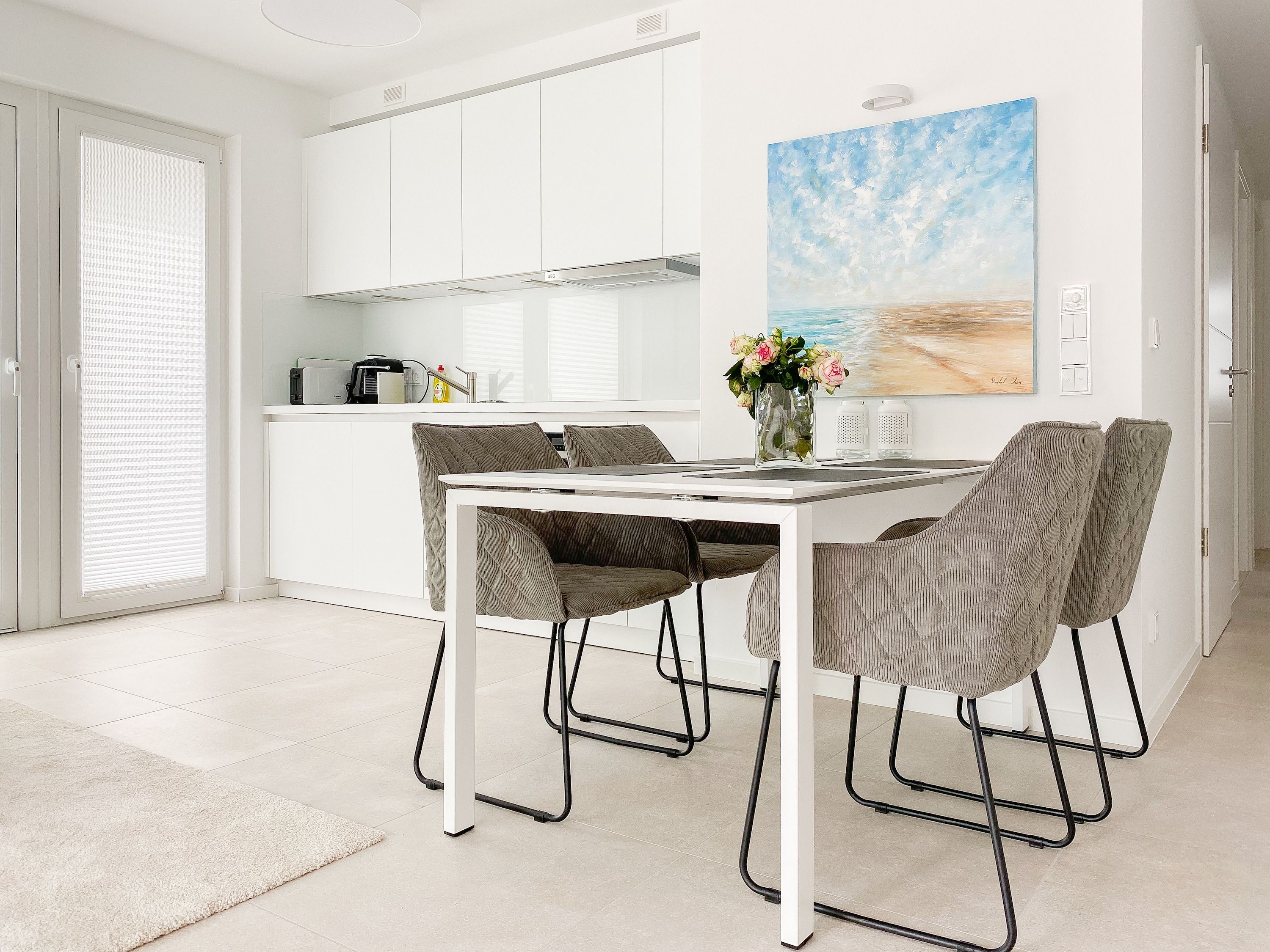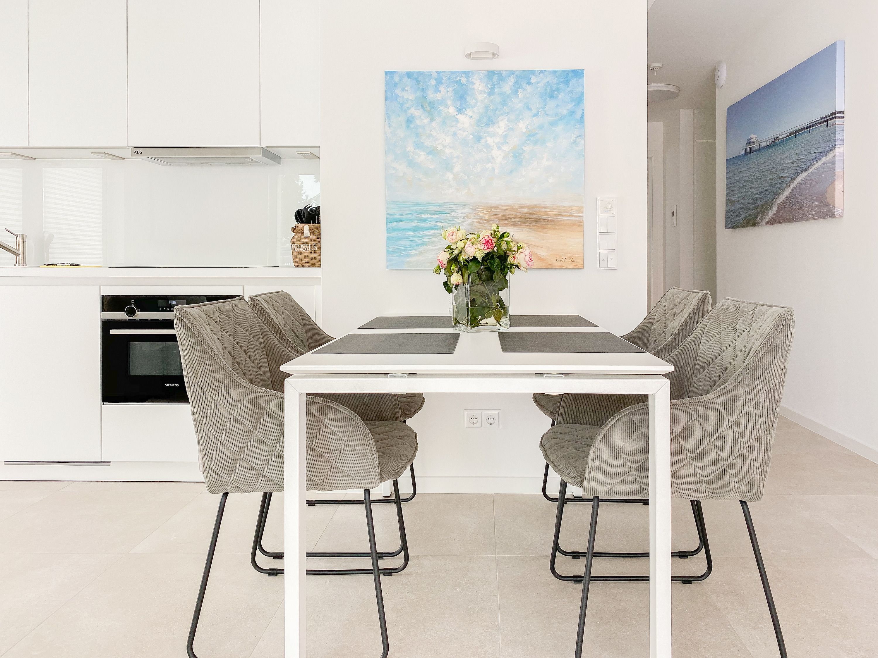 Die Ferienwohnung Wohnen am Strand 1 befindet sich im Erdgeschoss und bietet mit 2 Schlafzimmern, ausgestattet mit Boxspringbetten (180x200 und 160x200)  und TV sowie 2 Duschbädern,  jeglichen Komfort für 4 Personen, um einen entspannten Urlaub zu verleben. Der hochwertig eingerichtete Wohn- Essbereich bildet den Mittelpunkt der Wohnung. Entspannen Sie auf Ihrer überdachten Terrasse, Brandungsrauschen und frische Ostseeluft inklusive. Es stehen insgesamt 3 TV, Radio und WLAN zur Verfügung. Die Wohnung ist mit Fußbodenheizung ausgestattet und alle Fenster sind mit elektrischen Außenjalousien versehen, die gleichermaßen für Verdunkelung oder Tageslicht mit Privatsphäre sorgen. Zur Wohnung 1 gehört ein fester Außenstellplatz. Das Haus verfügt über einen Fahrstuhl und einen Fahrradkeller. Waschmaschine und Trockner stehen kostenlos zur gemeinschaftlichen Nutzung  zur Verfügung.