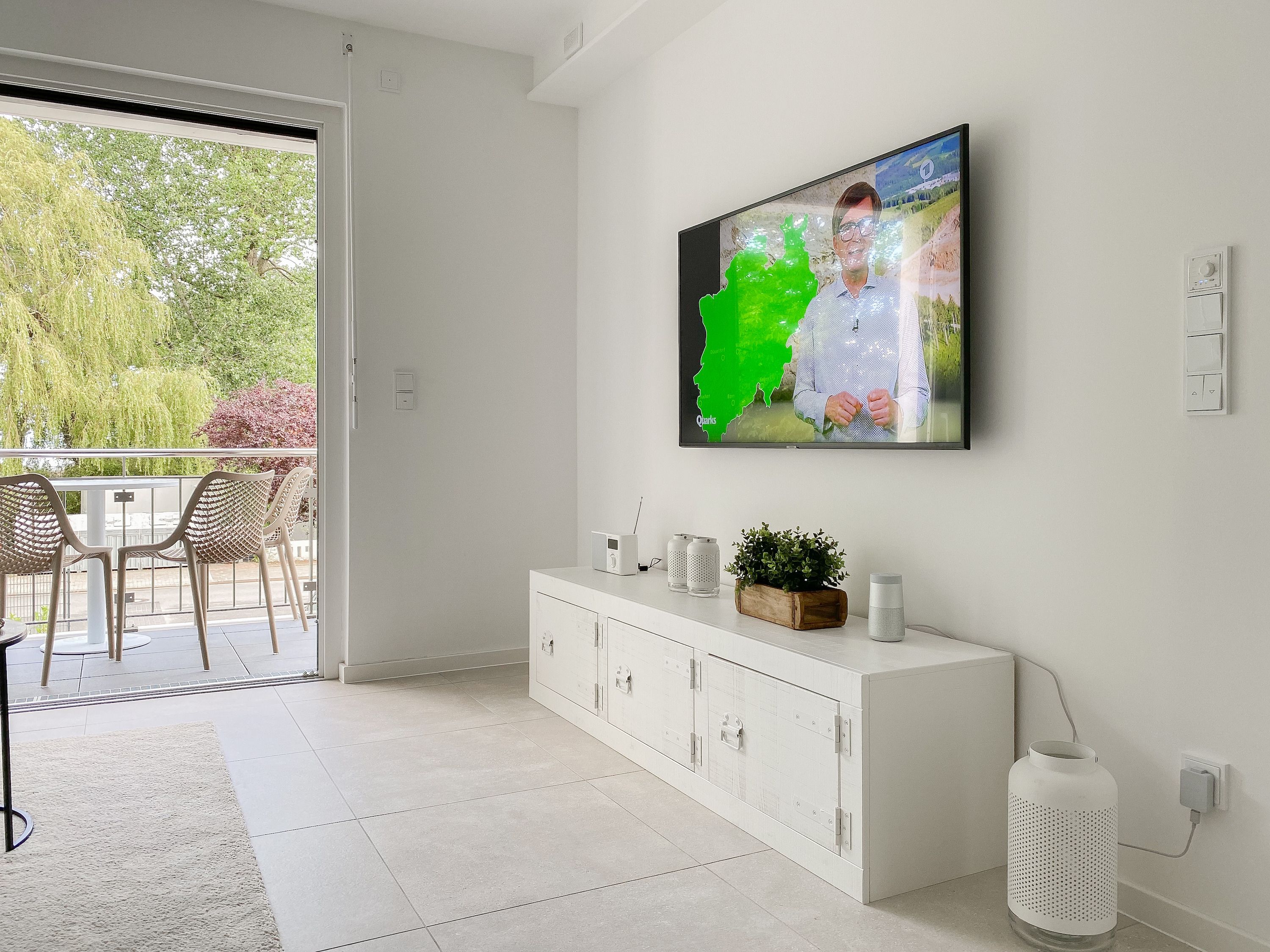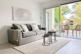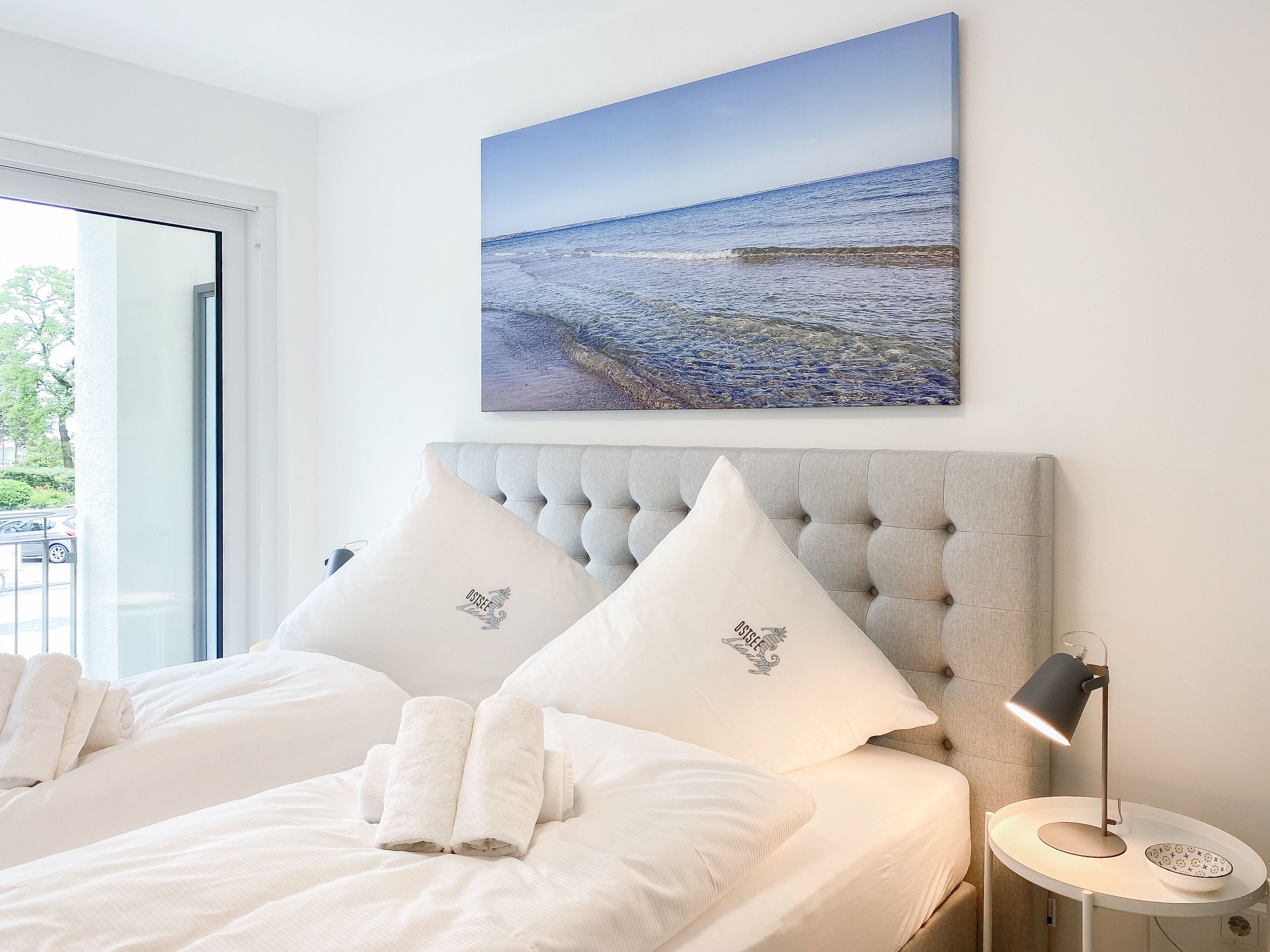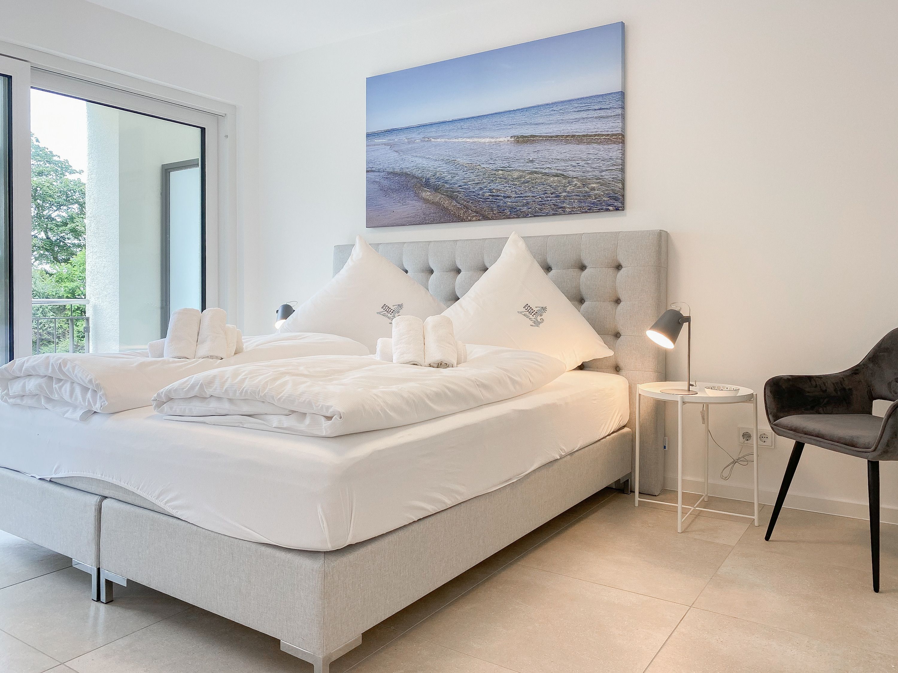 Die Ferienwohnung Wohnen am Strand 5 befindet sich im ersten Obergeschoss und bietet mit einem Schlafzimmer, ausgestattet mit einem Boxspringbett (180x200 ) und TV sowie einem bequemen Schlafsofa im Wohnbereich (140x185), jeglichen Komfort für 3 bis 4 Personen, um einen entspannten Urlaub zu verleben. Der hochwertig eingerichtete Wohn- Essbereich bietet einen herrlichen Ausblick bis auf die Ostsee. Entspannen Sie auf Ihrem Balkon, der sich über die gesamte Breite der Wohnung erstreckt, Teilmeerblick, Brandungsrauschen und frische Ostseeluft inklusive. Es stehen insgesamt 2 TV, Radio und WLAN zur Verfügung. Die Wohnung ist mit Fußbodenheizung ausgestattet und alle Fenster sind mit elektrischen Außenjalousien versehen, die gleichermaßen für Verdunkelung oder Tageslicht mit Privatsphäre sorgen. Zur Wohnung gehört ein fester Tiefgaragenstellplatz (Einfahrtshöhe 1,90 m). Das Haus verfügt über einen Fahrstuhl und einen Fahrradkeller. Waschmaschine und Trockner stehen kostenlos zur gemeinschaftlichen Nutzung zur Verfügung.