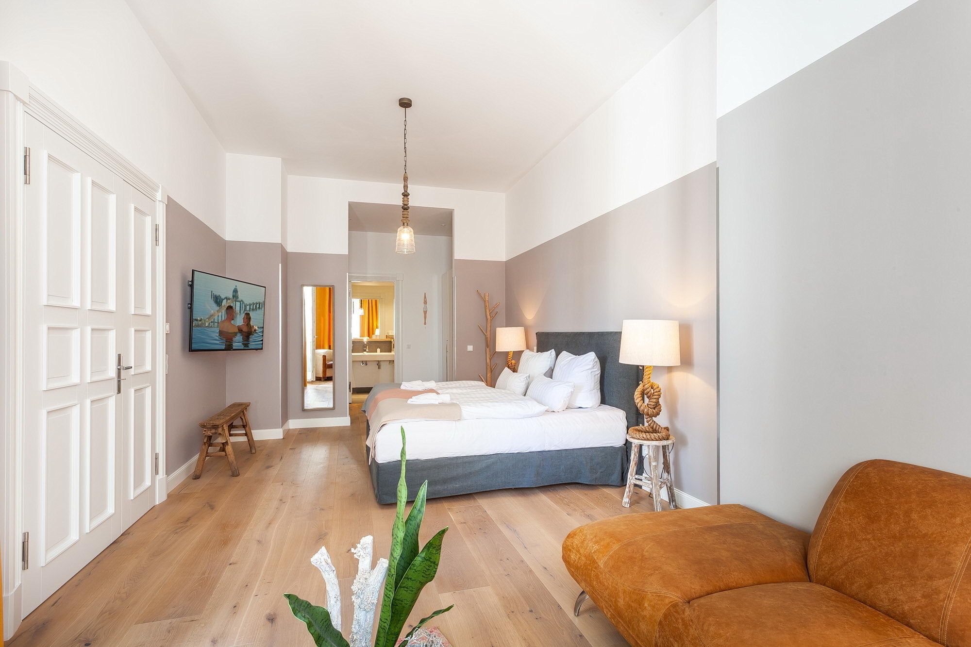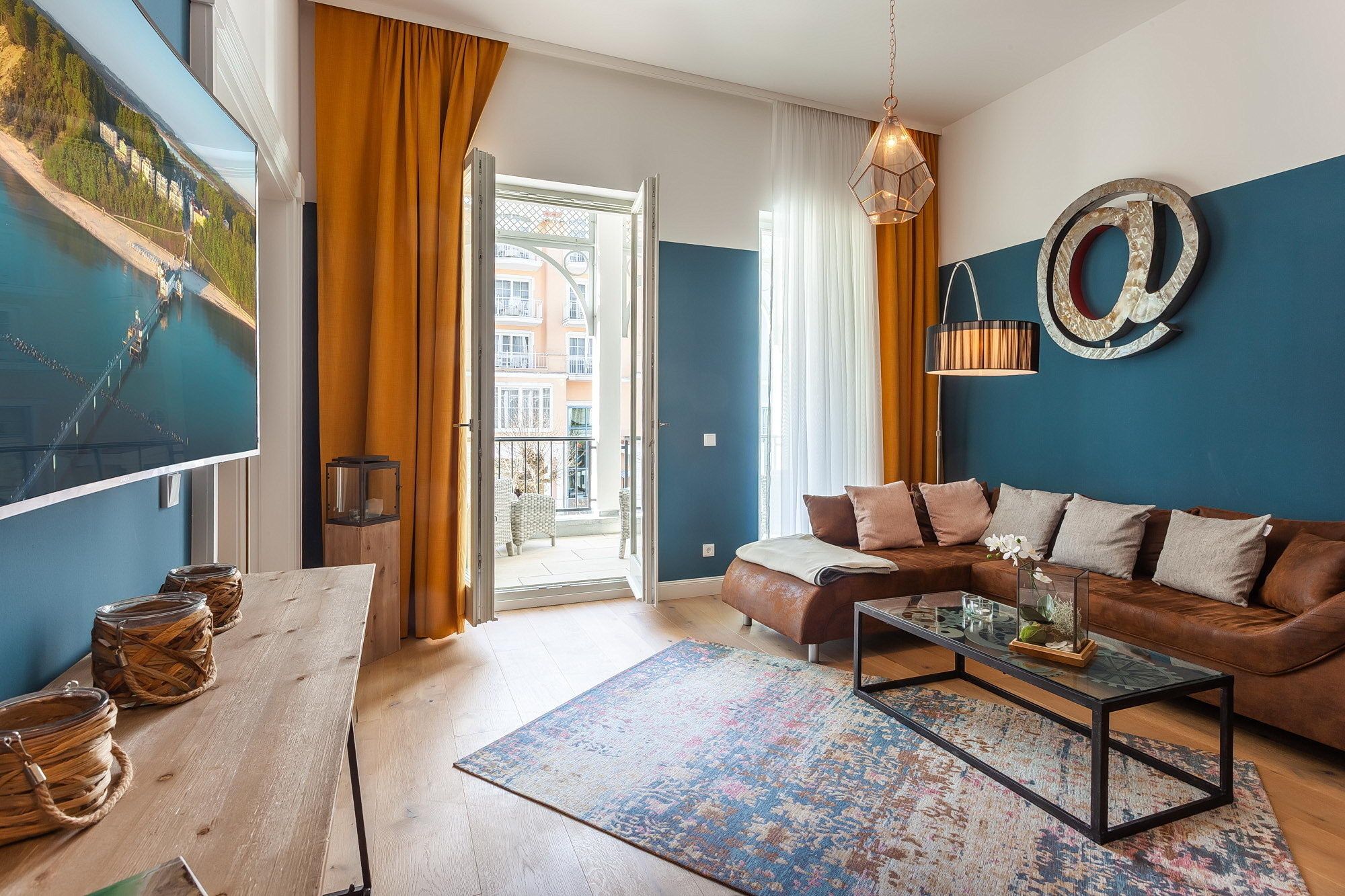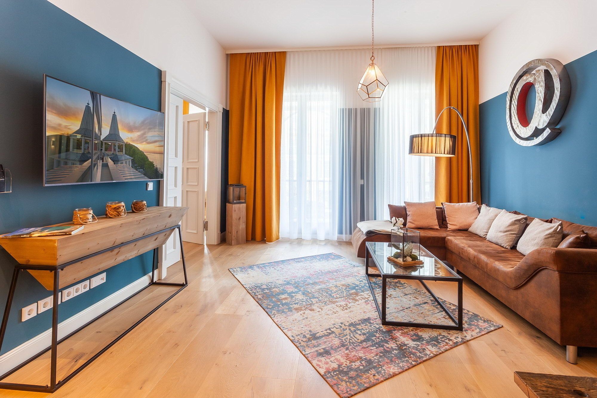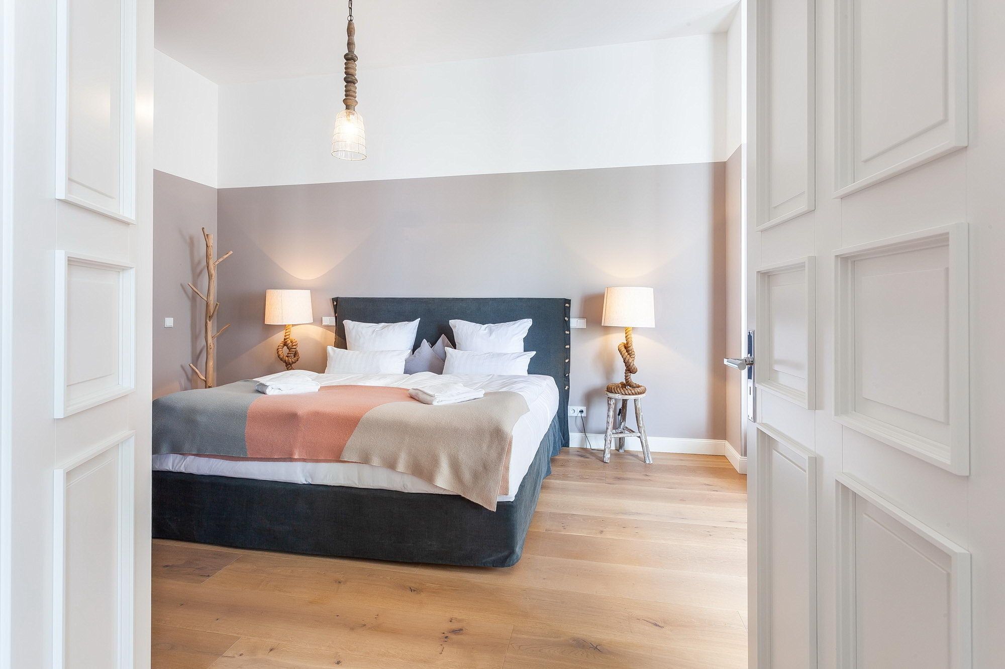 Die Ferienwohnung [at] HOME verspricht viel. Es lädt durch seine überdachte Loggia, bequemen Gartenmöbel und einem traumhaften seitlichen Meerblick zum Verweilen ein. Das 90 qm große Appartement überzeugt durch den offenen Wohnbereich und eine hochwertige Einbauküche. Das Schlafzimmer lädt mit seinem 180x200 cm großen Boxspringbett zum Träumen ein. Hier besteht die Möglichkeit einer Aufbettung zur dritten Person durch ein separates Boxbett (90x200 cm). Selbstverständlich lässt das angrenzende Badezimmer mit bodentiefer Dusche und Badewanne keine Wünsche offen.