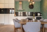 Absoluter Mittelpunkt Ihrer exklusiven Ferienwohnung ist der Wohn- und Essbereich mit seinen großen Fensterfronten und dem bequemen Doppelsofa. Hochwertige Möbel verleihen der gesamten Wohnung einen exklusiven Charme. Die große und offen gestaltete Küche lädt zum gemeinsamen kochen mit der ganzen Familie ein.