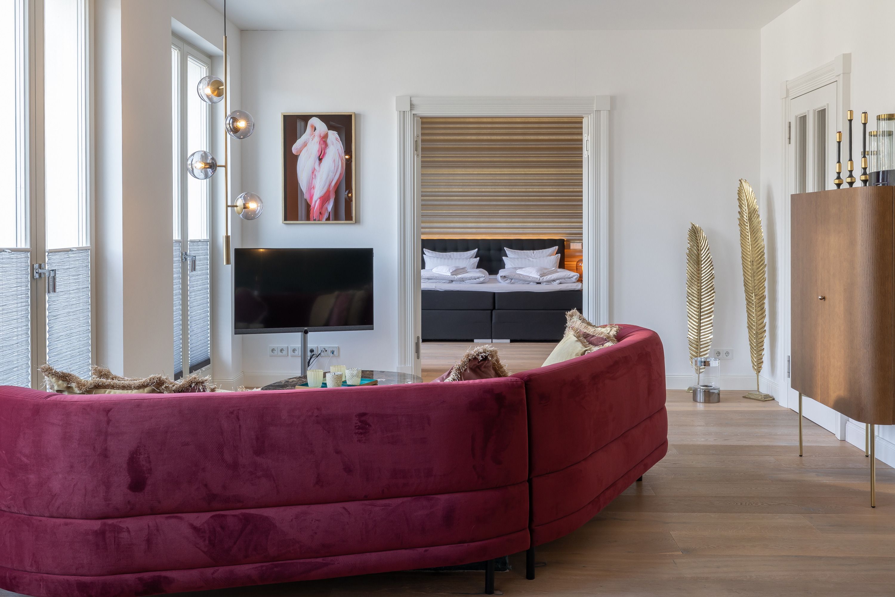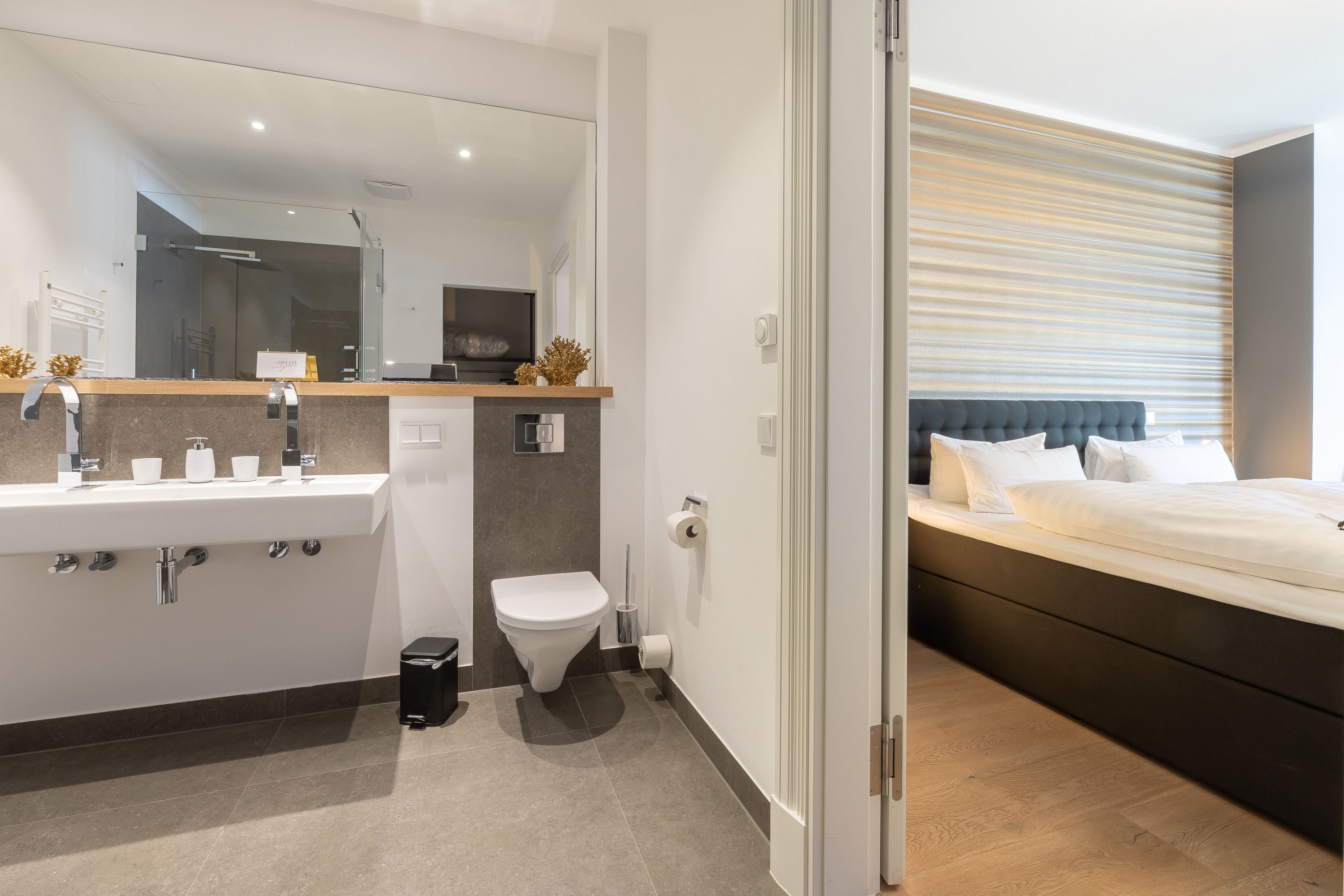 Zwei Schlafzimmer mit standesgemäßen Boxspringbetten in 180x200cm, großem Ankleideraum und LOEWE-Fernsehern bieten Ihnen den notwendigen Rückzugsraum. Von beiden Schlafzimmern aus lässt sich der riesige Balkon der Wohnung betreten, welcher neben dem fantastischen Meerblick auch einen Blick auf das bunte Treiben der berühmten Wilhelmstraße zulässt. Selbstverständlich lassen auch die beiden elegant gefliesten Badezimmer mit bodentiefer Dusche bzw. Badewanne, großzügigen Waschtischen, Kosmetikspiegel und Handtuchwärmer keine Wünsche offen.