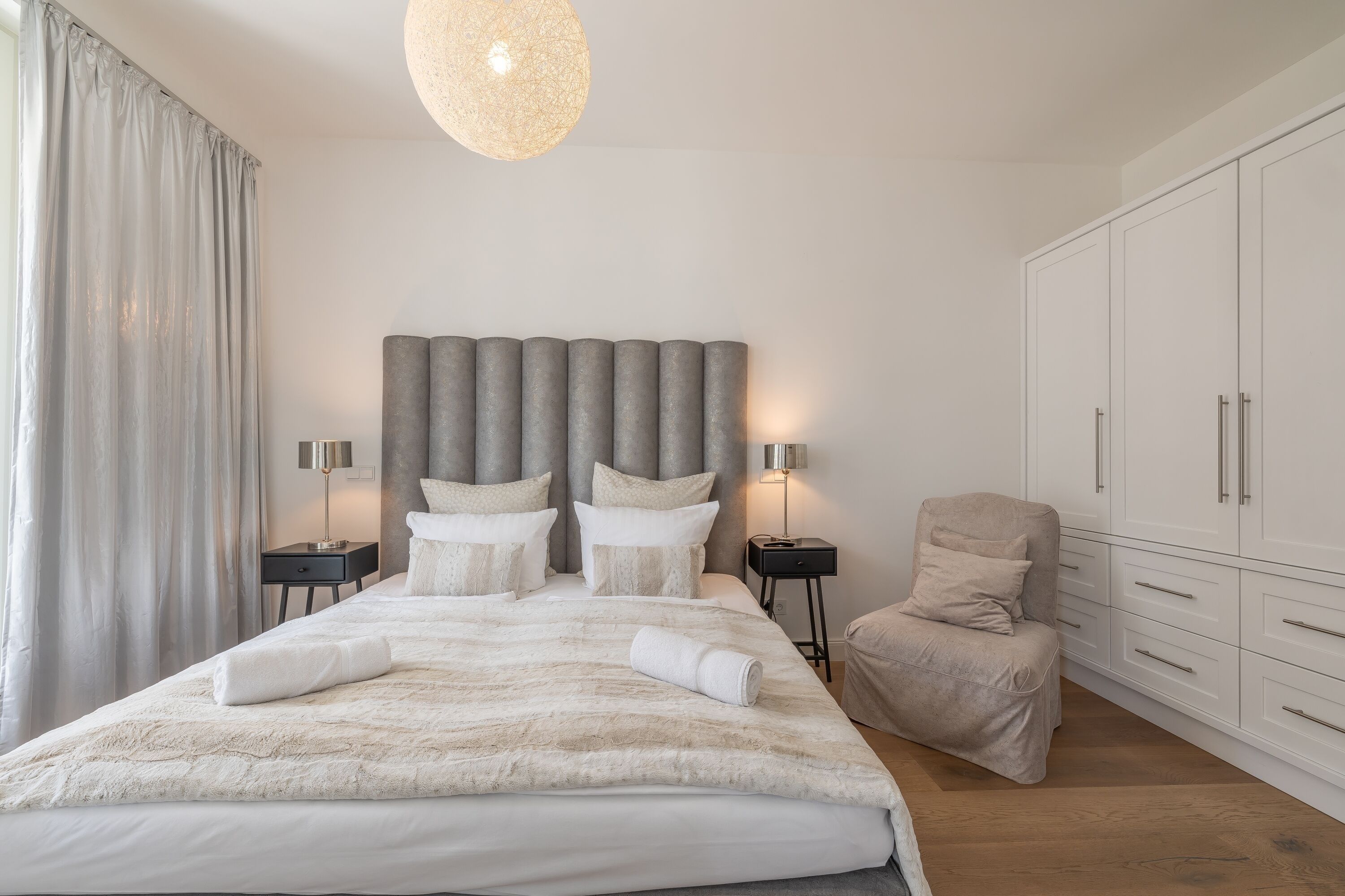 Das Schlafzimmer mit einem Boxspringbett (180x200) bietet Ihnen genügend Schlafkomfort und Stauraum. Sie haben auch die Möglichkeit die große Doppeltür zum Wohnzimmer zu öffnen um ein völlig anderes Raumerlebnis zu erfahren.