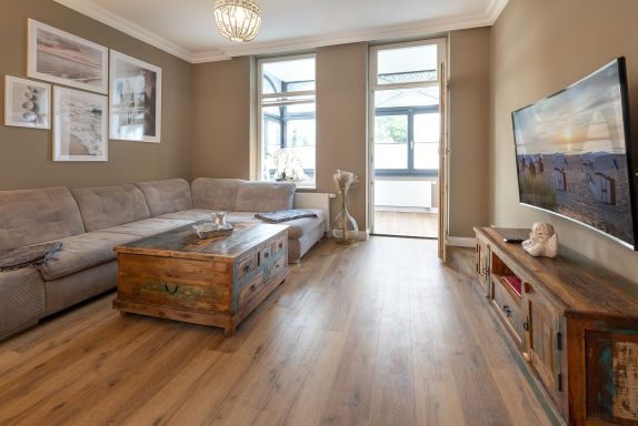 Die Ferienwohnung Storchennest befindet sich in Hochparterre und bietet Ihnen einen unvergleichbaren Blick auf die Wilhelmstrasse. Es erwartet Sie auf rund 73 qm Wohnfläche eine gemütliche Unterkunft für bis zu sechs Personen und einem Kleinkind bis 2 Jahre im Kinder-/Reisebett (in der der Ferienwohnung vorhanden). Die Einrichtung im Wohnzimmer überzeugt durch extravagante Möbel der Firma »Riverboat«. Zum Verweilen lädt die gemütliche Wohnlandschaft, die sich bei Bedarf in ein 160x200 cm großes Bett verwandeln lässt, ein. Ein großer Flachbild-TV sorgt für Unterhaltung in den Abendstunden.