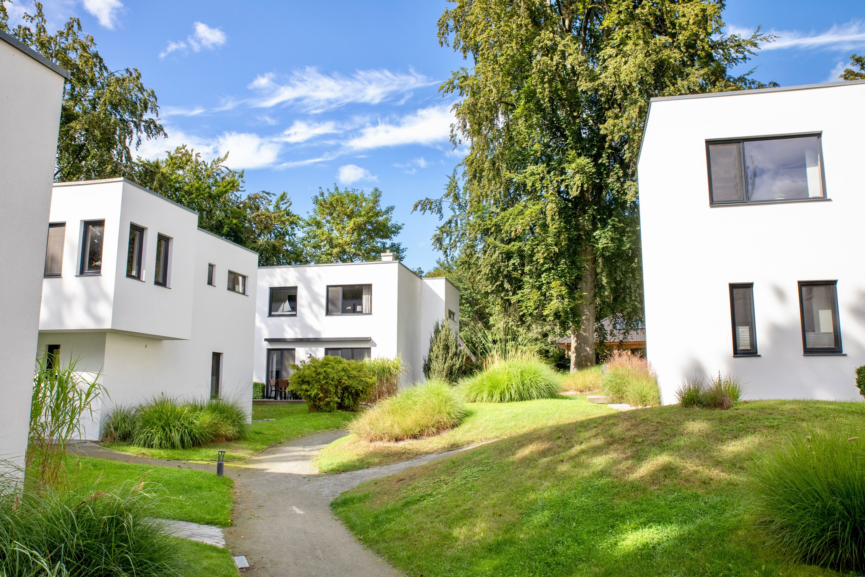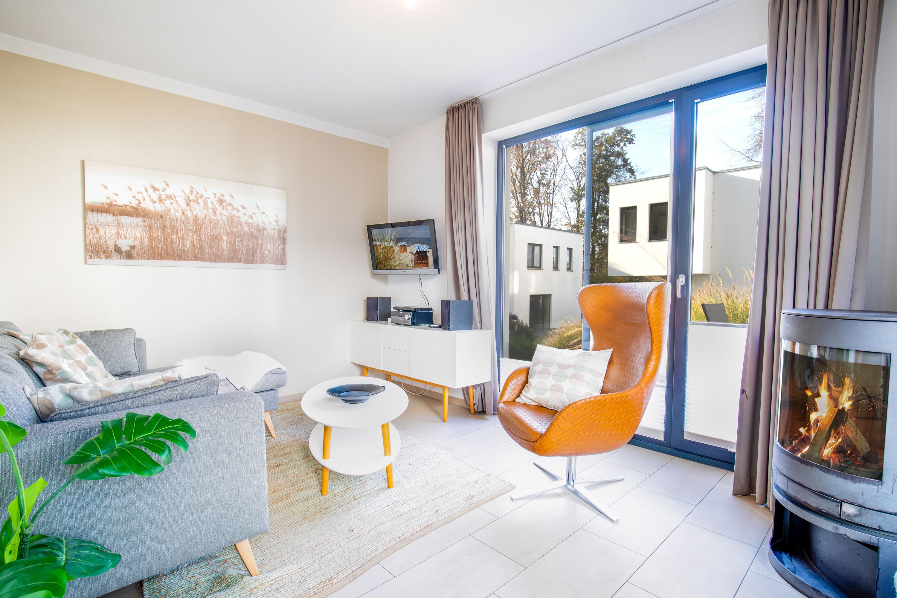Hinter seiner bauhaustypischen Fassade verfügt Ihr Urlaubsdomizil über zwei Schlafzimmer mit bequemen Doppelbetten, großen Kleiderschränken und Flachbild-TV, zwei Bäder, eine Finnische Sauna, ein geräumiges Wohnzimmer mit Kaminofen, Schlafcouch, Flatscreen-TV sowie voll ausgestatteter Wohnküche mit Essbereich und einer großen Außenterrasse. Auf der Terrasse stehen Ihnen in der warmen Jahreszeit bequeme Sitzmöbel und ein Grill zur Verfügung, so dass man die Sommerabende bei Leckereien vom Grill wunderbar ausklingen lassen kann.