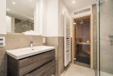 Modernes Bad mit ebenerdiger Dusche und Zugang zur privaten Sauna