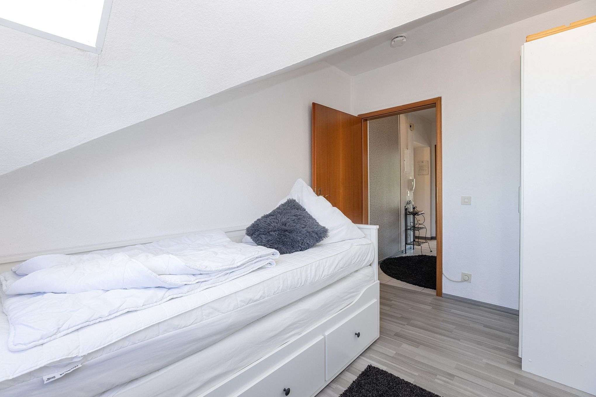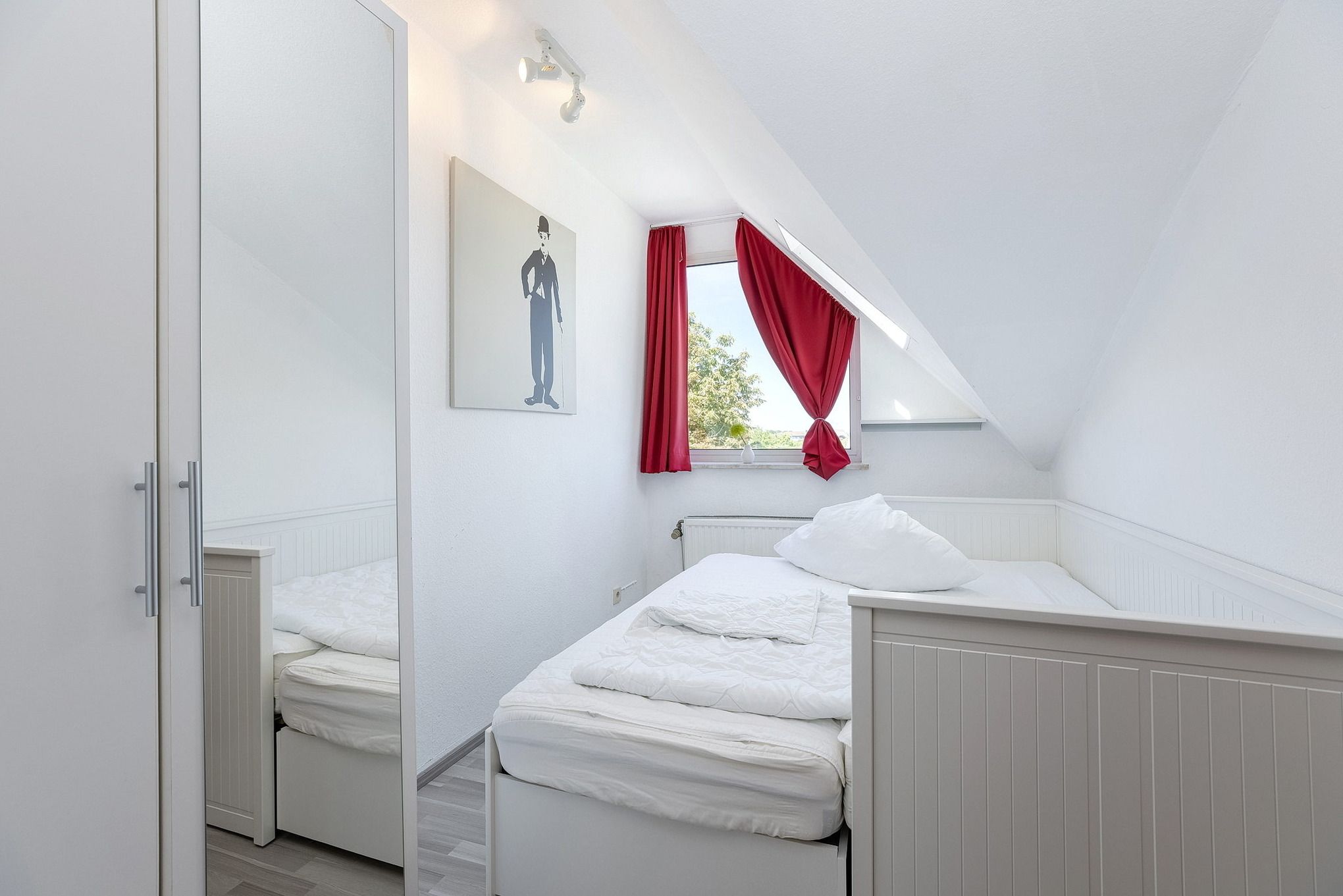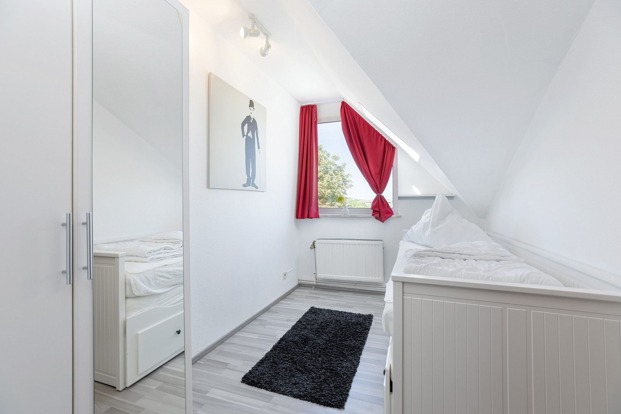 Das Kinderzimmer ist mit einem ausziehbaren Doppelbett (je 90 x 200 cm) und einem kleinen Kleiderschrank ausgestattet. Das Kinderzimmer ist mit Laminatboden ausgelegt. Die Fenster lassen sich durch eine Blickdichte Gardine bzw. das Dachfenster durch ein Rollo verdunkeln.