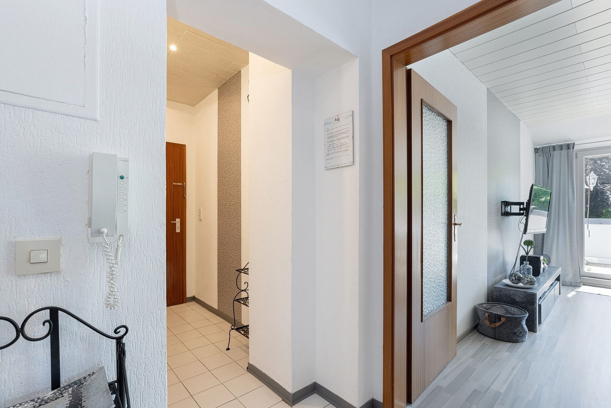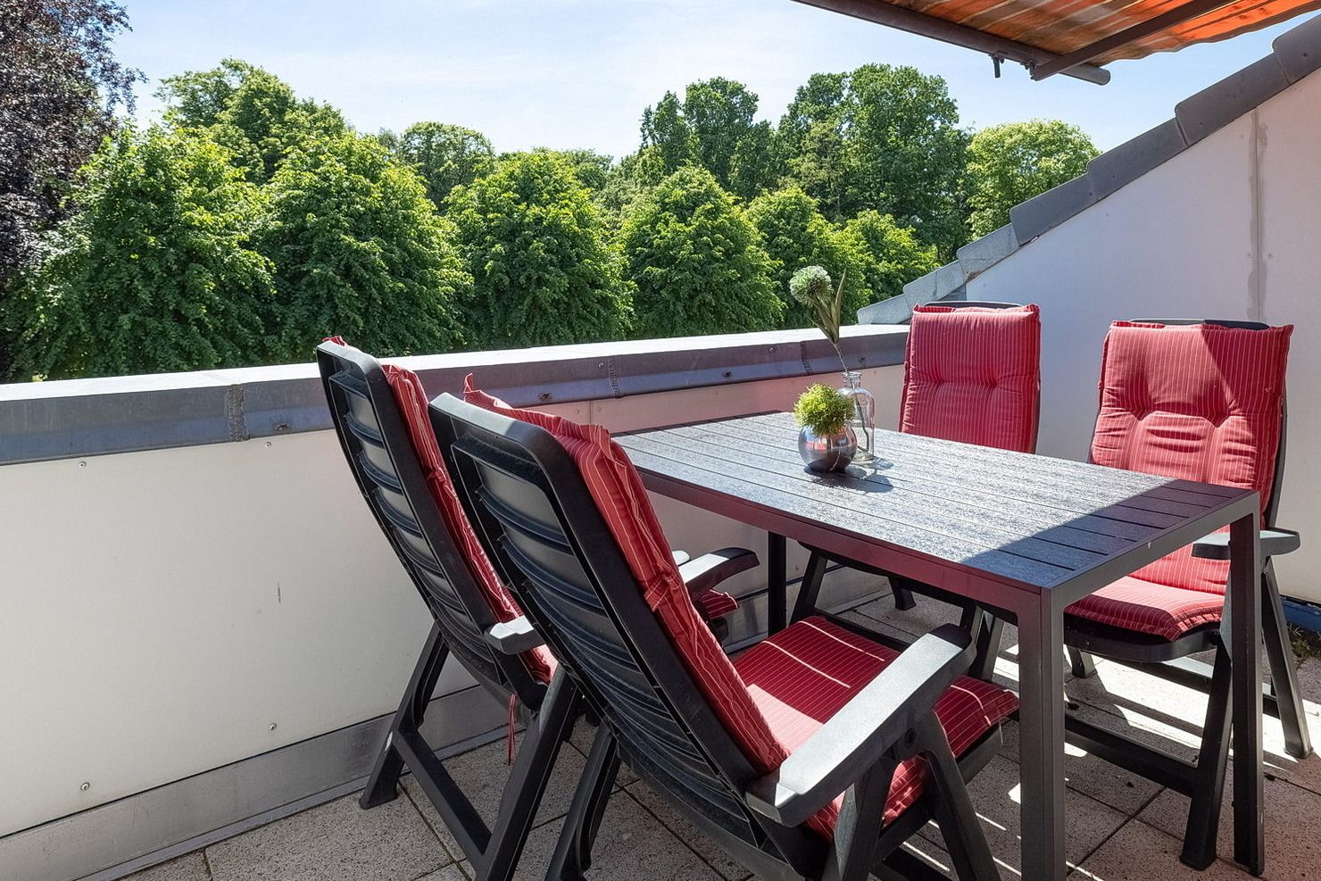 Balkon in südliche Richtung mit Markise, PKW-Abstellplatz in einer Gemeinschaftsgarage (Breite: 2,85 m Höhe 2,16 m). Reisekinderbett und Hochstuhl stehen Ihnen kostenlos zur Verfügung. Fahrradkeller ist über 12 Stufen zu erreichen.