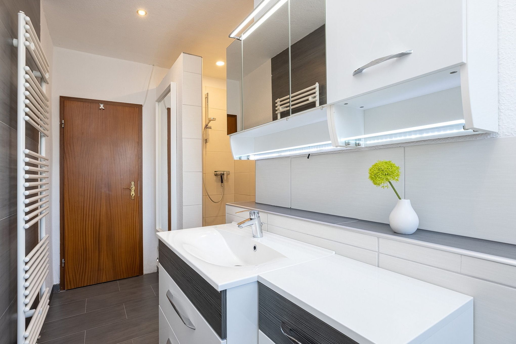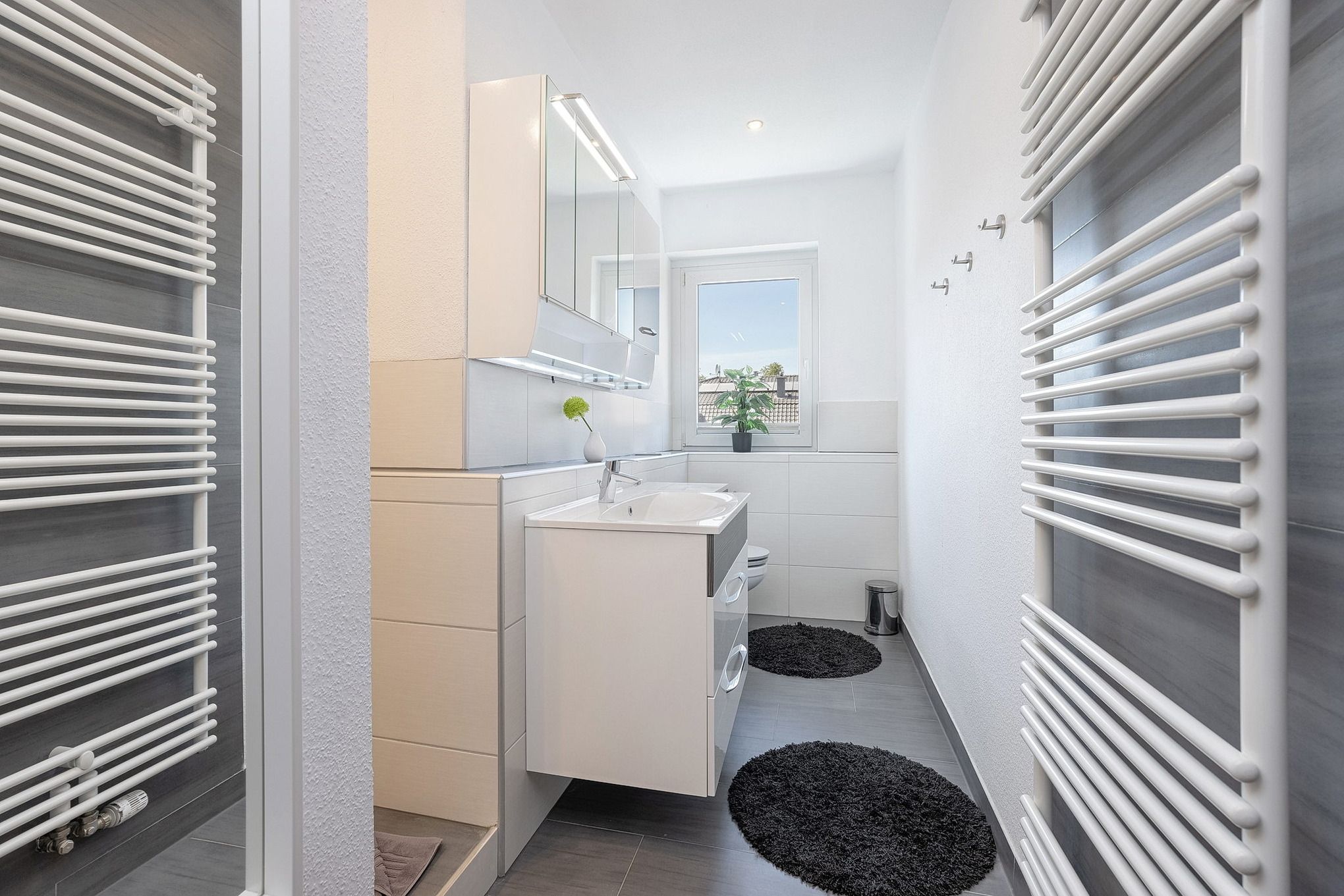 Modernes, geräumiges, freundliches Tageslichtbad mit WC, Waschbecken und Dusche.