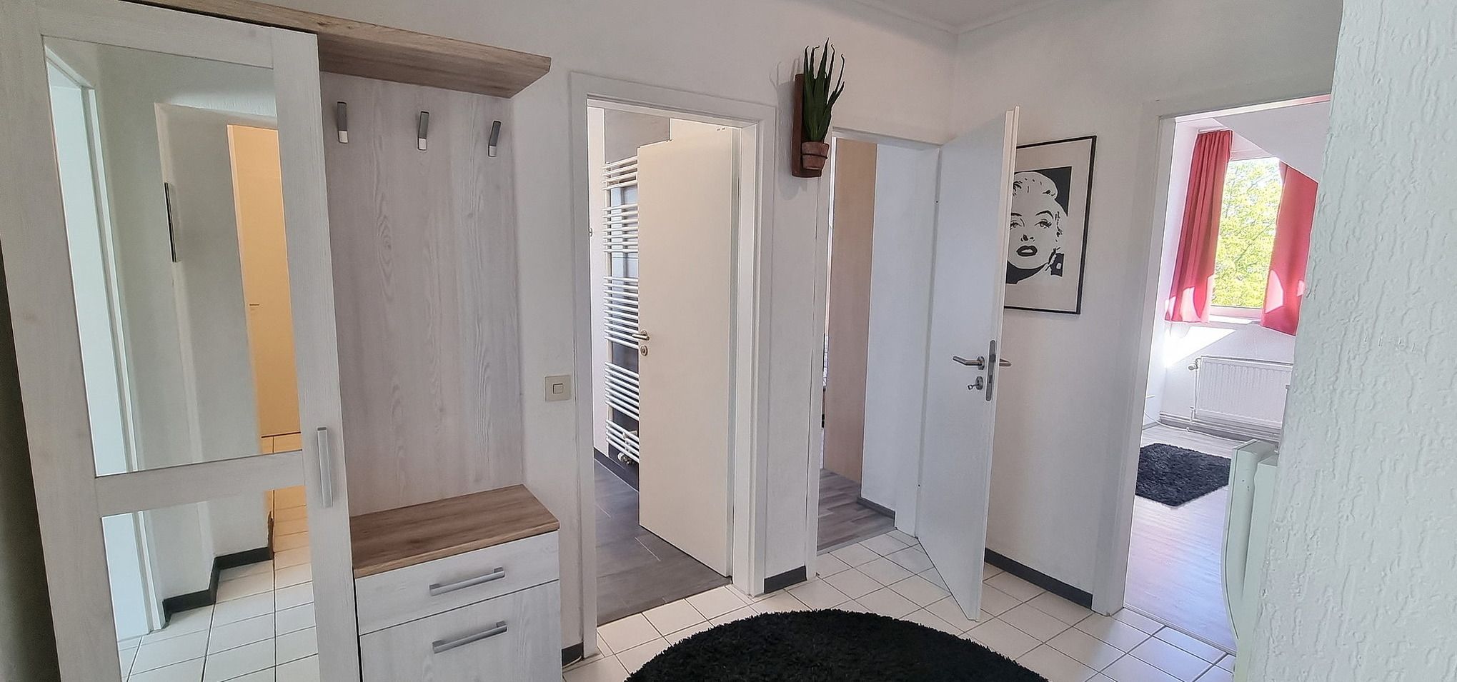 Das moderne, freundliche Schlafzimmer ist mit einem Doppelbett (180 x 200 cm), einem großen Kleiderschrank mit Spiegel ausgestattet. Das Schlafzimmer ist mit Laminatboden ausgelegt. Das Fenster lässt sich durch Blickdichte Gardinen verdunkeln.