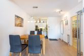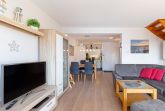 Geräumiges, modern eingerichtetes, offenes Wohn- und Esszimmer mit direktem Zugang zum sonnigen, überdachten Balkon. Das Wohn- und Esszimmer ist mit einem Essplatz für 4 Personen, einer Eckcouch, einem Couchtisch, einem Sessel und einem Wohnzimmerschrank ausgestattet. Zur Unterhaltung steht ein 43-Zoll-Smart-TV, BluRay-Player und eine Stereoanlage mit CD-Player zur Verfügung. Das Zimmer ist mit hochwertigen Laminat-Breitdielen ausgelegt.