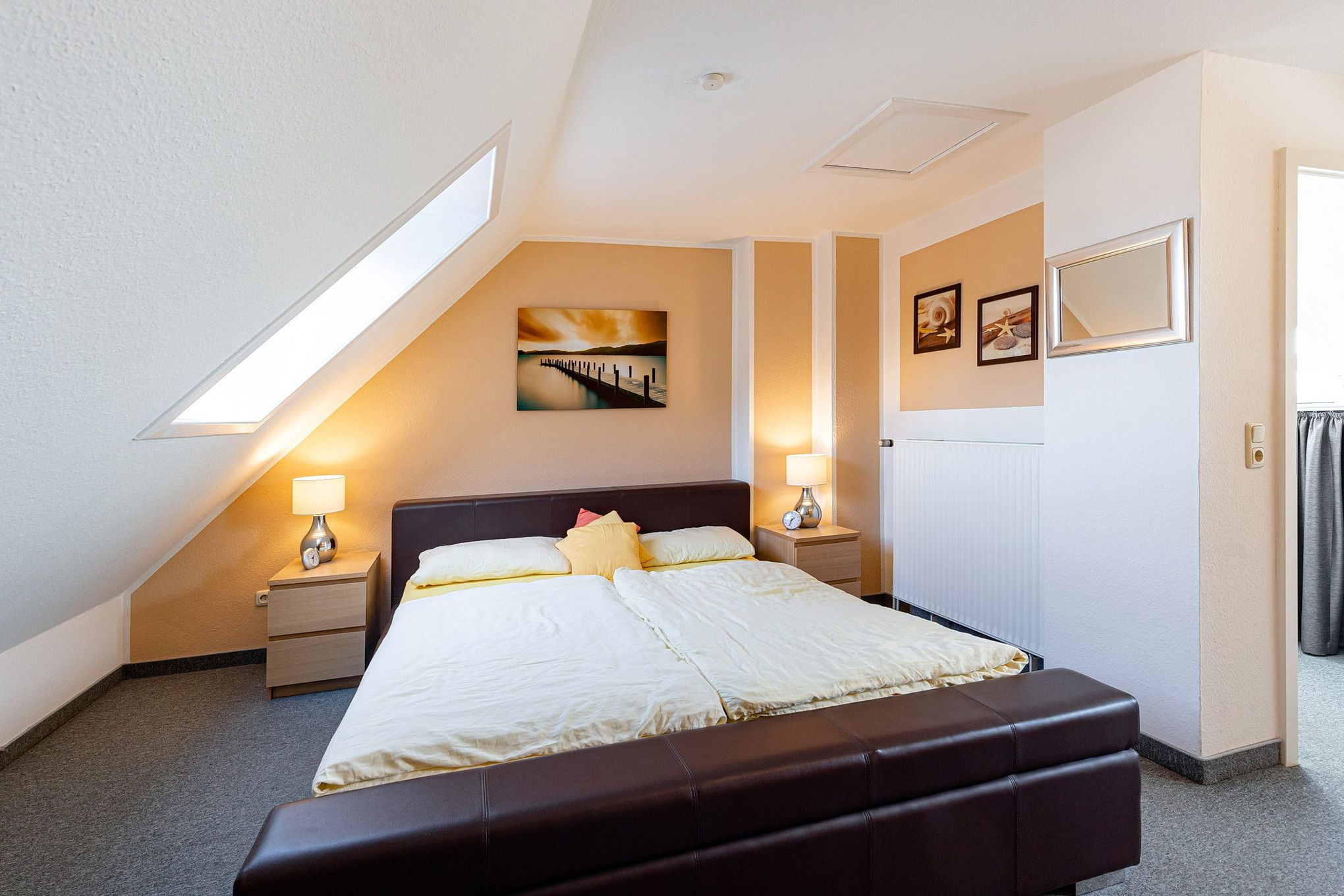 Geräumiges Schlafzimmer in der oberen Etage mit einem Doppelbett (2x 90x200cm), einem 3-türigen Kleiderschrank (ca. 1,50m x 2,20m), 2 Kommoden und gemütlichen Fernsehecke mit Sessel + Hocker. Zur Unterhaltung steht ein 40-Zoll-Smart TV zur Verfügung. Das Schlafzimmer ist mit Teppichboden ausgelegt. Die Dachfenster lassen sich durch elektrische Außenjalousien vollständig verdunkeln. Teilseeblick.