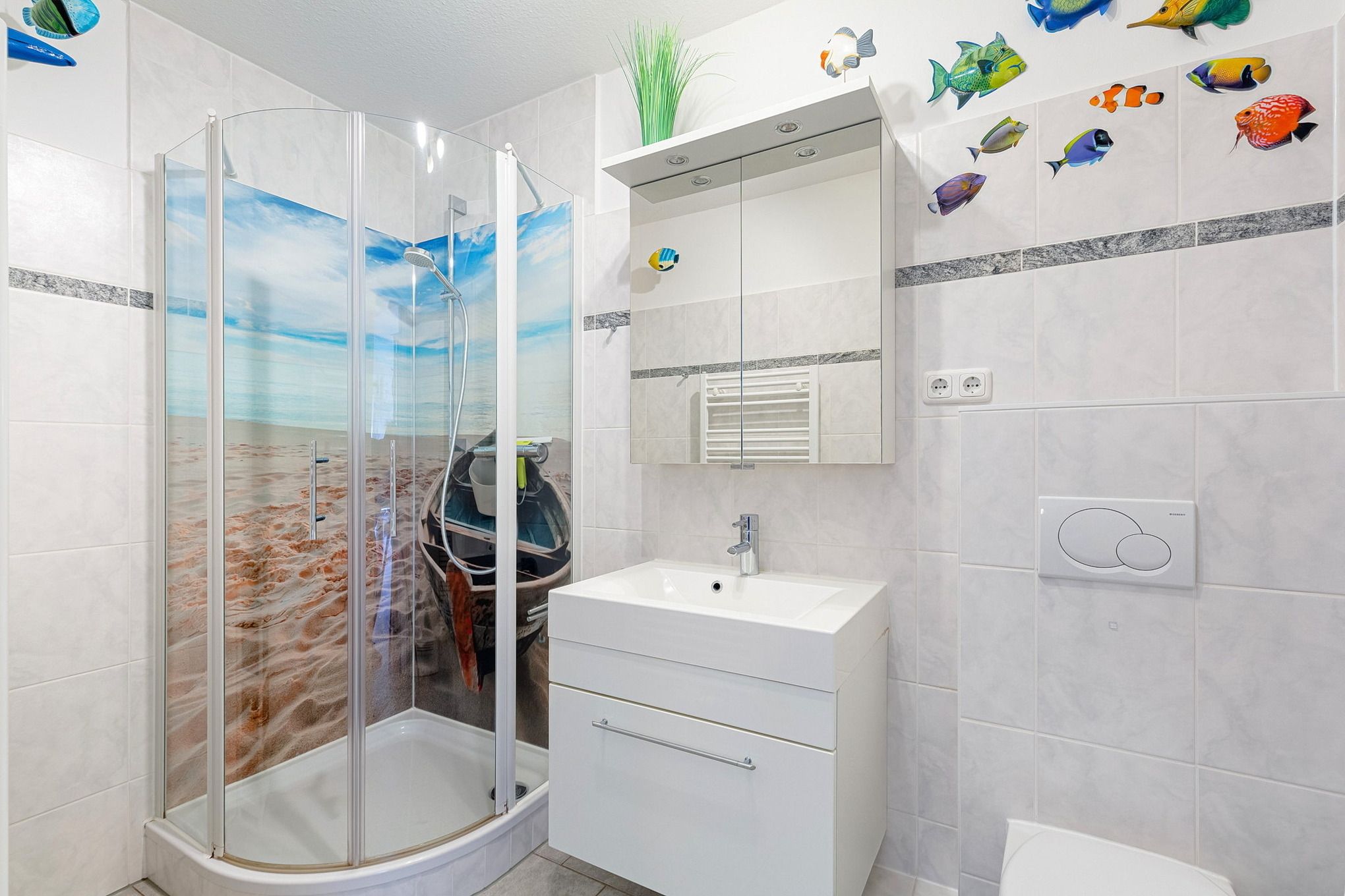 Modernes, hell gefliestes Badezimmer mit Dusche, WC und Waschbecken.