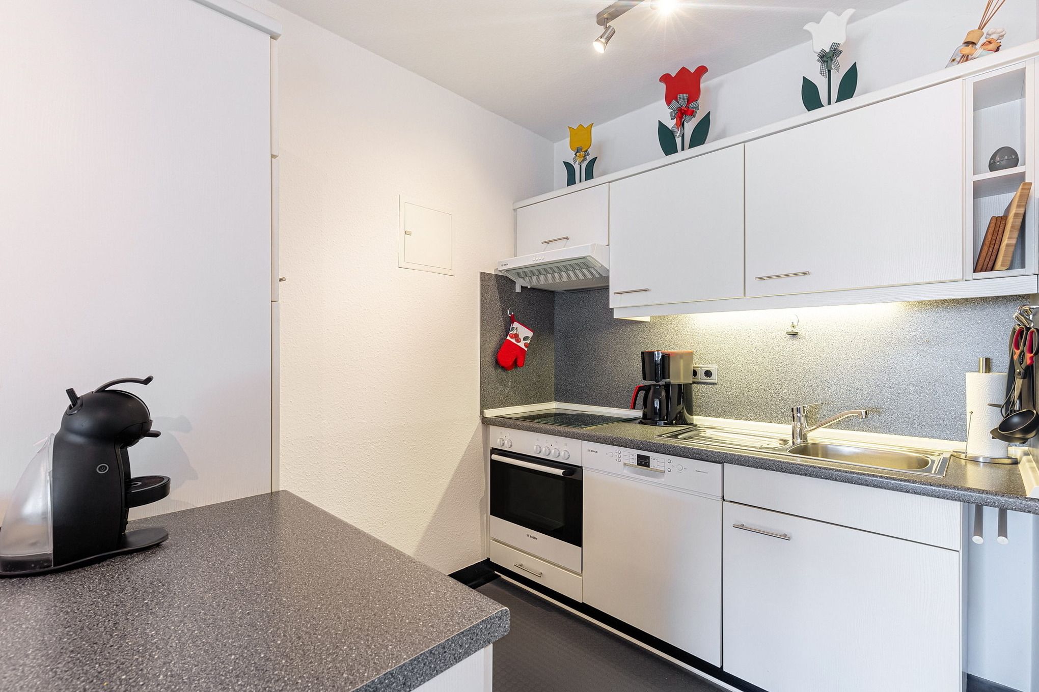 Komplett ausgestattete, zum Wohn- und Esszimmer offene Küche mit 4 Platten Cerankochfeld, Backofen, Spülmaschine, Kühlschrank mit separatem 3-Sterne Gefrierfach, Kaffeemaschine, Wasserkocher, Eierkocher.
