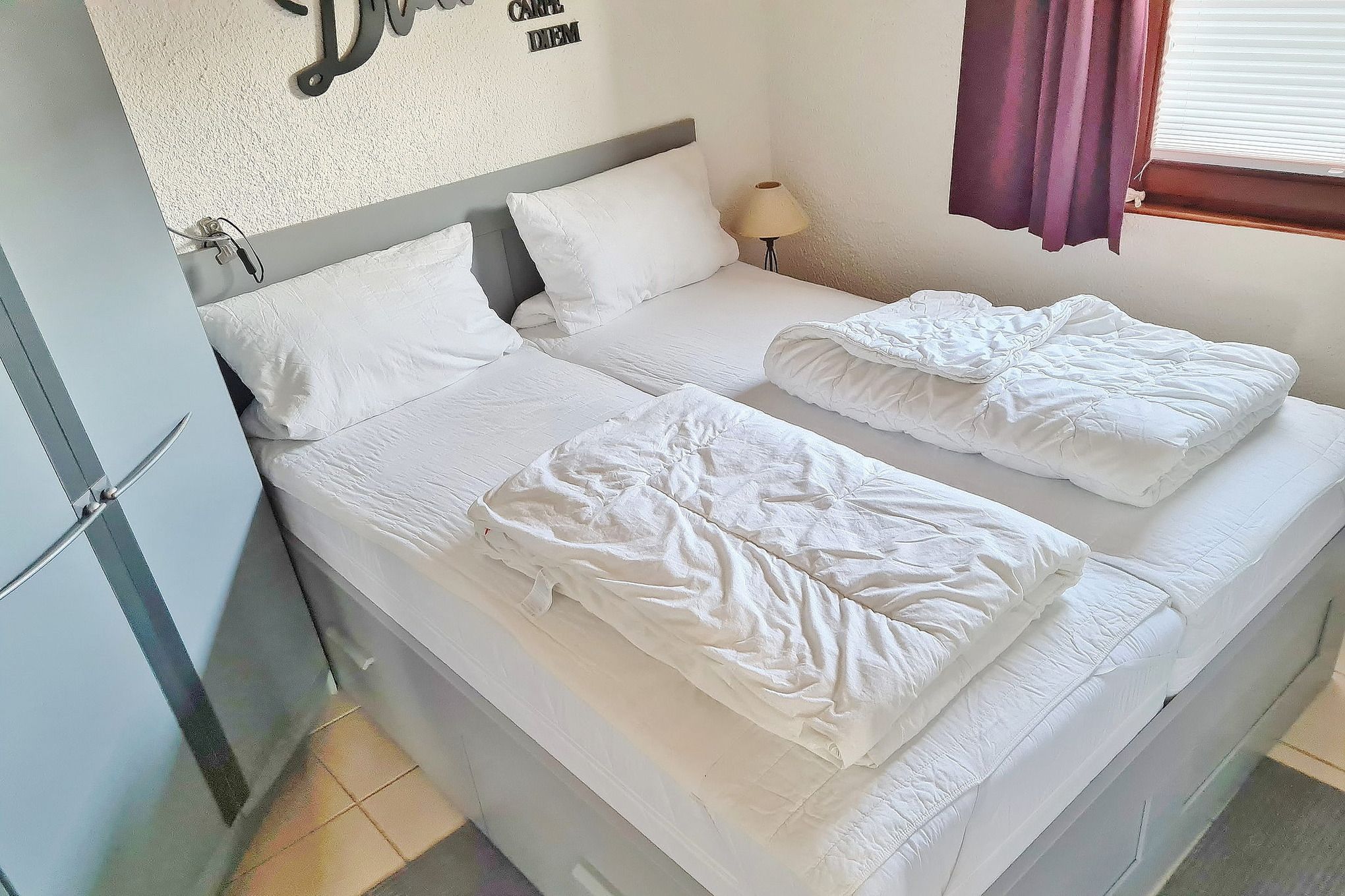 Schlafzimmer mit Doppelbett, Kleiderschrank.