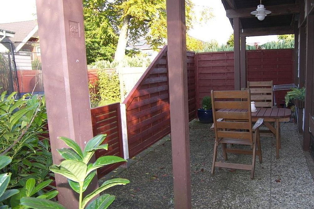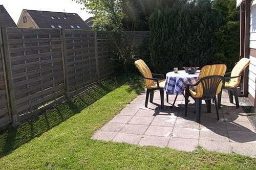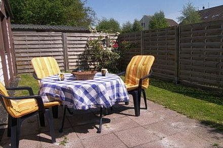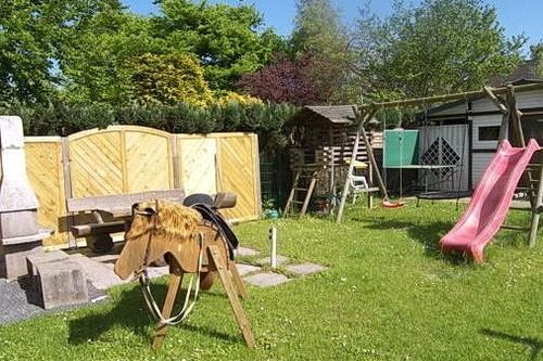 Eingezäuntes Grundstück mit sonniger Terrasse und Garten. Reisekinderbett und Hochstuhl vorhanden.
