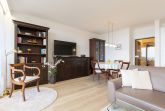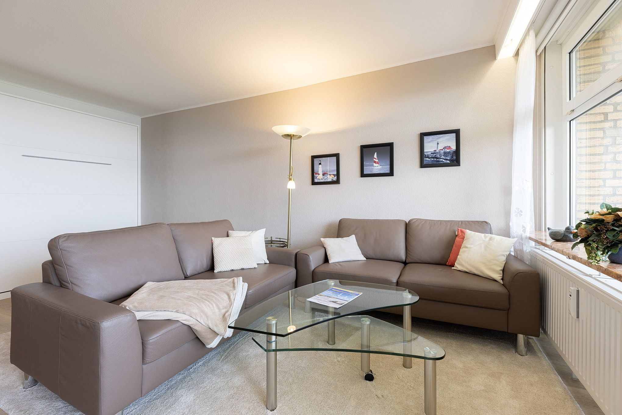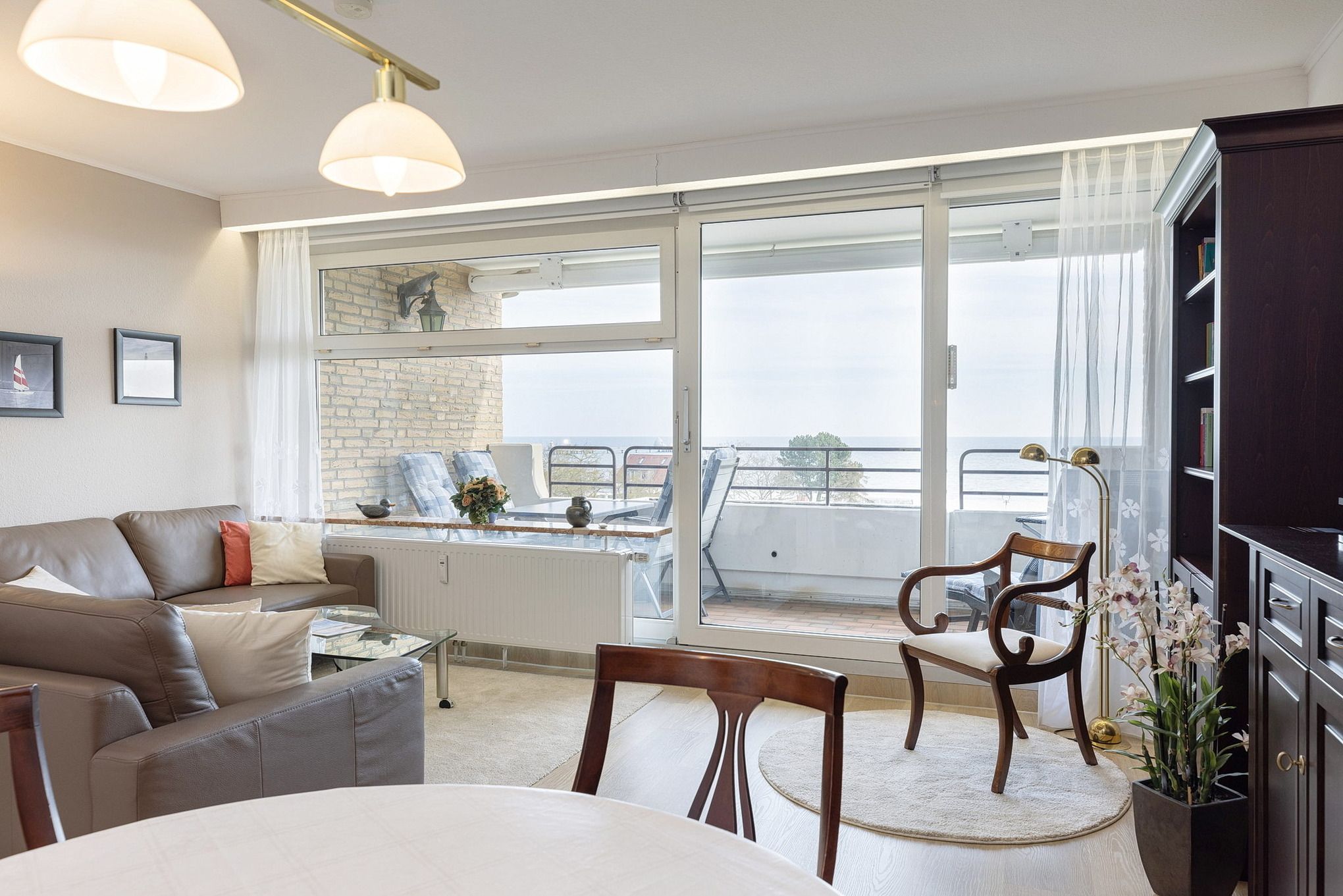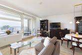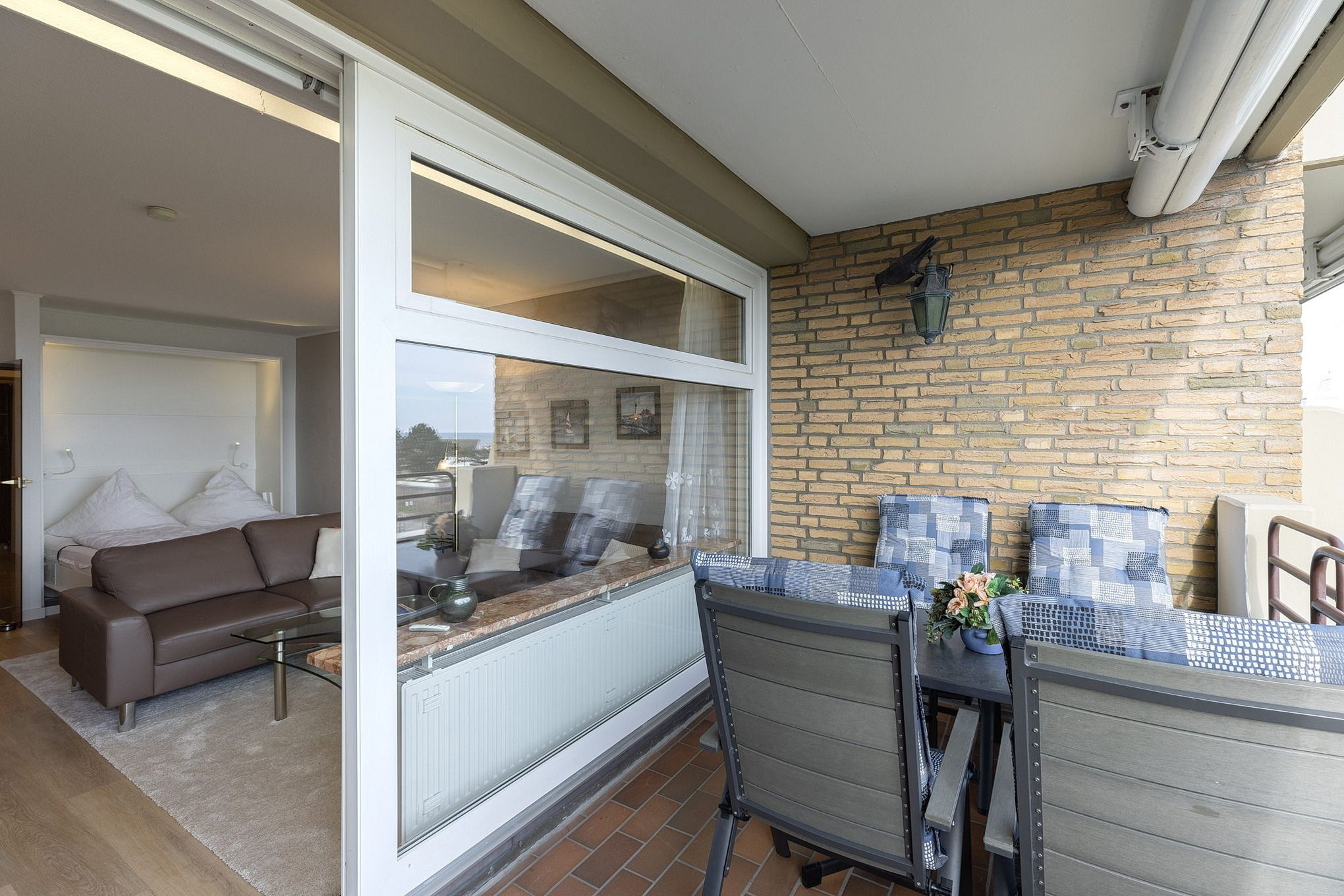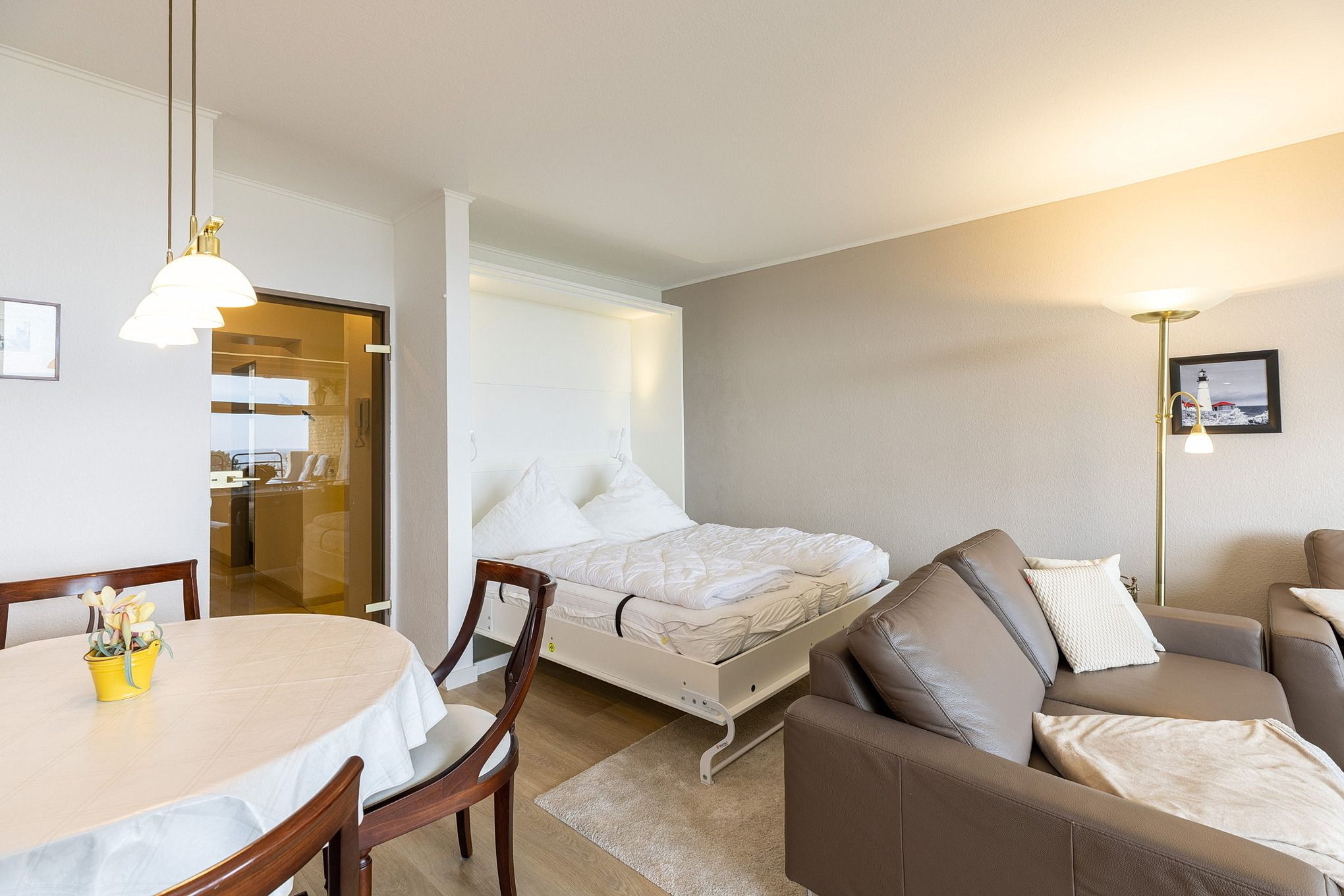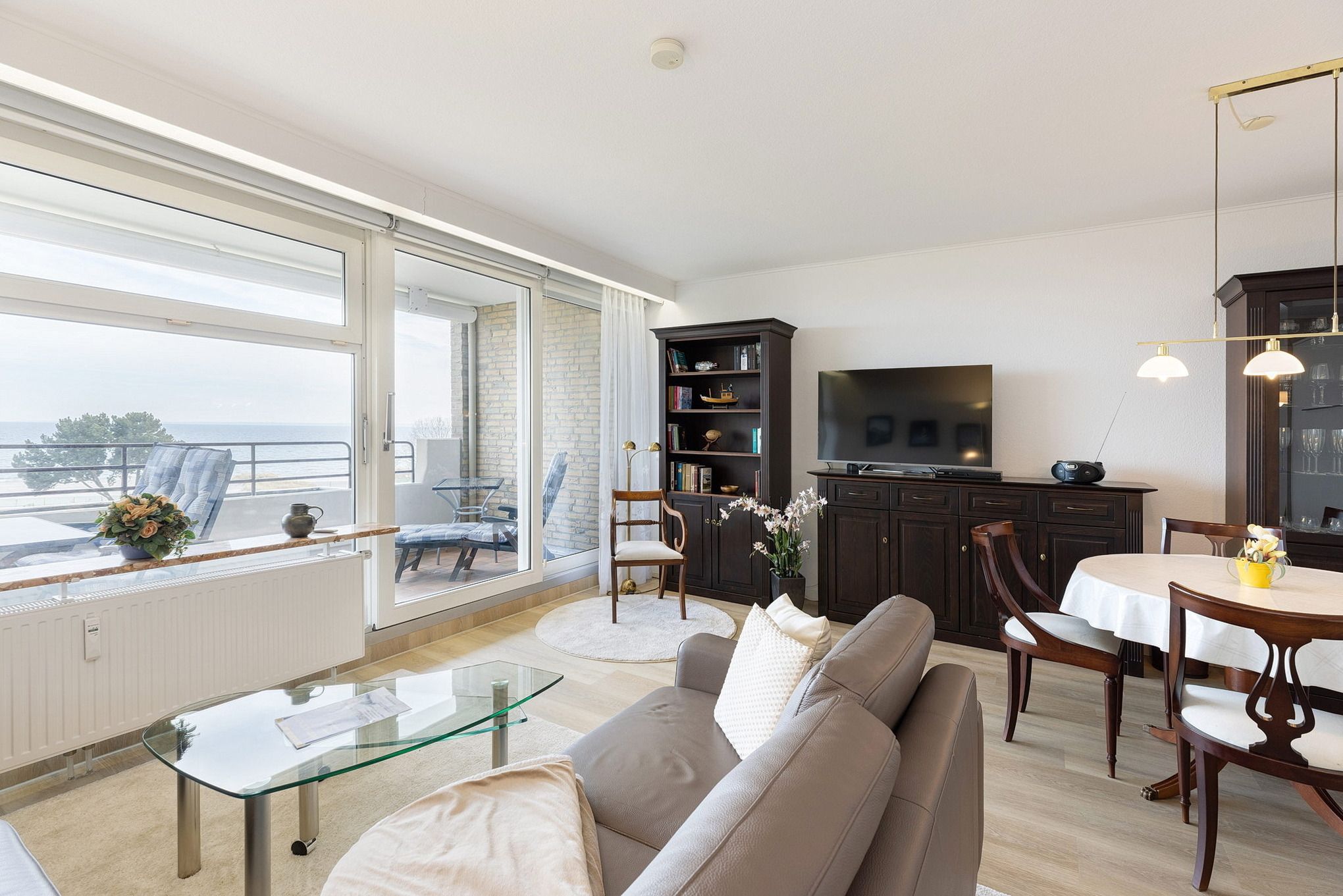 Modernes, helles Wohn- und Schlafzimmer mit direktem Zugang zum Balkon in süd-östlicher Richtung. Das Wohn- und Schlafzimmer ist mit einem Essplatz für 4 Personen, zwei Zweisitzer-Sofas aus Leder, einem Couchtisch, viel Schrankraum und einem 160x200cm großen Schrankdoppelbett (mit zwei 80x200cm Matratzen) ausgestattet. Ein großer 50 Zoll Flachbildschirm, ein DVD-Player und eine Mini-Stereoanlage mit CD-Player sorgen für Unterhaltung. Die Fenster lassen sich durch Innenrollos verdunkeln.