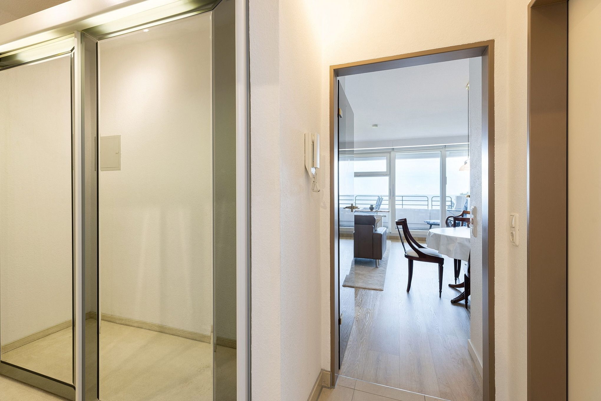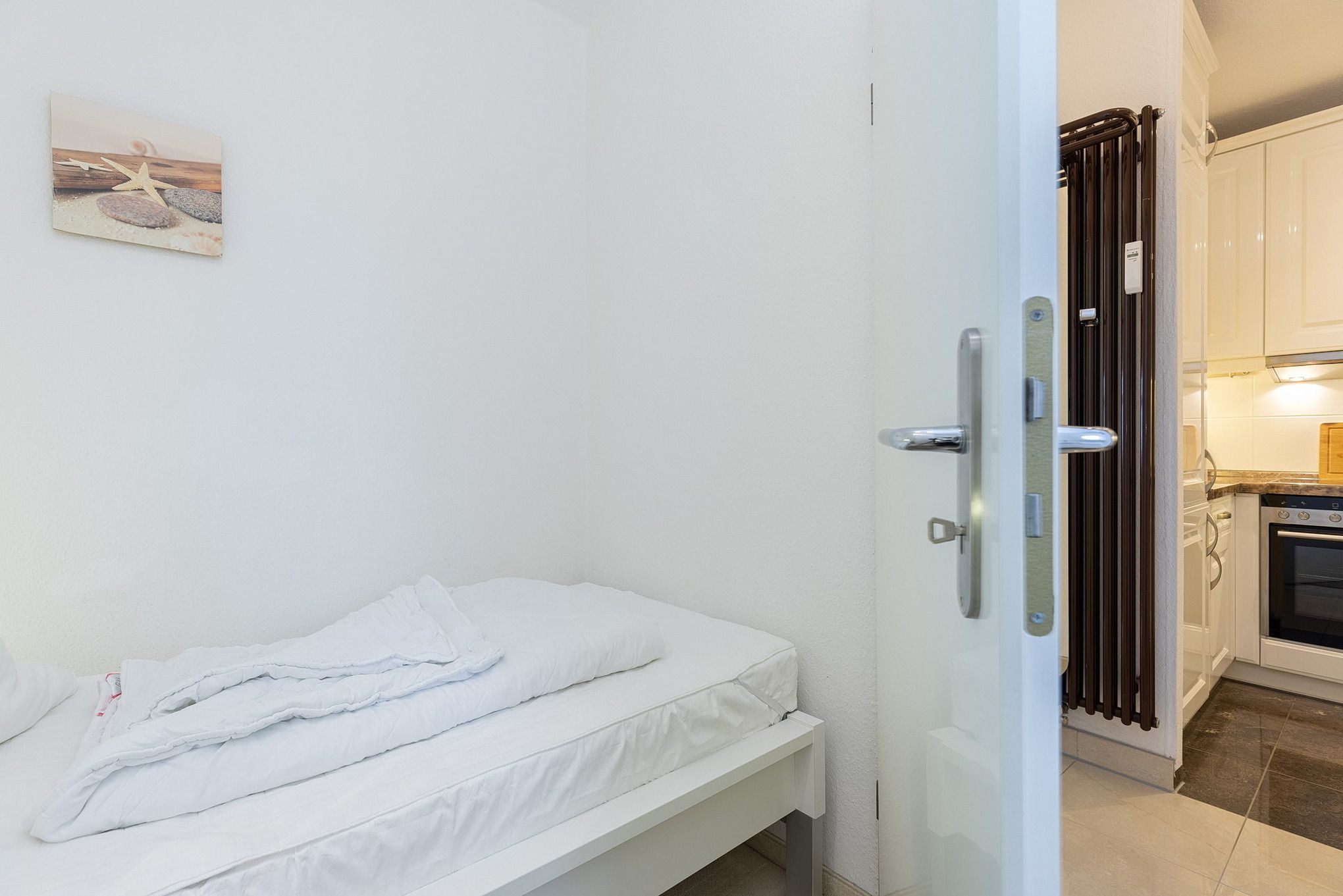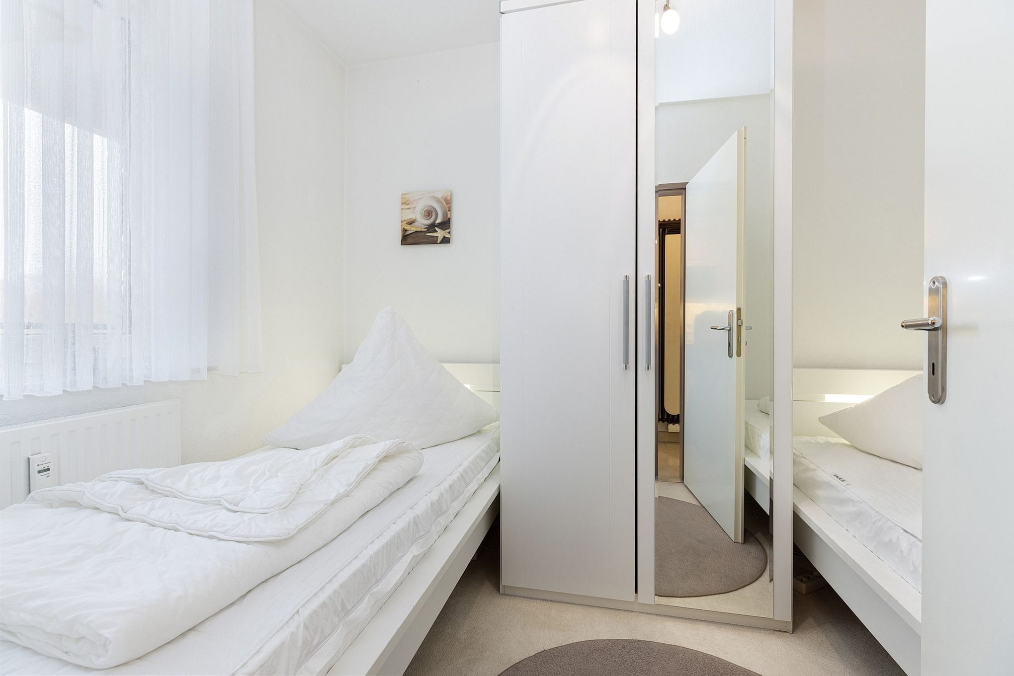Das separate, kleine Schlafzimmer ist mit 2 Einzelbetten (90x200cm) und einem Kleiderschrank mit Spiegel ausgestattet. Ein großer Spiegelkleiderschrank befindet sich im Flur. Das Fenster zum Eingangsbereich lässt sich durch ein Rollo blickdicht verdunkeln.