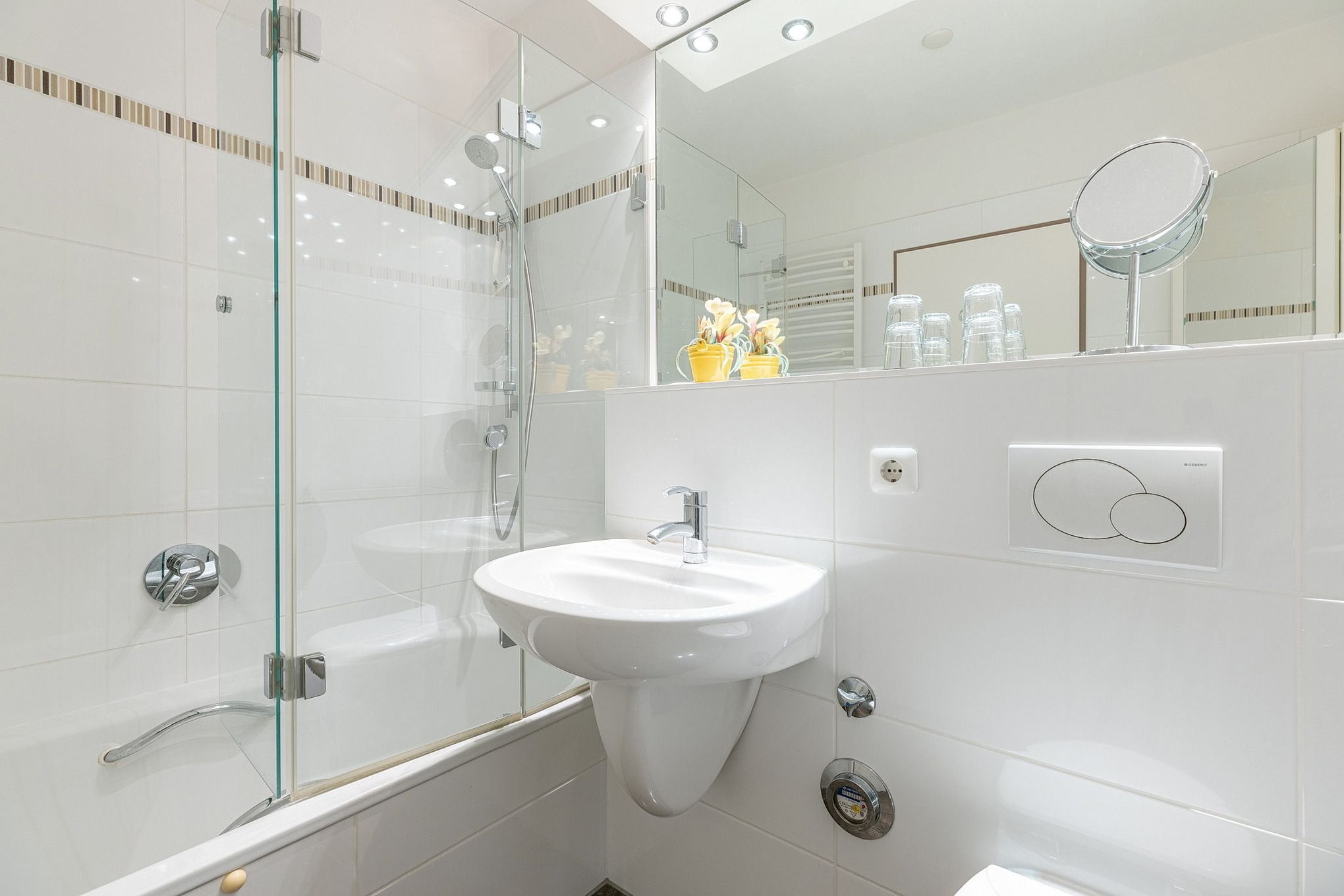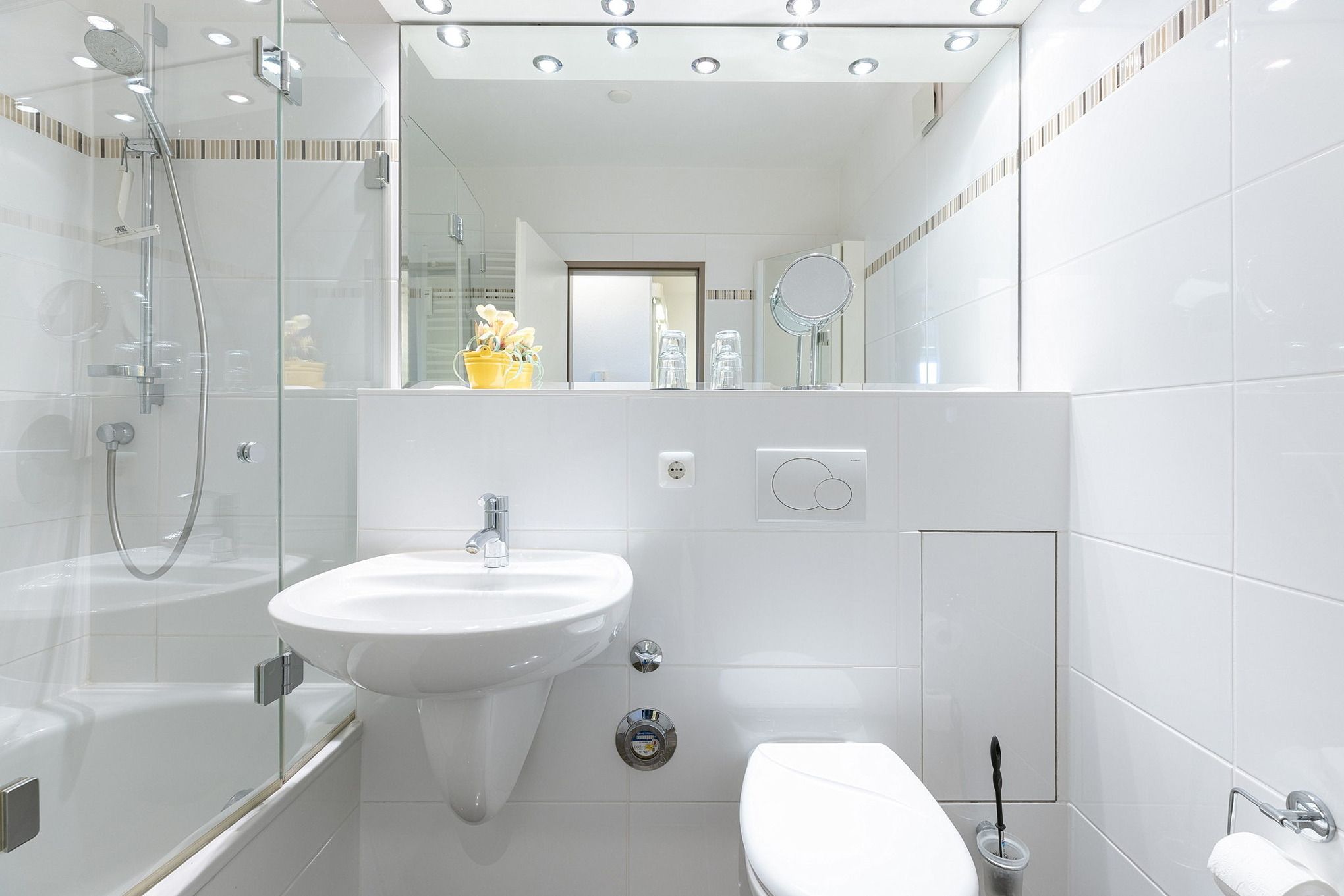 Modernes, hell gefliestes Bad mit tiefergelegter Wanne mit Dusche, WC und Waschbecken.