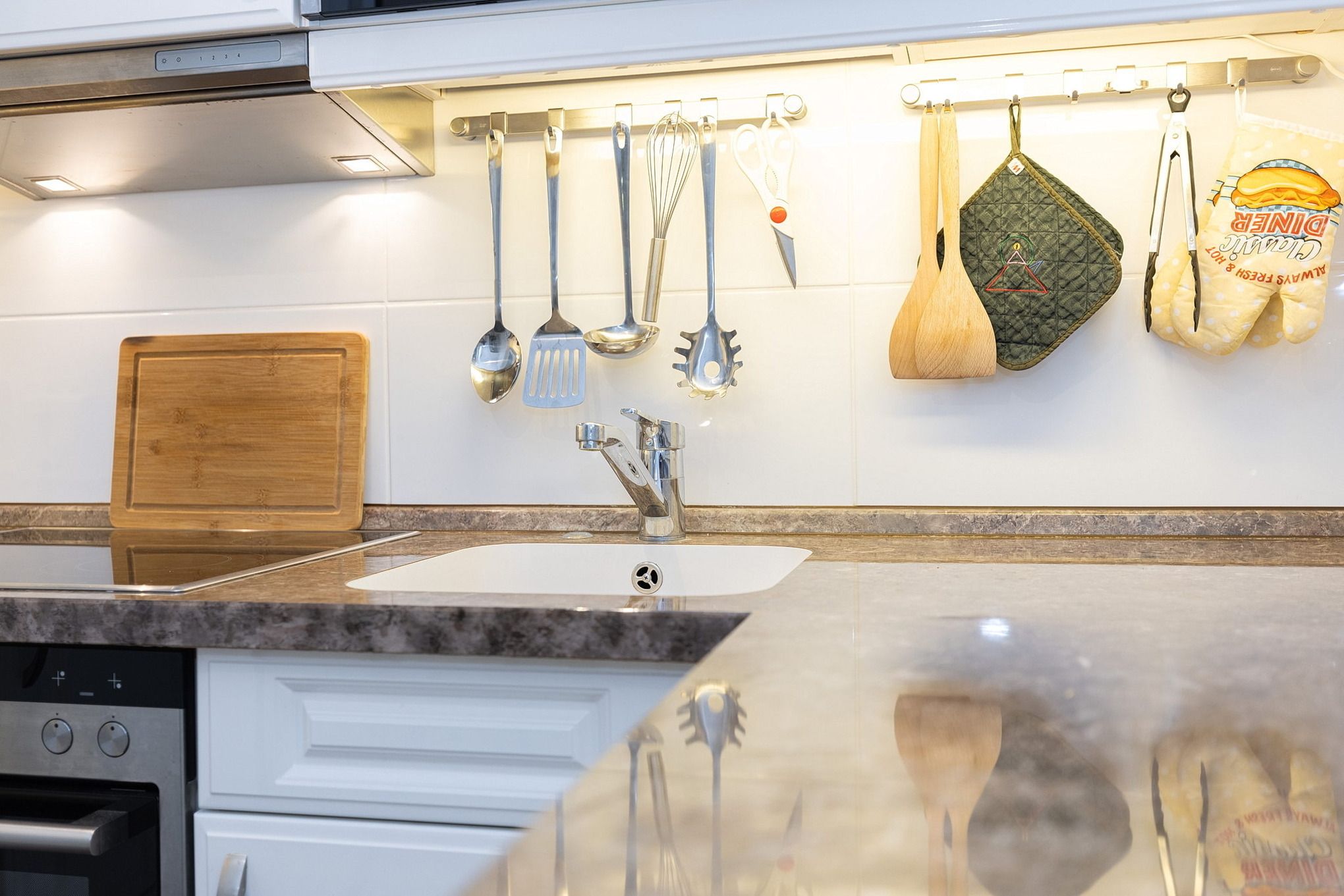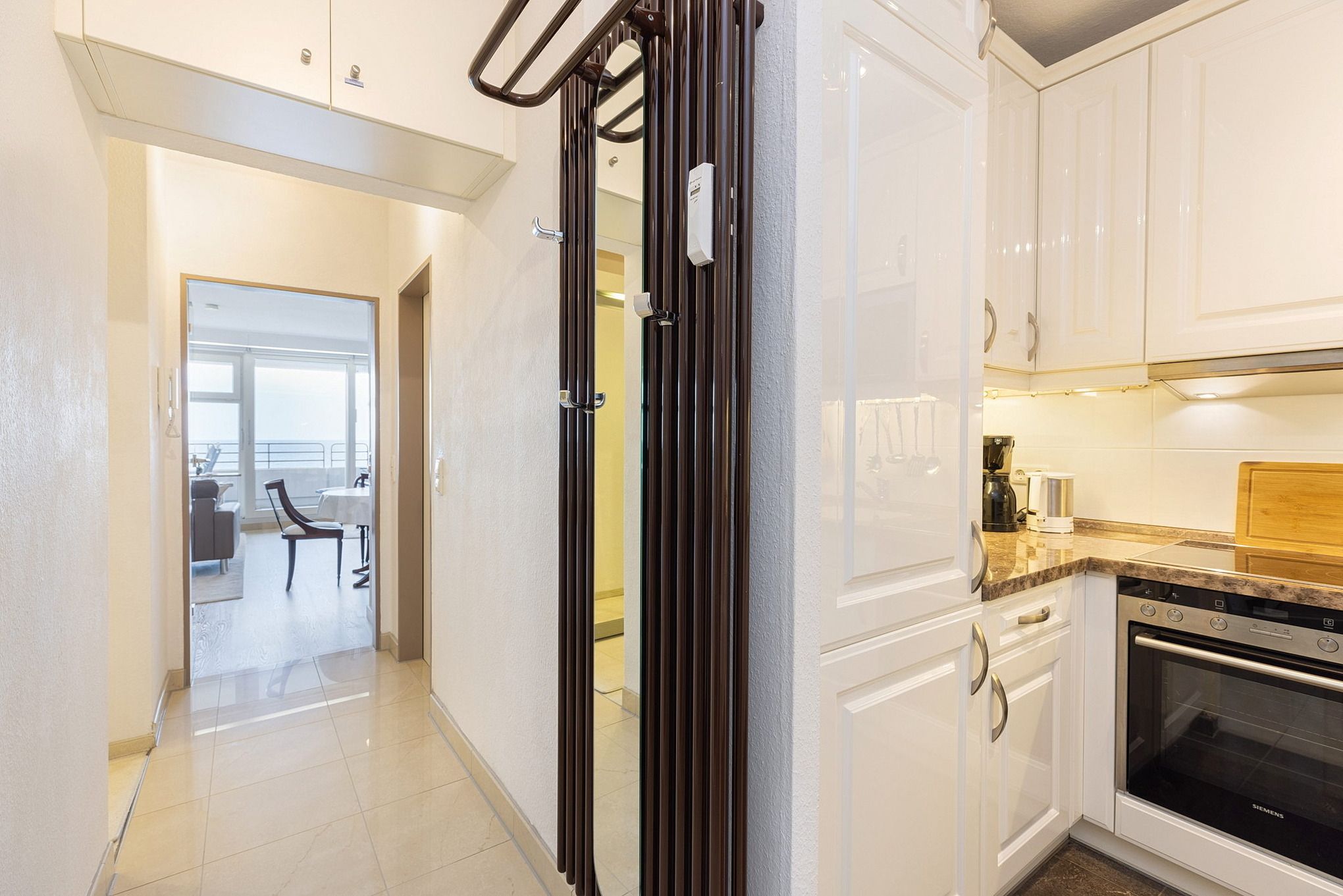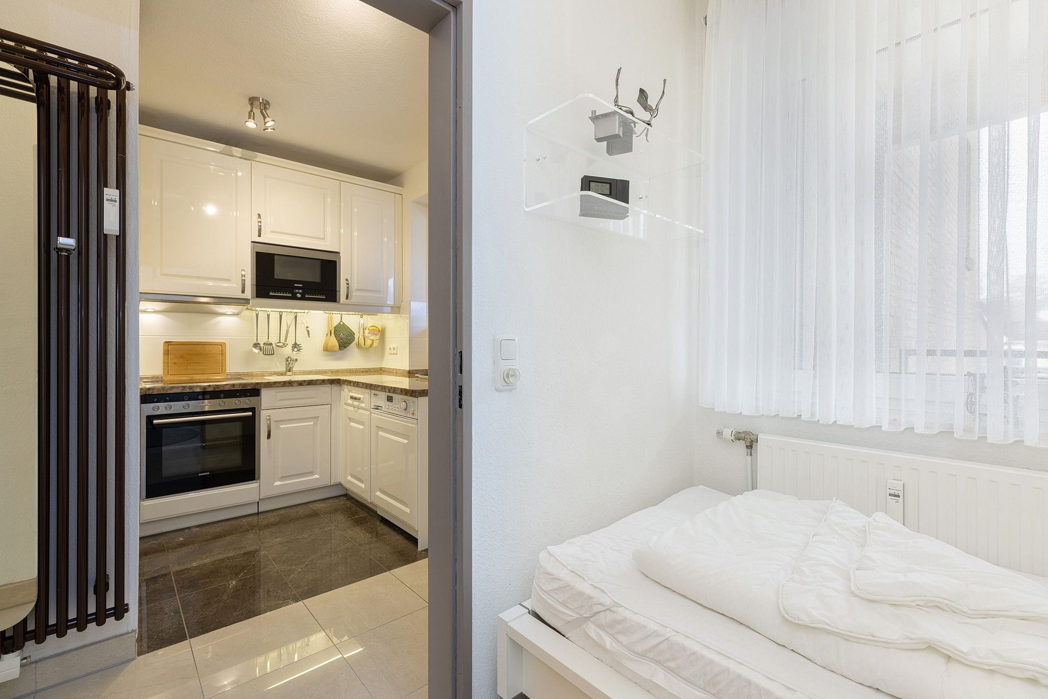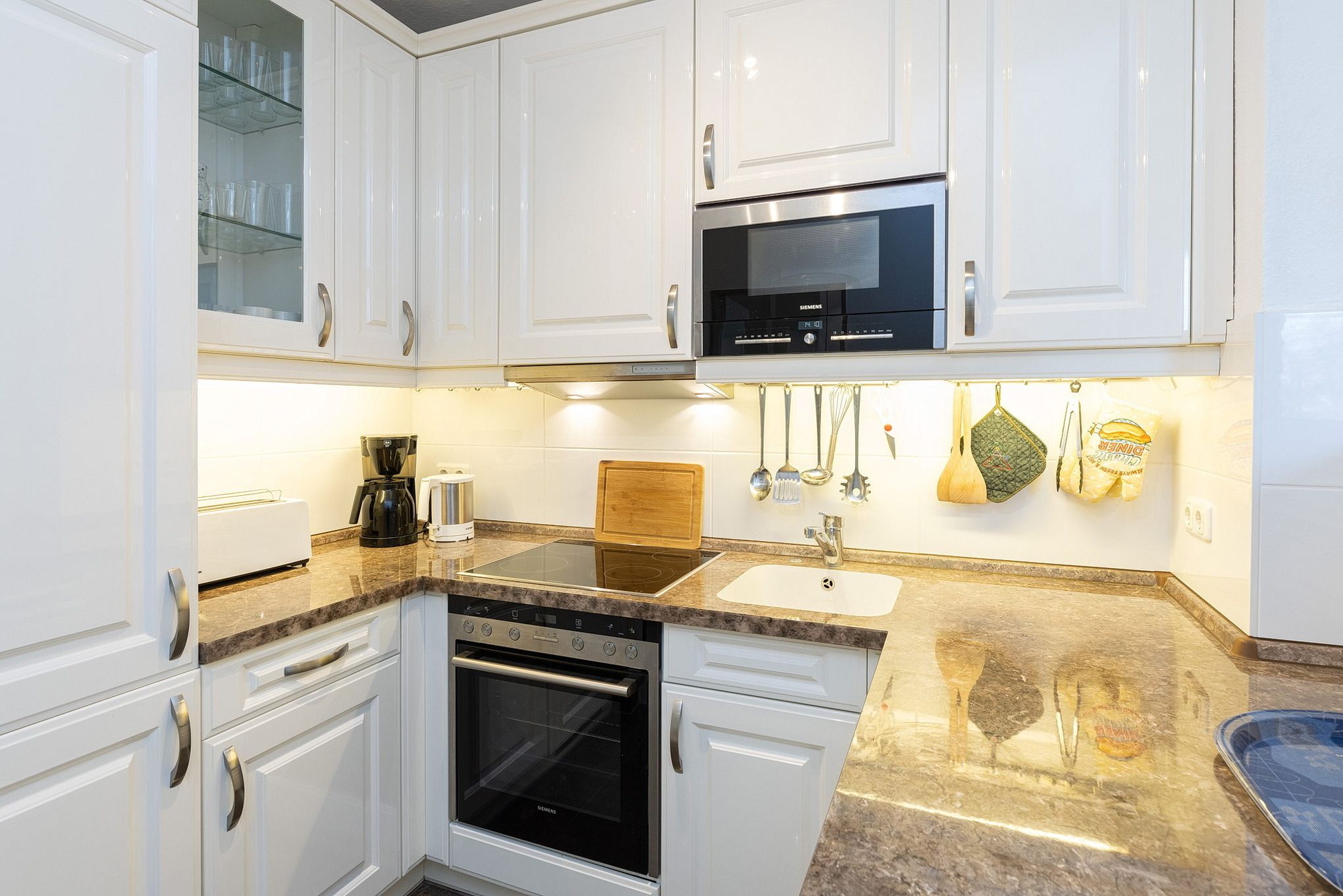 Hochwertige, komplett ausgestattete moderne Küche mit 4 Platten Cerankochfeld, Backofen, Kühlschrank, Gefrierschrank, Spülmaschine, Mikrowelle mit Grill, Kaffeemaschine, Toaster, Wasserkocher.