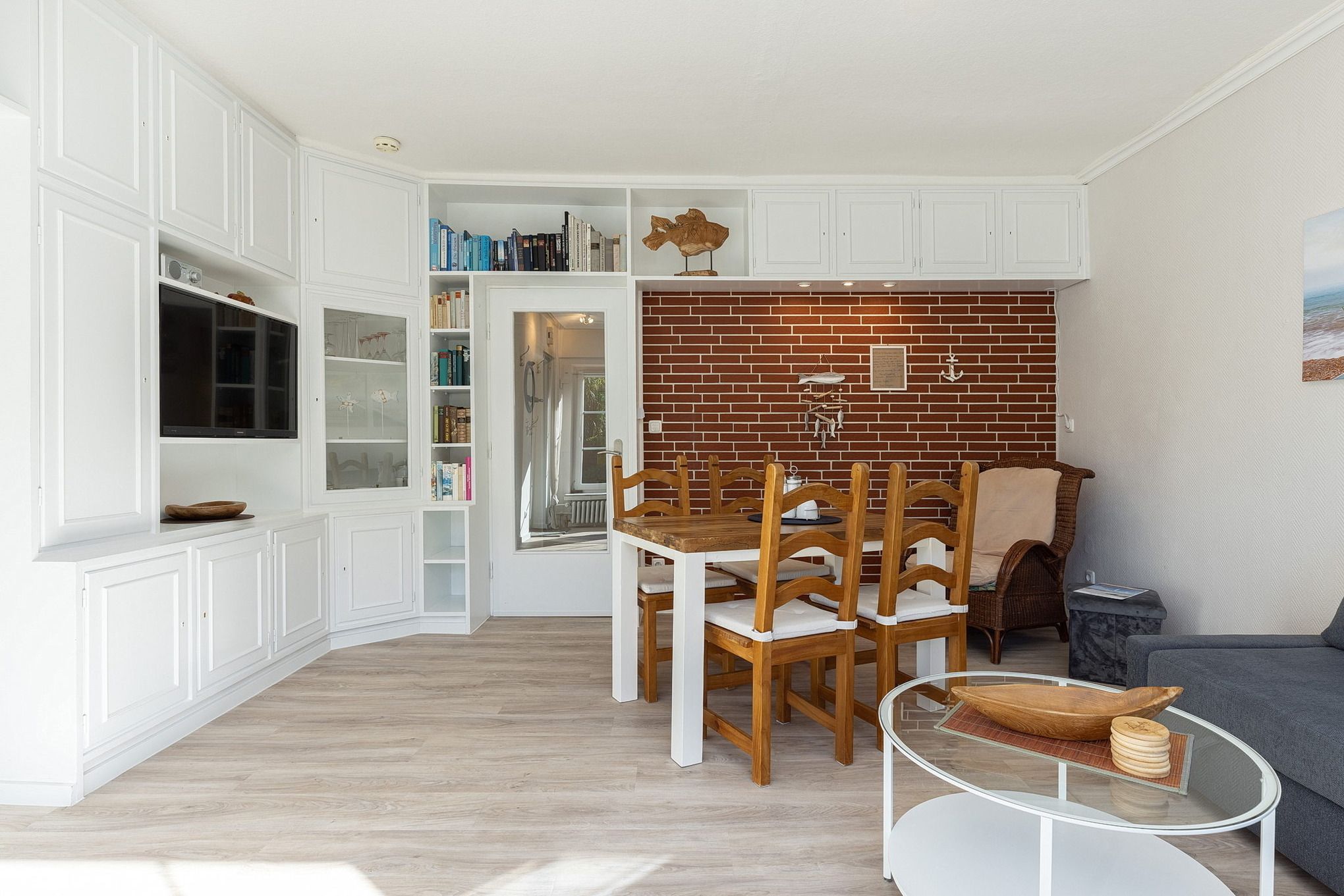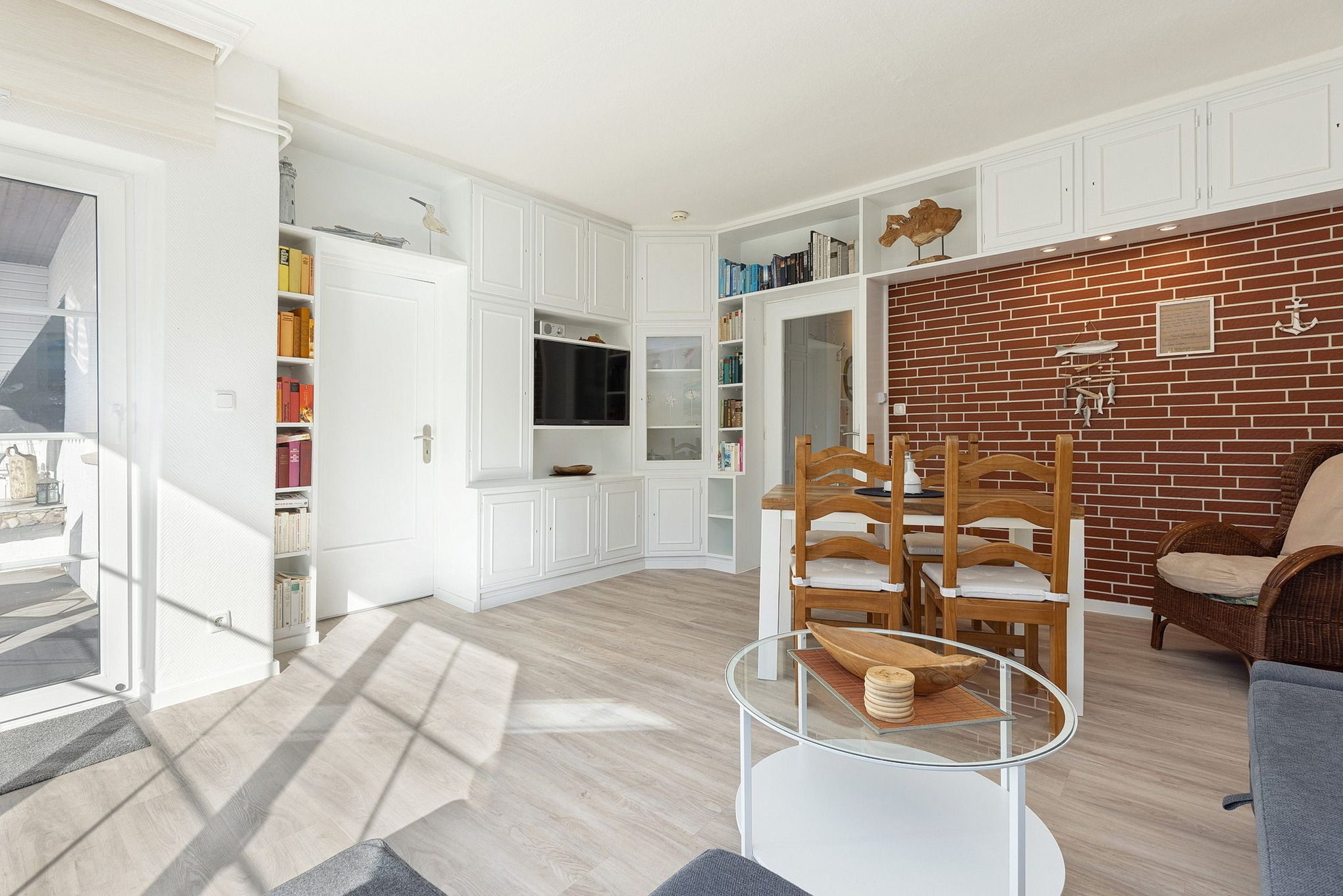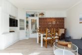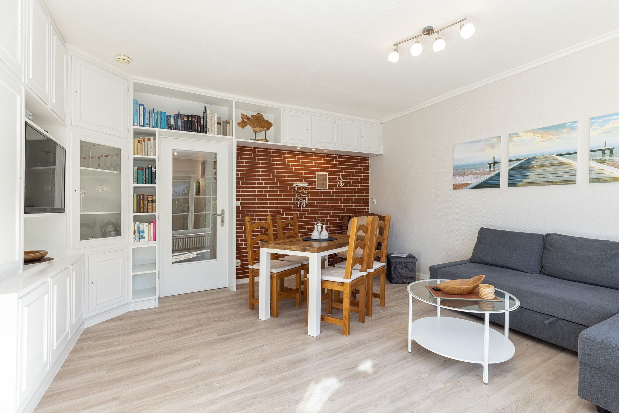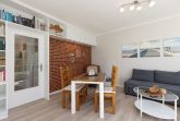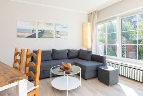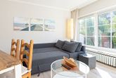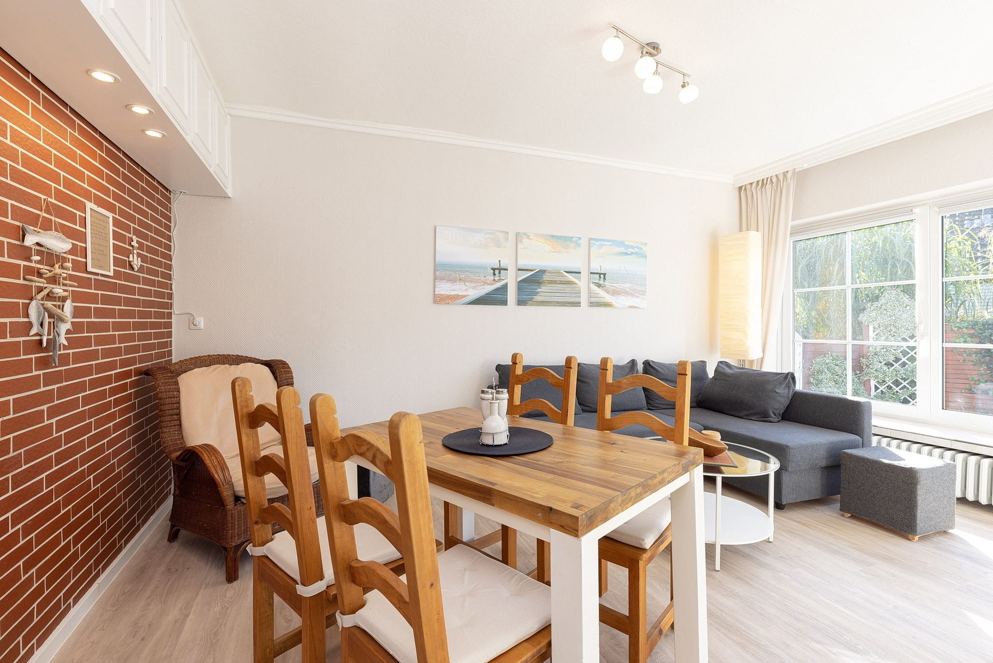 Lichtdurchfluteter Wohnbereich mit direktem Zugang zur Terrasse und zum Garten. Das Wohnzimmer ist ausgestattet mit einer 3er- Eckcouch mit Schlaffunktion und einem gemütlichen Sessel sowie einem Essbereich, der Platz für 4 Personen bietet. Zur Unterhaltung steht ein Flachbildfernseher zur Verfügung. Der Raum ist mit hochwertigem Designvinylboden ausgelegt und die Fenster lassen sich durch Innenrollos verdunkeln.