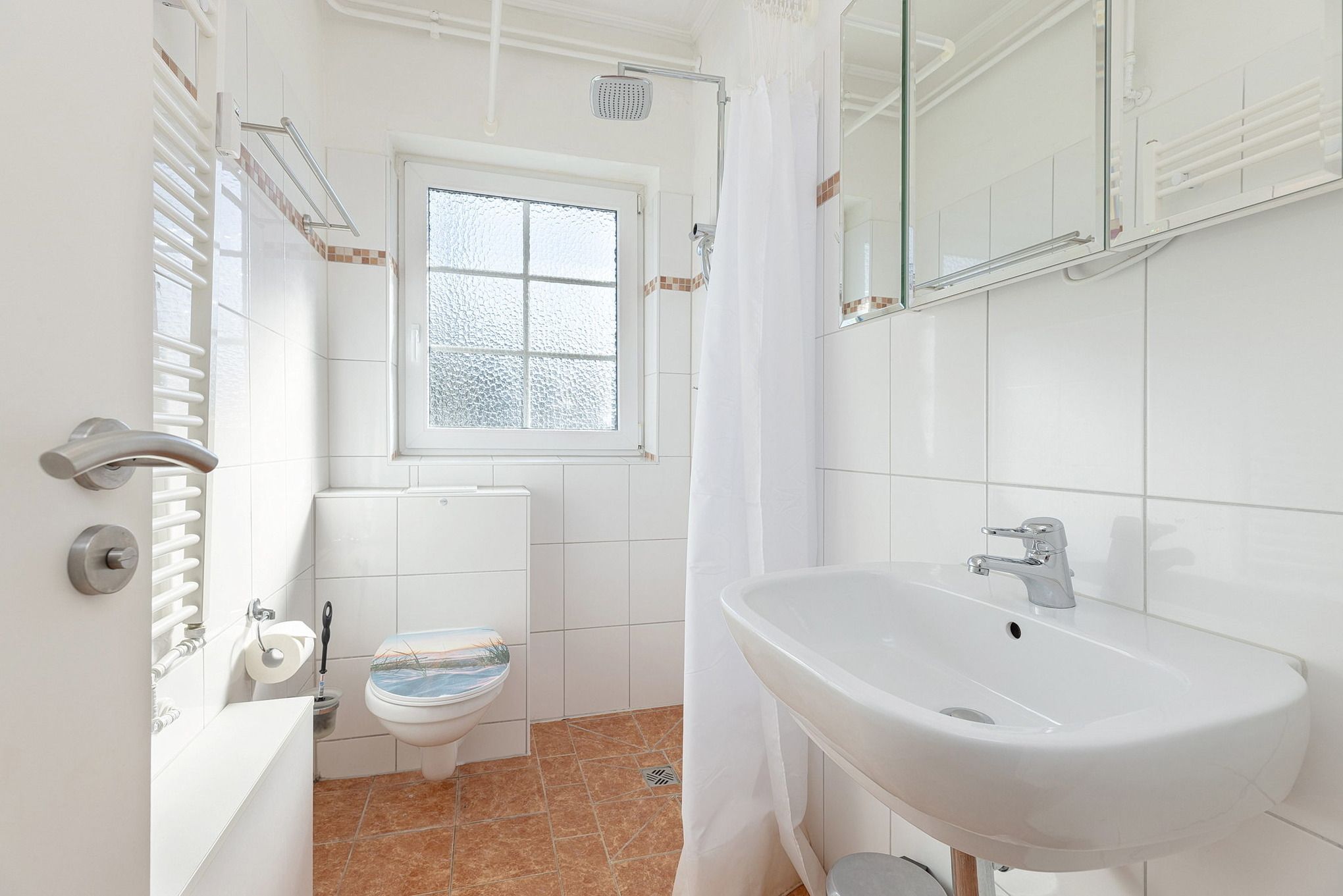 Kleines helles Tageslichtbad mit ebenerdiger Dusche, WC und Waschbecken.