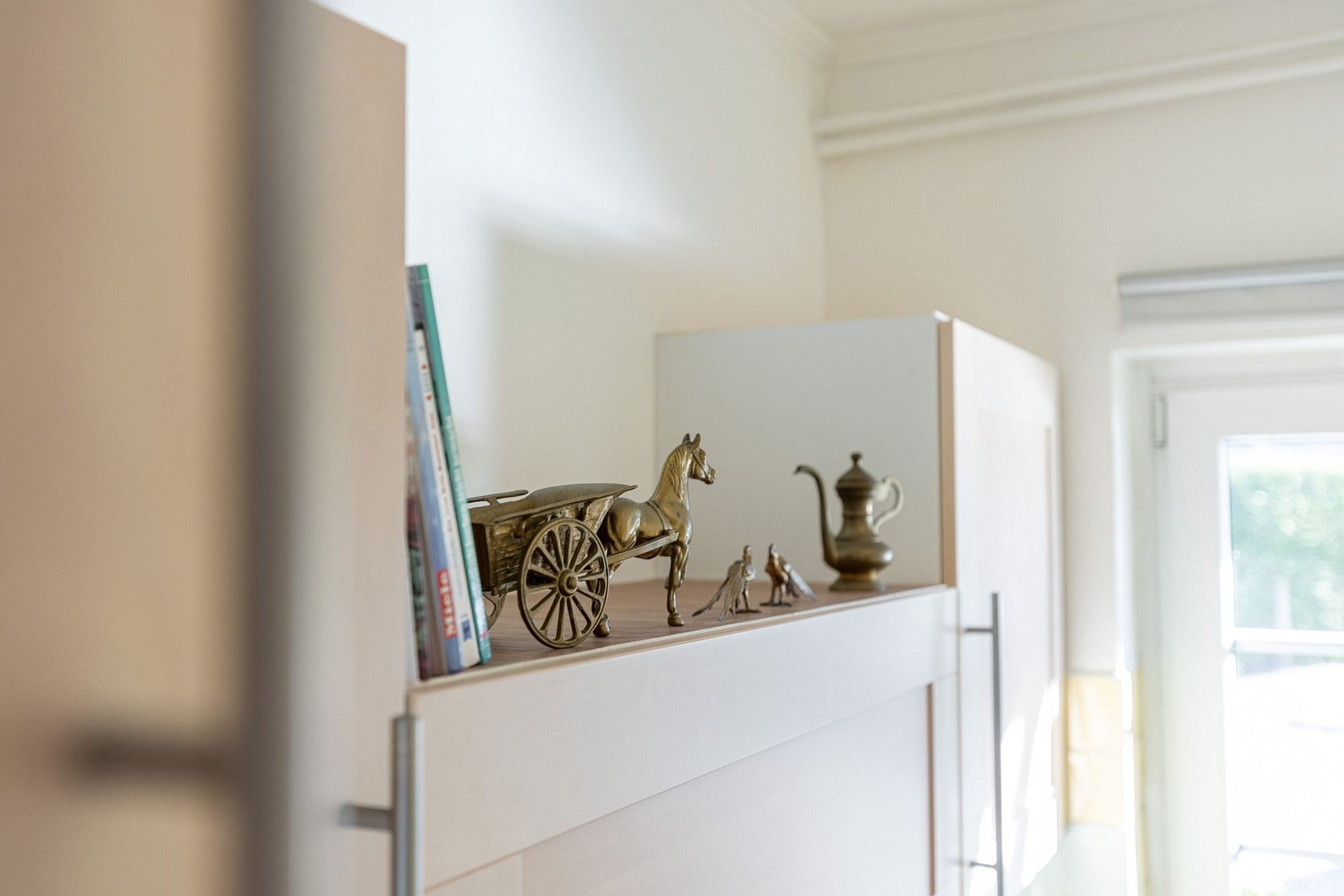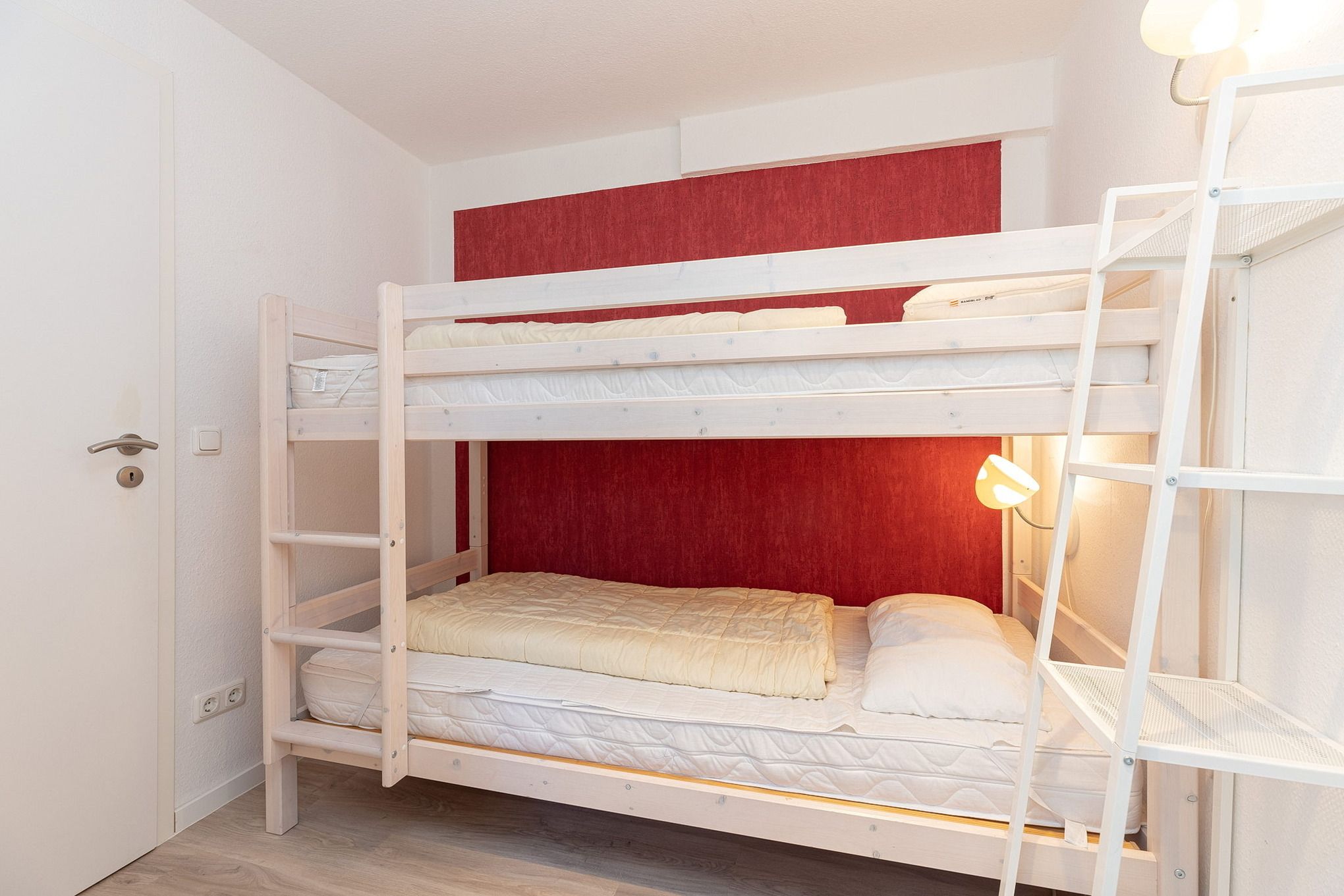 Das kleine Kinderzimmer ist ausgestattet mit einem Etagenbett (2x90x200cm) und einem ein-türigen Kleiderschrank. Der Raum ist mit hochwertigem Designvinylboden ausgelegt, das Fenster lässt sich durch ein Innenrollo blickdicht verdunkeln.