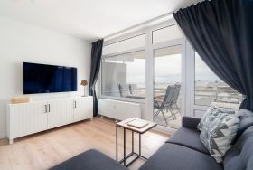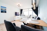 Balkon in südliche Richtung mit Blick auf die Ostsee. Eigener, schmaler PKW-Stellplatz (max. Höhe 1,90 m), Waschmaschine und Trockner gegen Gebühr.