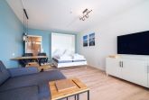 Freundliches, helles und gemütliches Wohn- und Schlafzimmer mit einem Designerfußboden in Holzoptik. Im Wohn-/Schlafzimmer befinden sich eine Eck-Couch, ein Couch-Tisch, ein Essplatz für 4 Personen, ein Schrankbett (2x80x200cm) sowie ein SAT-TV (Flachbildschirm). Das Zimmer lässt sich mit Vorhängen verdunkeln. Direkter Zugang vom Wohn- und Schlafzimmer zum Balkon mit Aussicht auf das Meer.