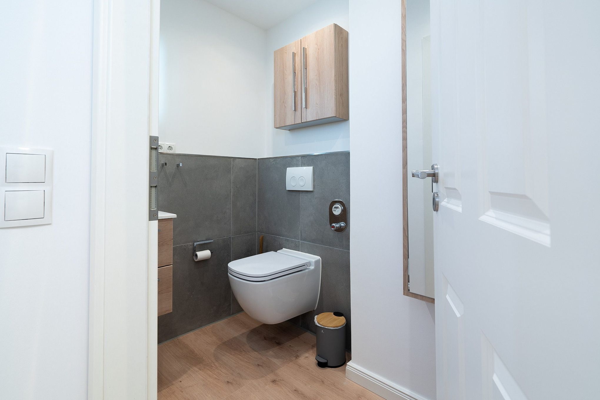 Modernes, kleines Bad mit Dusche, WC und Waschbecken.
