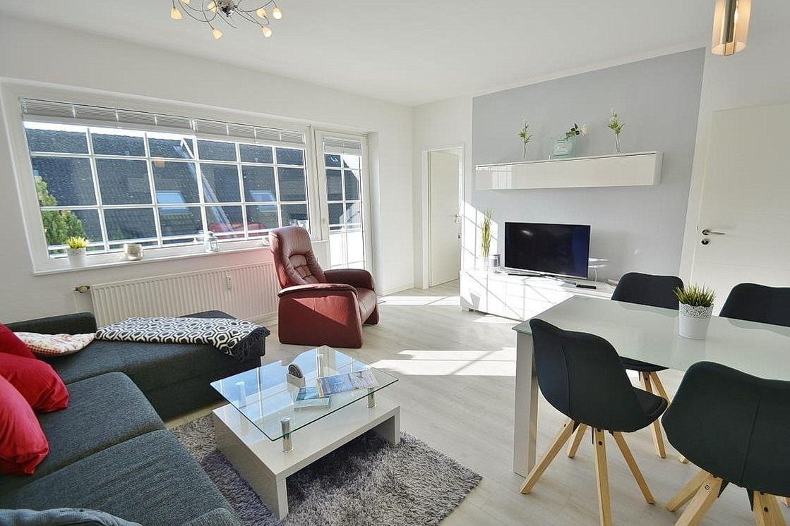 Das helle moderne Wohn- und Esszimmer mit direktem Zugang zum Balkon ist mit einer gemütliche Eckcouch mit Schlaffunktion (150x200cm mit Lattenrost), einem Relax-Sessel sowie einem Essplatz für 4 Personen ausgestattet. Zur Unterhaltung steht ein Flachbildfernseher zur Verfügung. Das Wohnzimmer ist mit Designer-Planken ausgelegt und lässt sich durch ein Rollo verdunkeln.