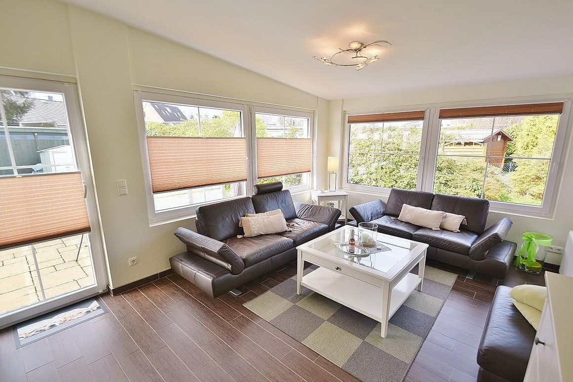 Modernes, großzügiges Wohn- und Esszimmer mit direktem Zugang zur Terrasse. Das geflieste Wohn- und Esszimmer ist mit einem Essplatz für 4 Personen, 2 Leder-Couchen, einem Couchtisch und einer Kommode ausgestattet. Zur Unterhaltung stehen ein Flachbildschirm und eine Mini-Stereoanlage zur Verfügung. Der moderne, geflieste Schlafbereich mit einem Boxspringbett (160x200cm) und einem Kleiderschrank ausgestattet, ist durch eine Vorhangsystem vom Wohnbereich getrennt. Das Fenster lässt sich durch ein Innenrollo etwas verdunkeln.