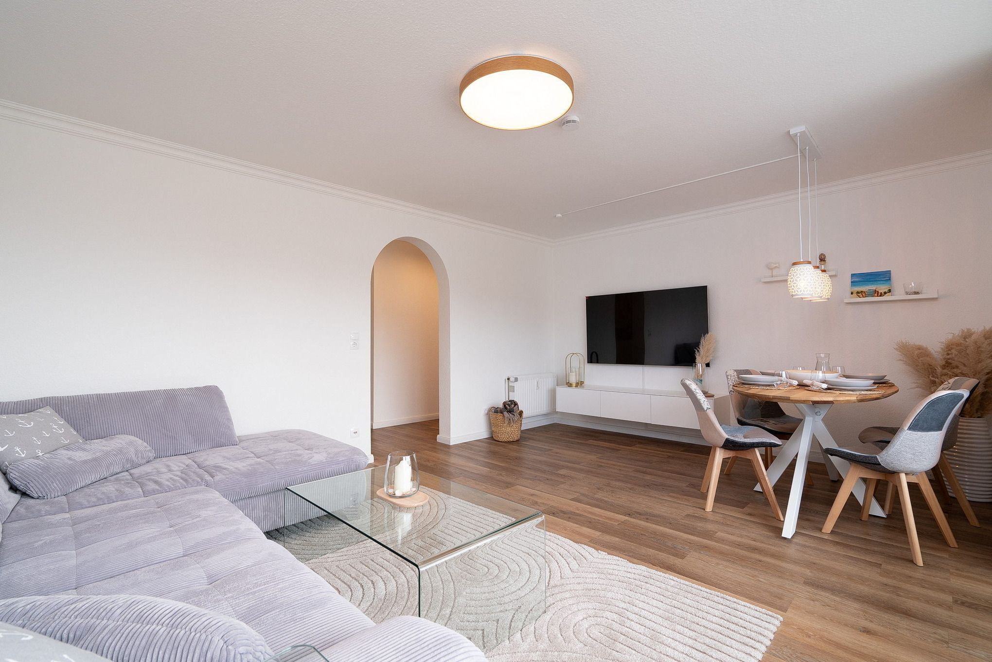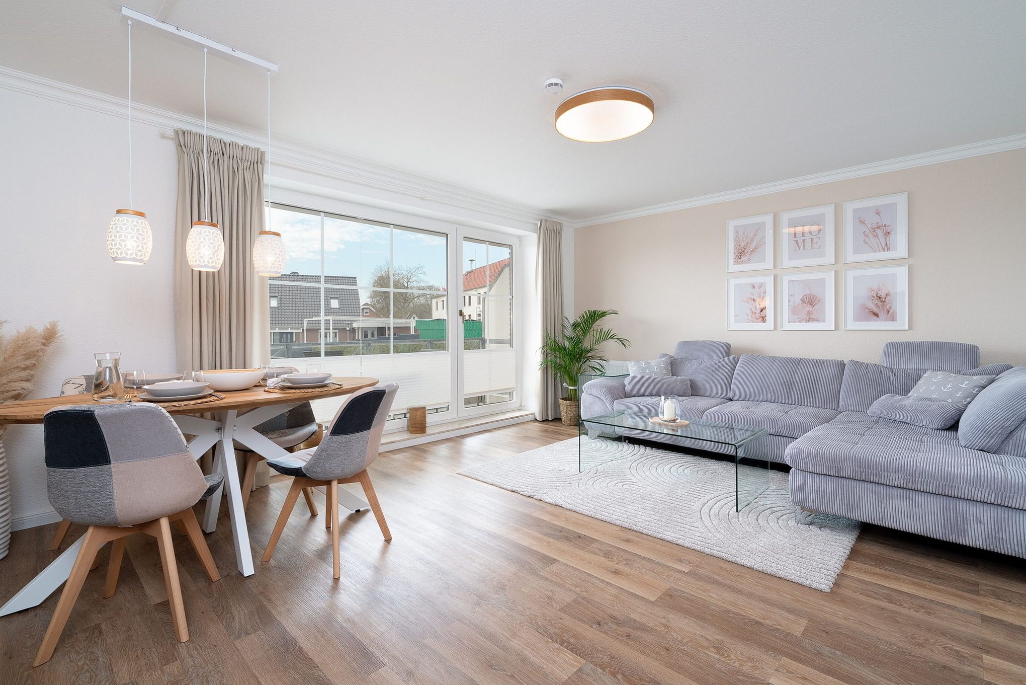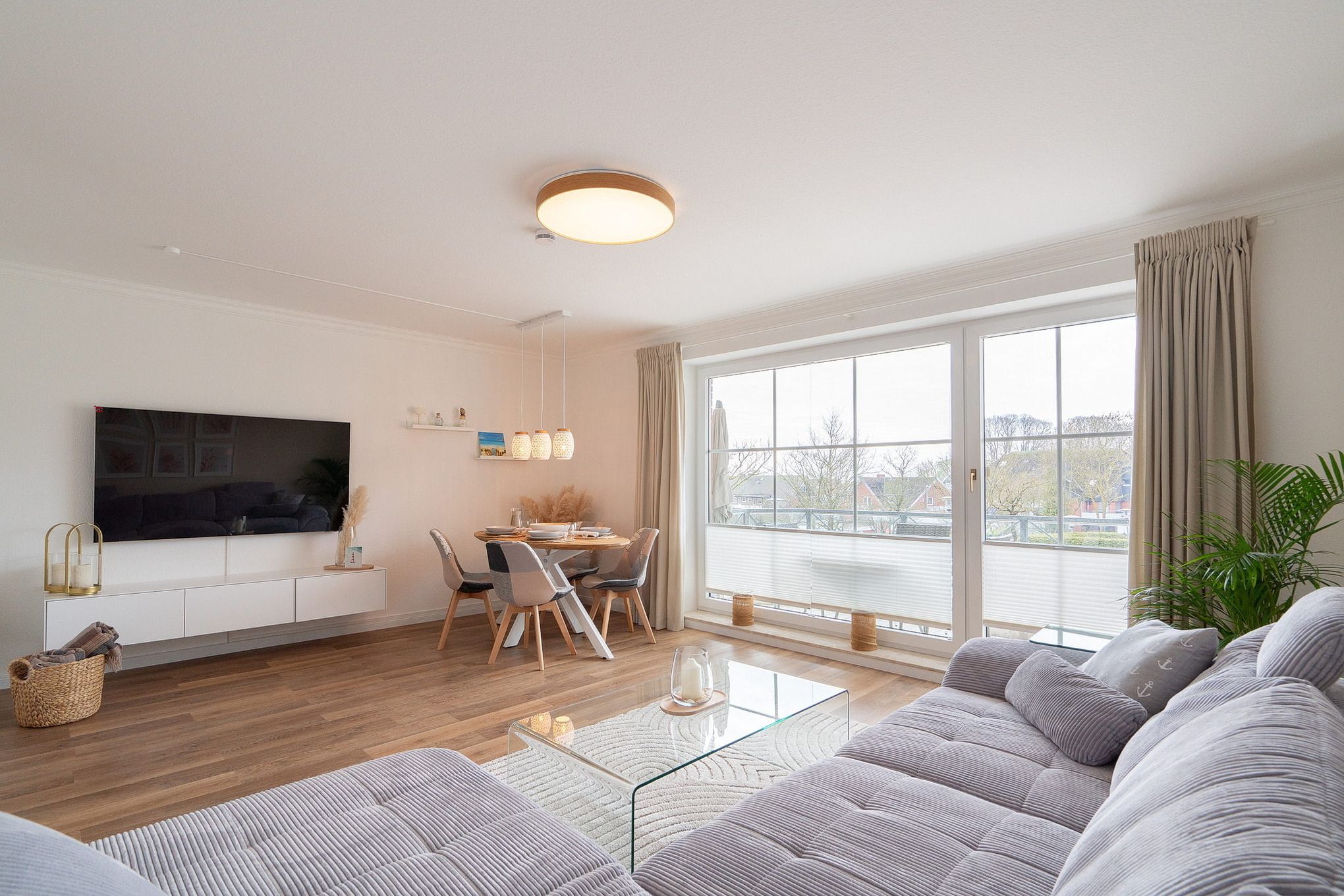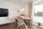 Gemütlicher maritimer Wohn-Essbereich mit direktem Zugang zum Balkon, welcher Richtung Parkplatz zeigt. Das Zimmer ist ausgestattet mit einem großzügigem Ecksofa und einem Essplatz für 4 Personen. Zur Unterhaltung steht ein großer Flachbild-TV zur Verfügung. Der Boden ist mit hochwertigem Laminat ausgelegt. Die Fenster lassen sich mit Vorhängen und Plissees etwas verdunkeln.
