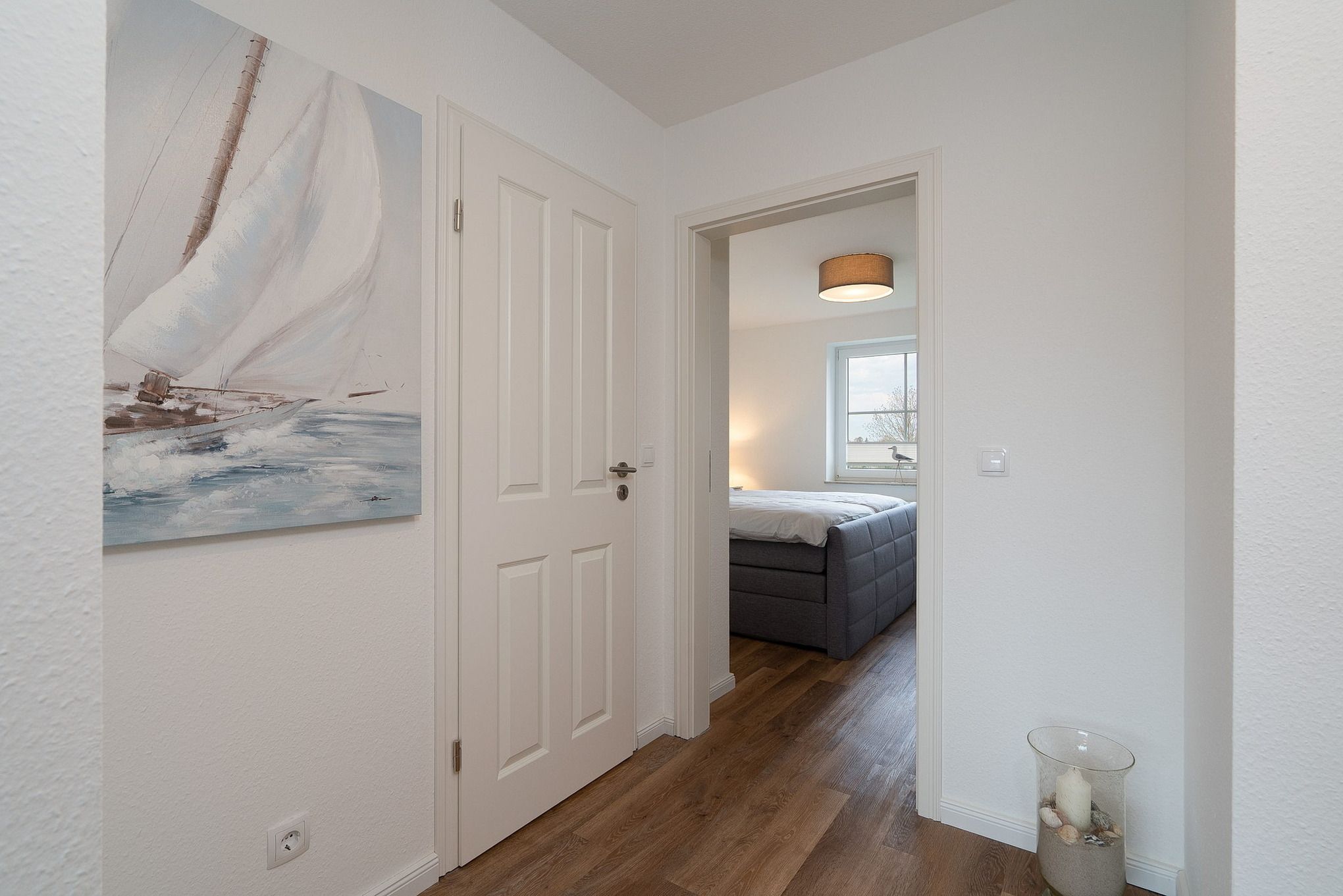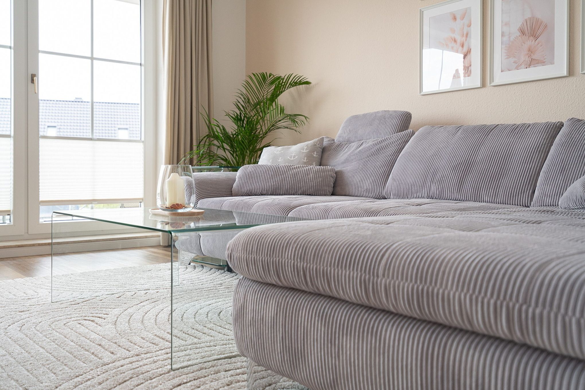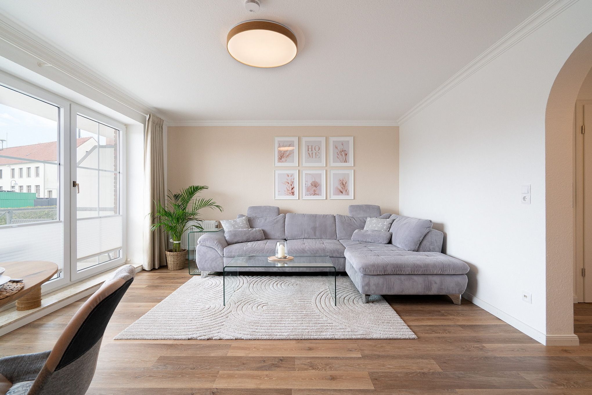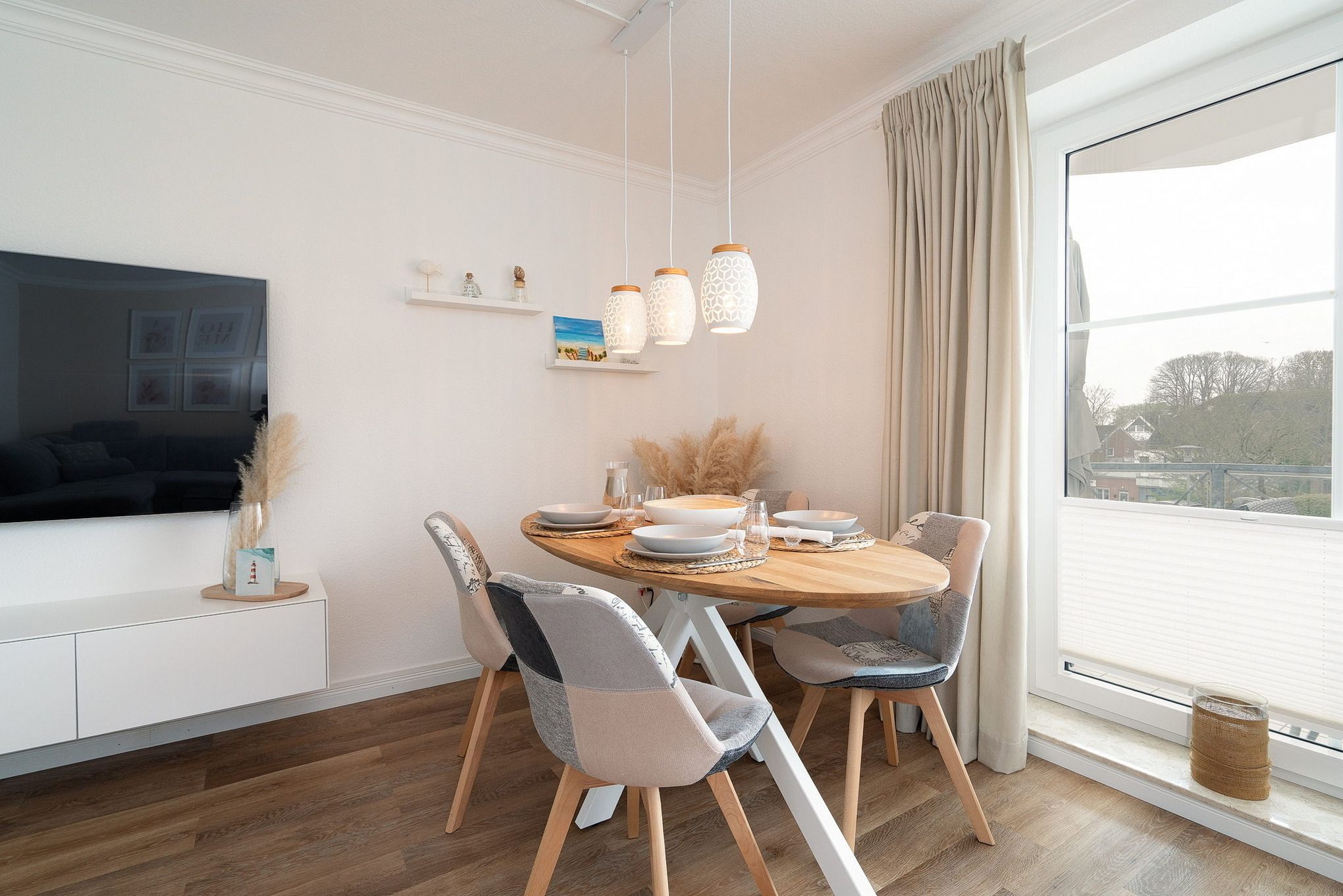 Gemütlicher maritimer Wohn-Essbereich mit direktem Zugang zum Balkon, welcher Richtung Parkplatz zeigt. Das Zimmer ist ausgestattet mit einem großzügigem Ecksofa und einem Essplatz für 4 Personen. Zur Unterhaltung steht ein großer Flachbild-TV zur Verfügung. Der Boden ist mit hochwertigem Laminat ausgelegt. Die Fenster lassen sich mit Vorhängen und Plissees etwas verdunkeln.