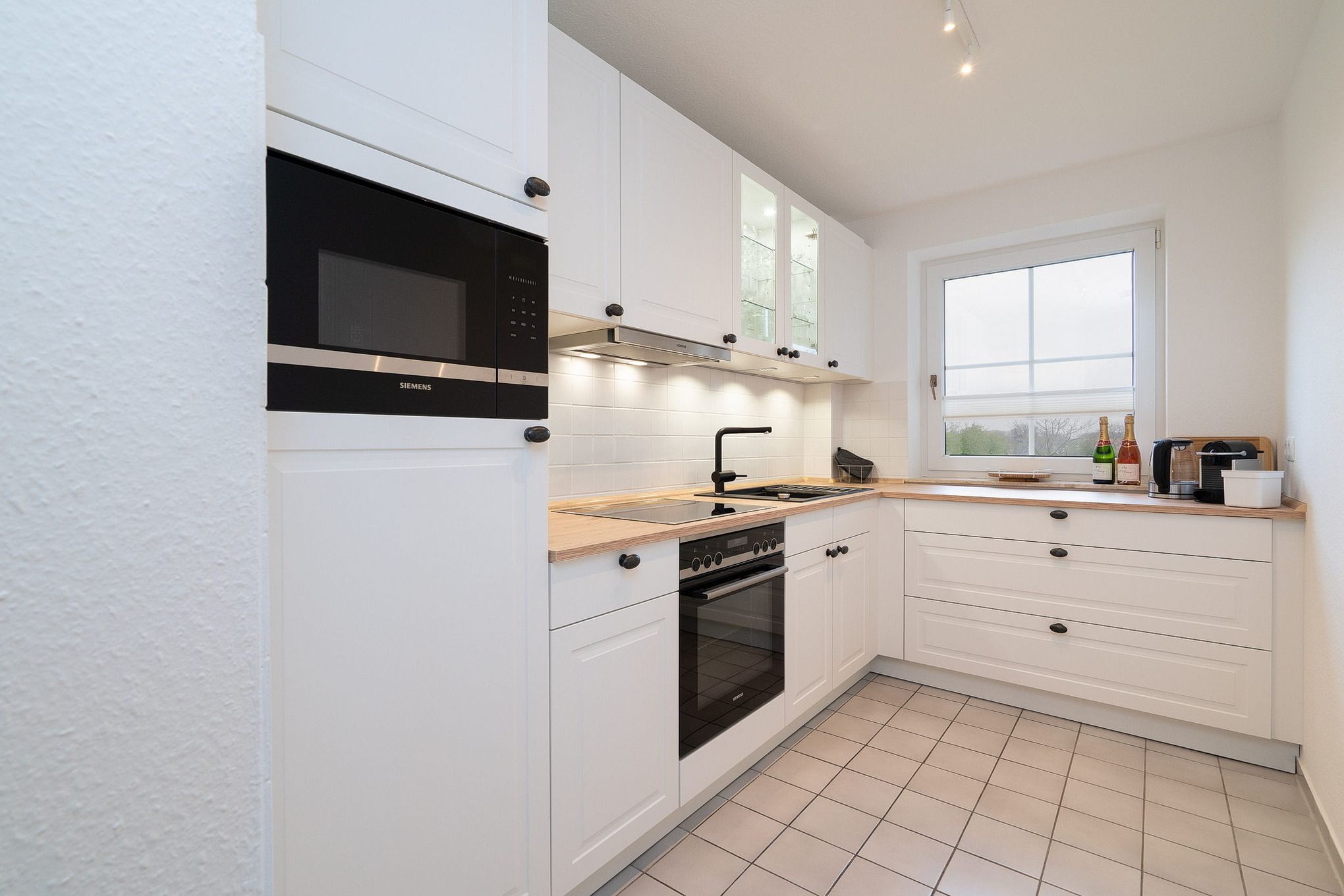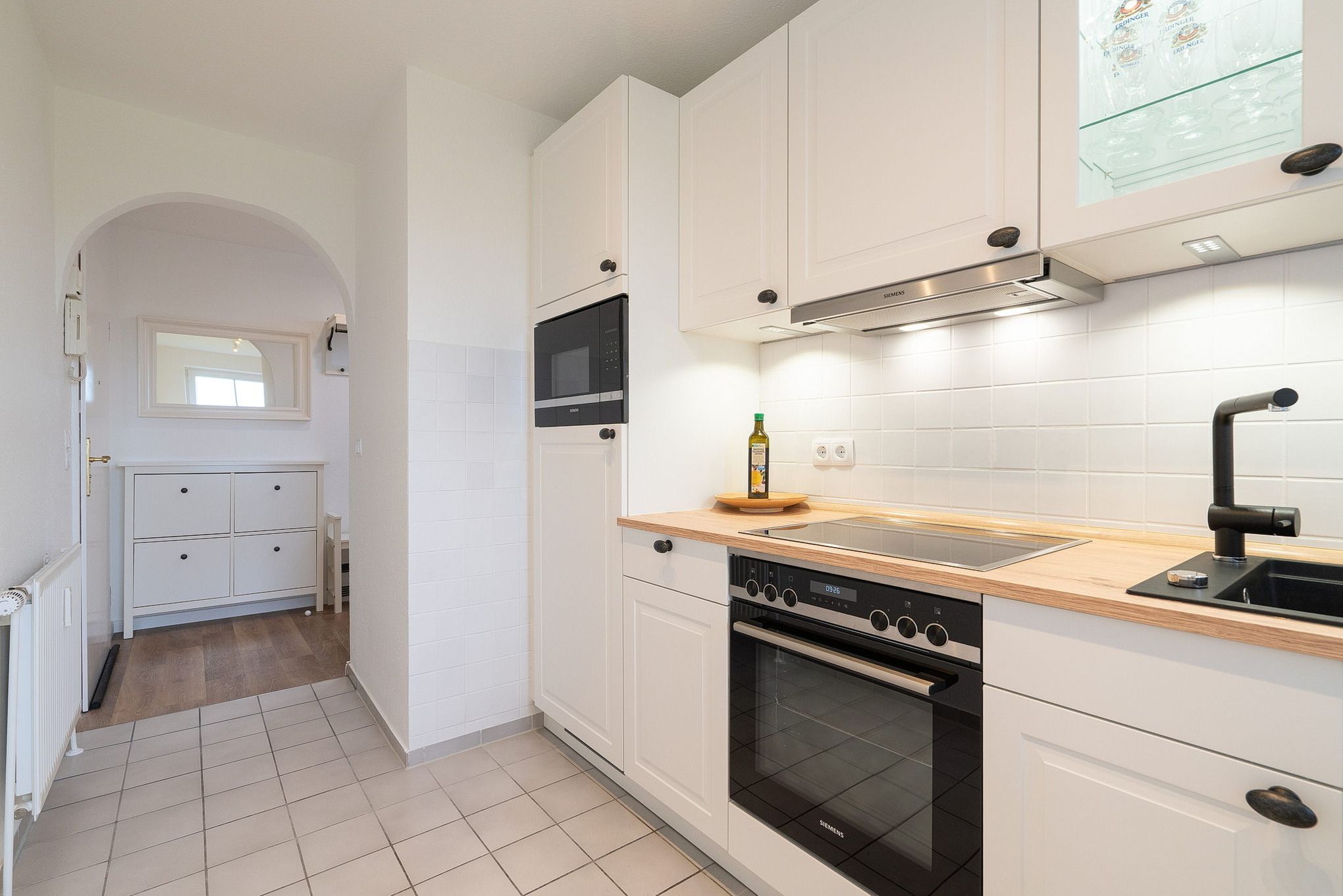 Die Küche ist komplett ausgestattet mit einem 4-Platten Induktionskochfeld, einem Backofen, einer Spülmaschine, einer Mikrowelle und einem Kühlschrank mit kleinem Gefrierfach. Ebenso stehen eine Kaffeemaschine, ein Toaster und ein Wasserkocher zur Verfügung.