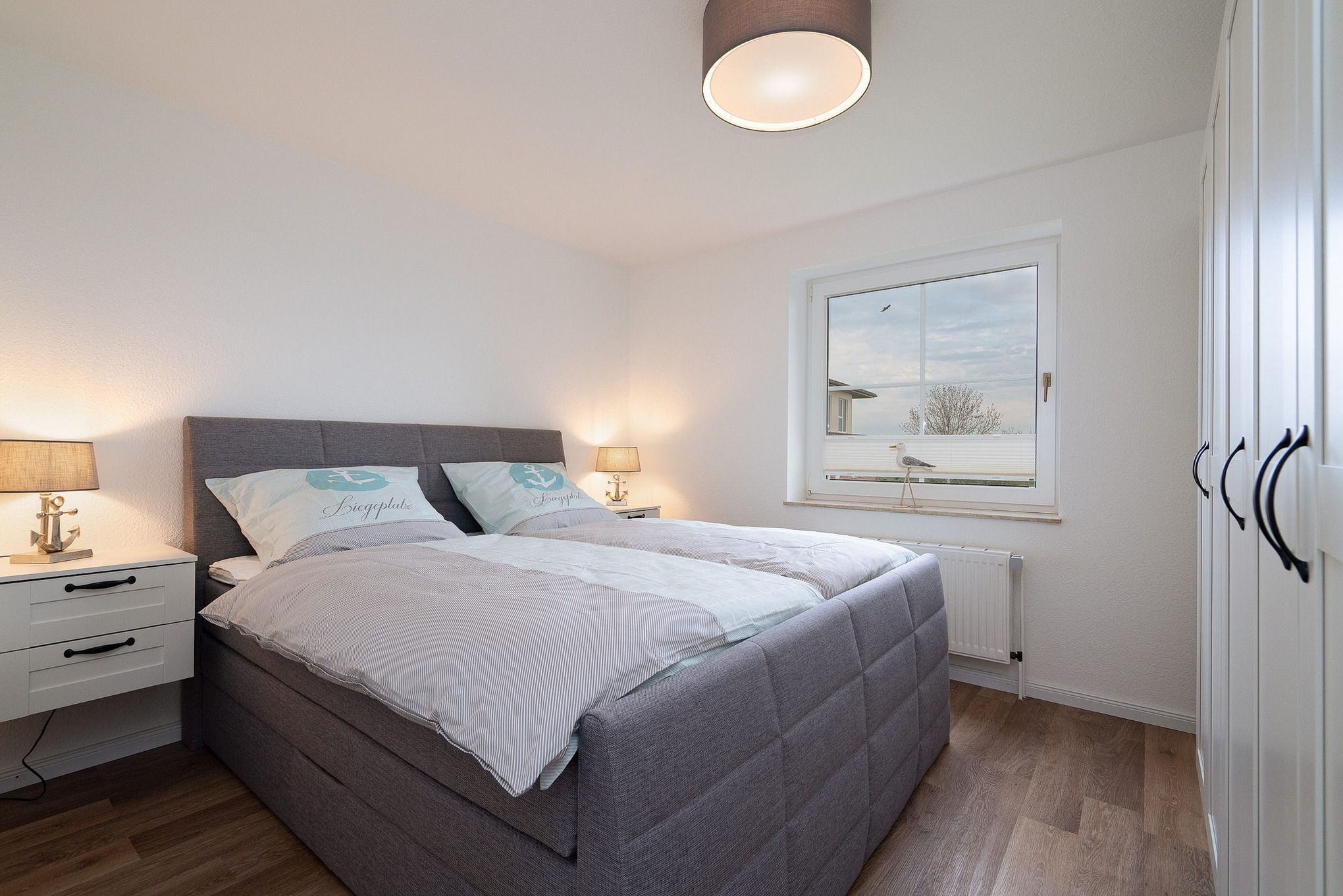 Das gemütliche Schlafzimmer ist mit einem großen Boxspringbett (180x200cm plus Topper), einem Kleiderschrank sowie zwei Nachttischen ausgestattet. Der Boden ist mit hochwertigem Laminat ausgelegt. Das Fenster ist mit einem blickdichtem Plissee ausgestattet.
