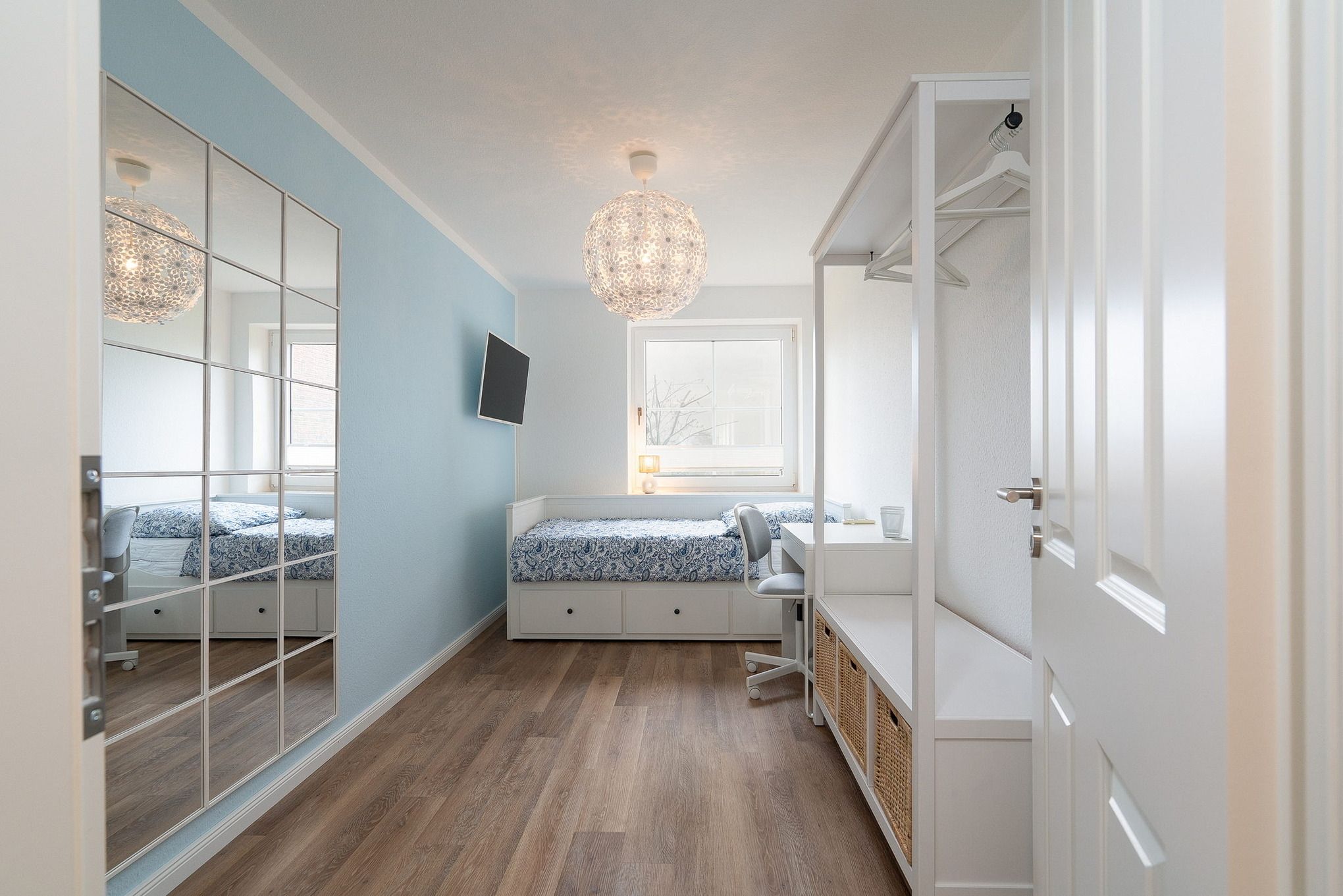 Das geräumige, helle Zimmer ist mit einem Einzelbett (90x200cm), welches ausziehbar ist (ebenfalls 90x200cm) und einem Garderobenständer ausgestattet. Zur Unterhaltung steht ein Flachbild-TV zur Verfügung. Das Fenster ist mit einem blickdichtem Plissee ausgestattet.