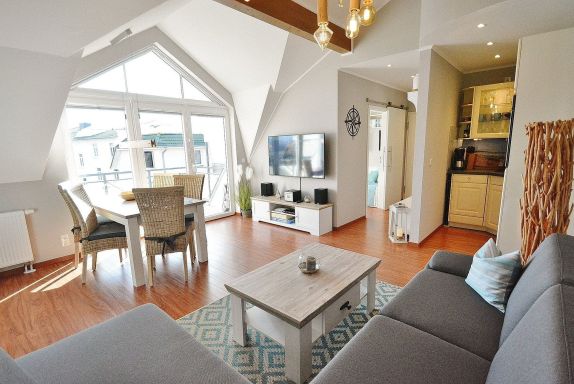 Modern und stilvoll eingerichtetes Wohn- und Esszimmer mit direktem Zugang zum Balkon. Das Wohn- und Esszimmer ist mit einer bequemen Eck-Schlafcouch (150x200cm), einem Couchtisch, einem Essplatz für 5 Personen und einem TV-Schrank ausgestattet. Das Zimmer ist mit Designer-Planken ausgelegt. Zur Unterhaltung steht ein großer Flachbildschirm, ein Bluray-Player und eine netzwerkfähige Mini-Stereoanlage mit CD-Player zur Verfügung. Die Fenster lassen sich durch Innenplissees verdunkeln.