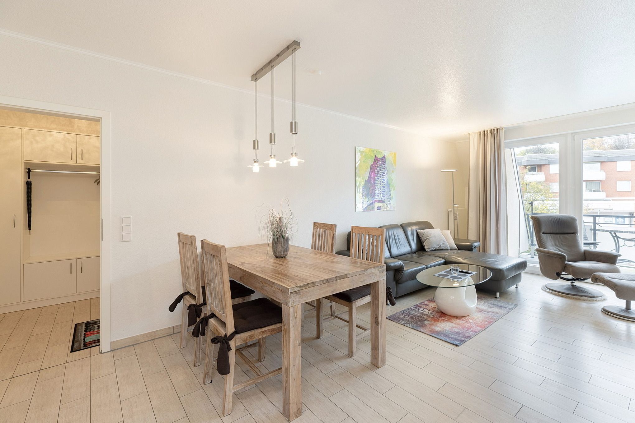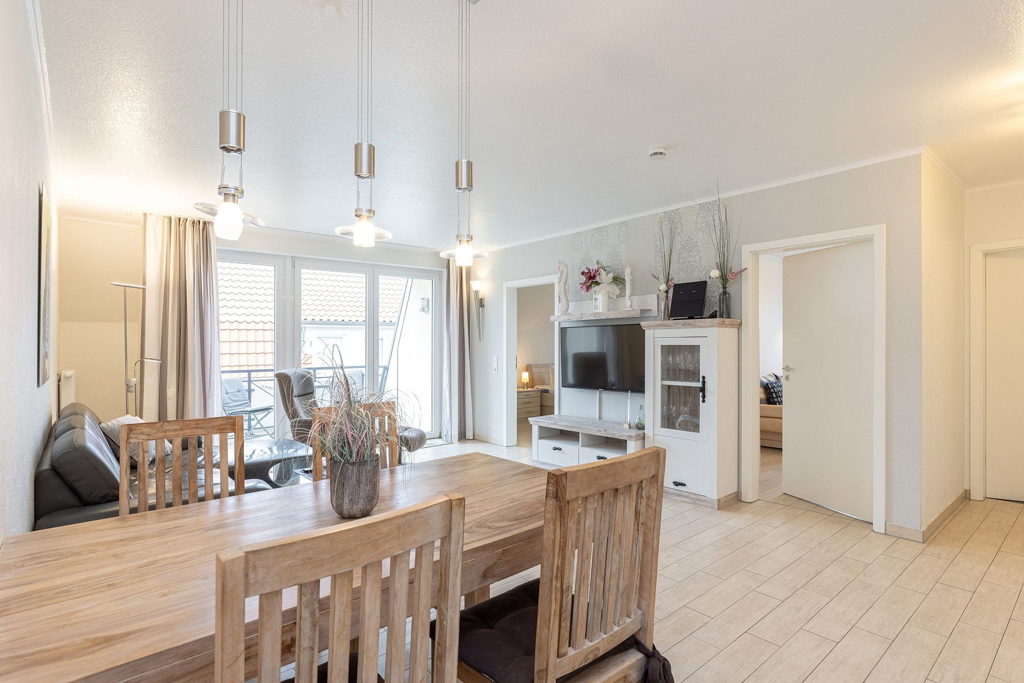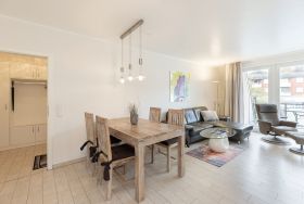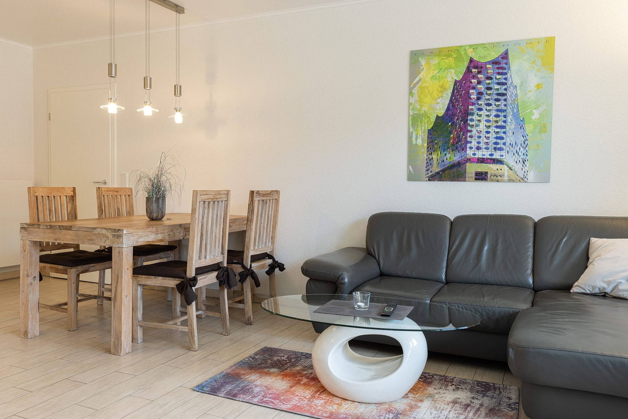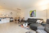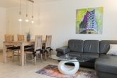 Modern ausgestattetes Wohn- und Esszimmer mit direktem Zugang zum Balkon. Das Wohn- und Esszimmer ist mit einem Essplatz für 4 Personen, einer Ledercouch, einem Couchtisch, einem TV-Sessel, einer Wohnzimmerkommode und einem Vitrinen Schrank ausgestattet. Zur Unterhaltung stehen ein Flachbildschirm und eine Mini-Stereoanlage zur Verfügung. Das Zimmer ist mit Designer-Planken ausgelegt.