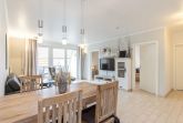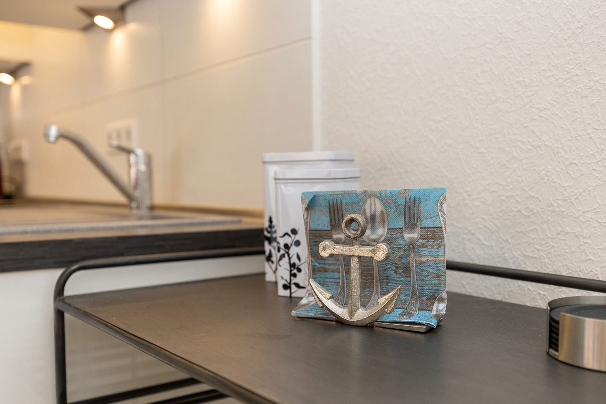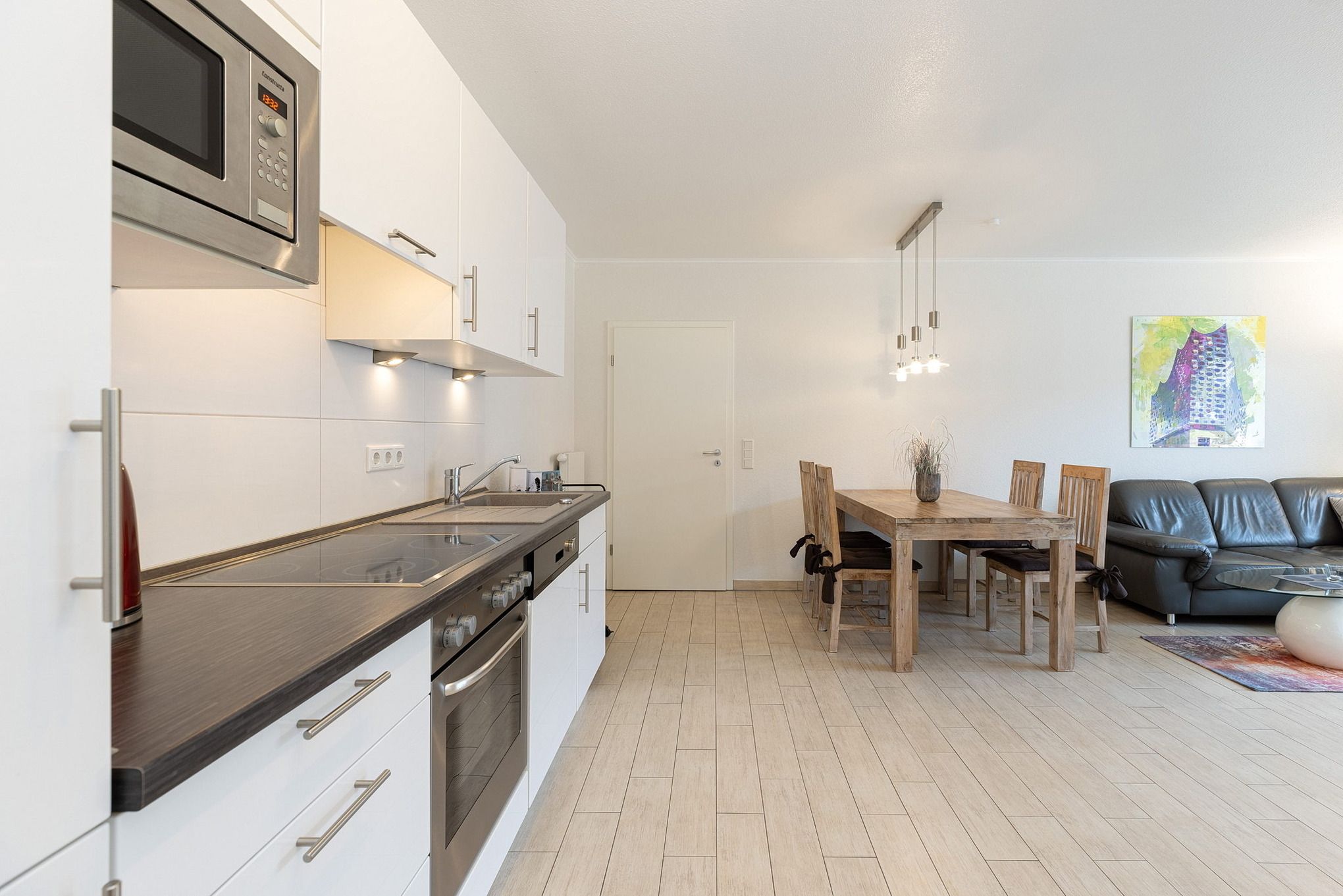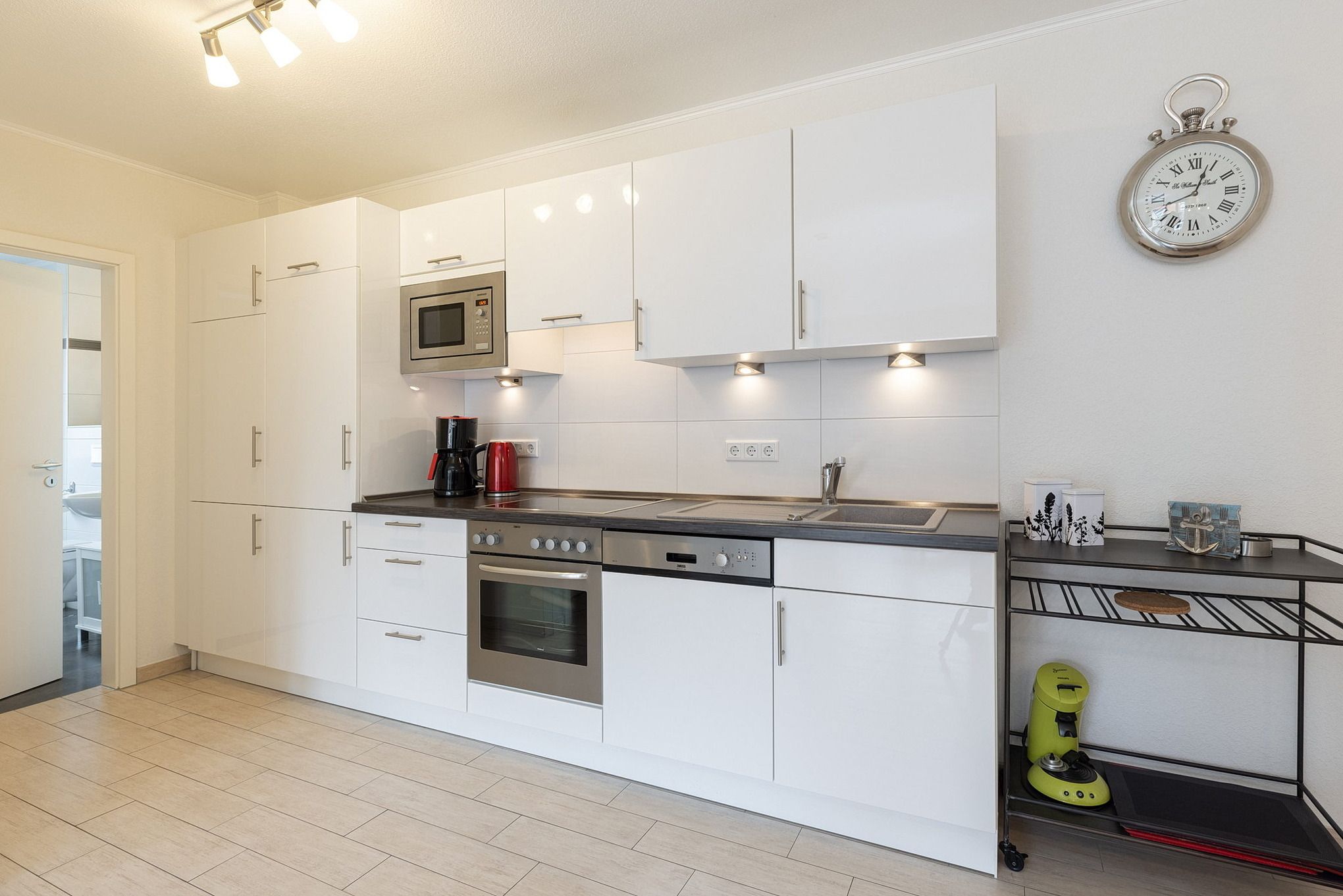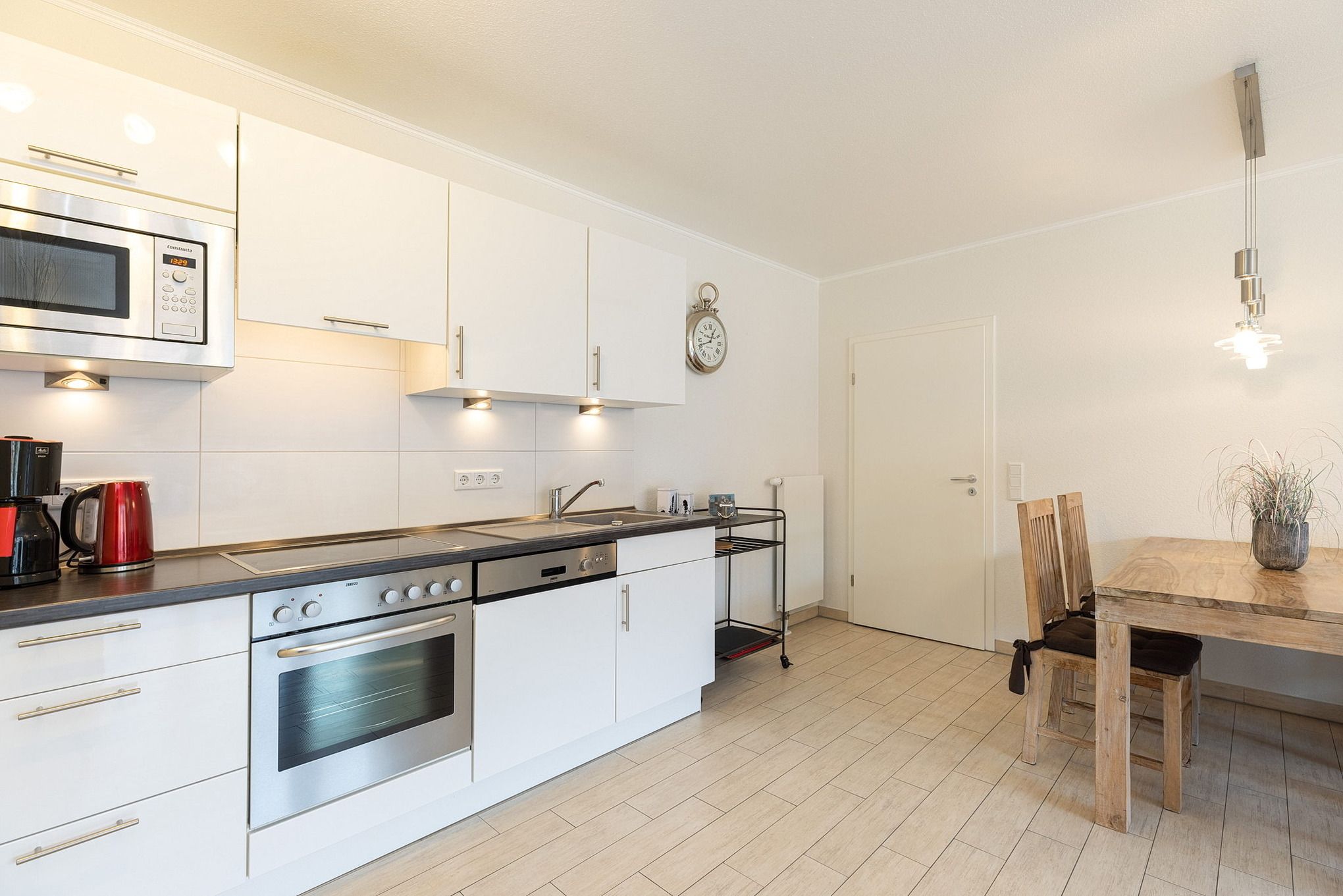 Moderne, zum Wohn- und Esszimmer offene, komplett ausgestattete Küche mit 4 Platten Cerankochfeld, Backofen, Spülmaschine, Kühlschrank mit kleinem 3-Sterne Gefrierfach, Mikrowelle, Toaster, Wasserkocher, Eierkocher und Kaffeemaschine.