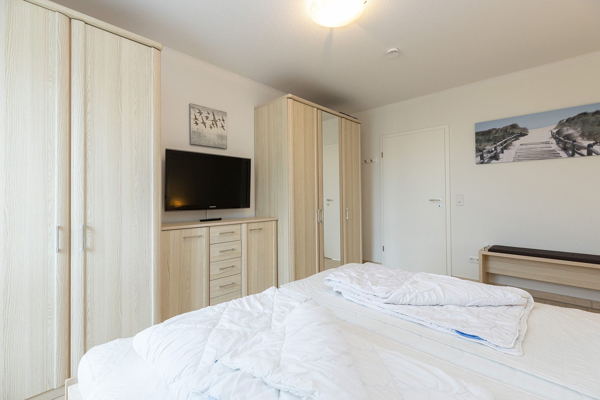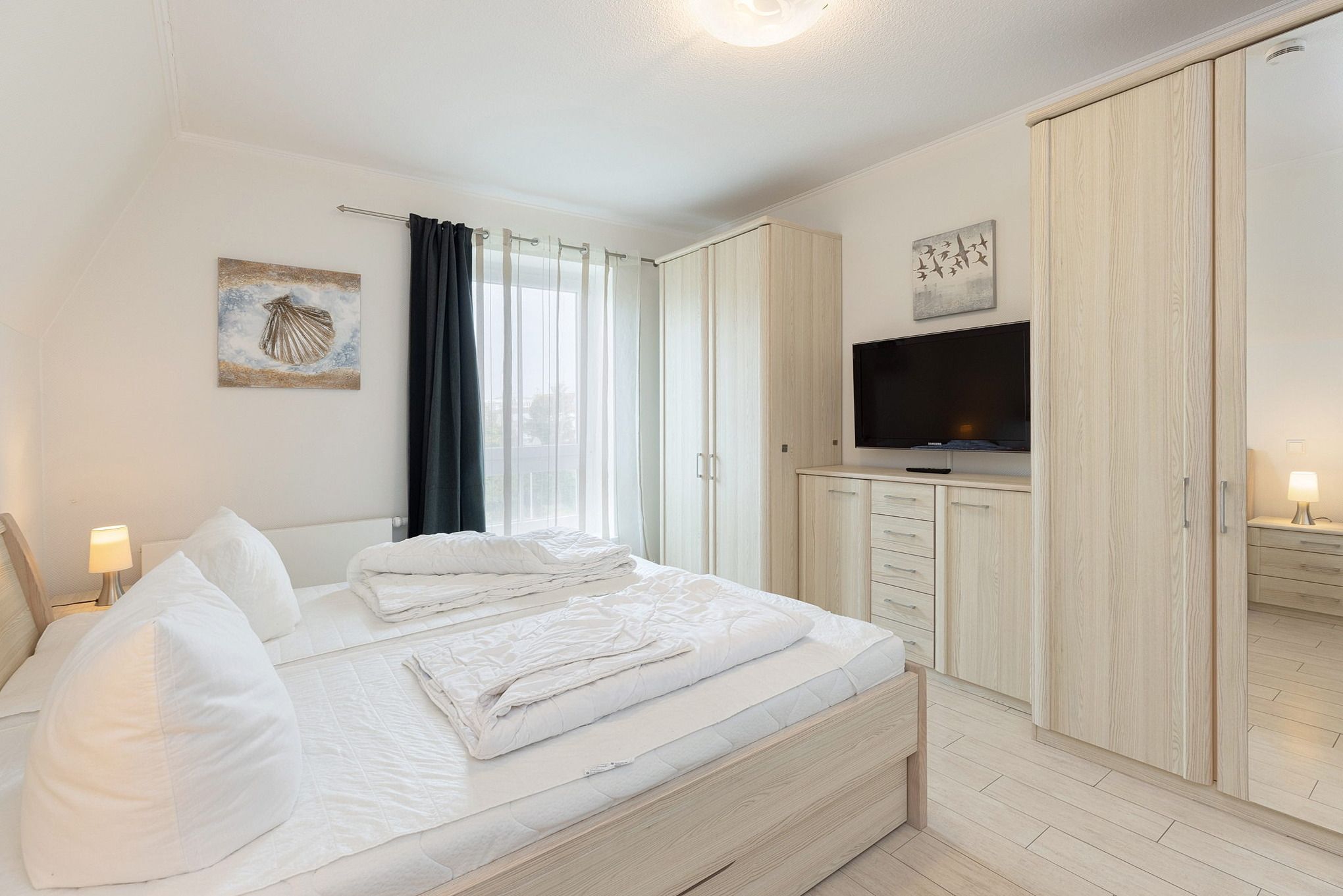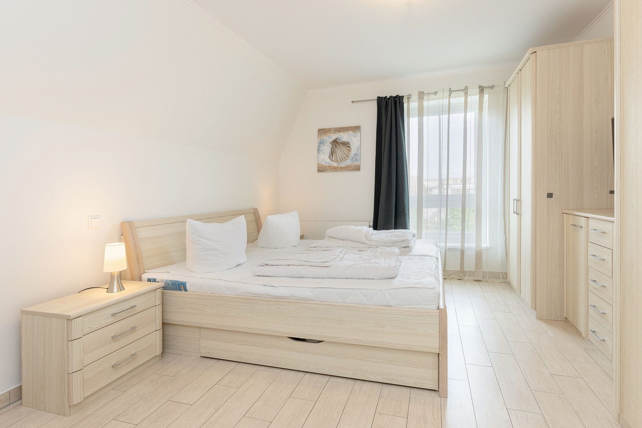 Modernes, freundliches, Schlafzimmer mit einem Doppelbett (2x 100x200cm), 2 Nachttischen, einer Kommode und einem Kleiderschrank. Das Schlafzimmer verfügt ebenfalls über einen Fernseher. Das Fenster lässt sich durch einen Vorhang und ein Innenrollo blickdicht verdunkeln. Das Zimmer ist mit Designer-Planken ausgelegt.