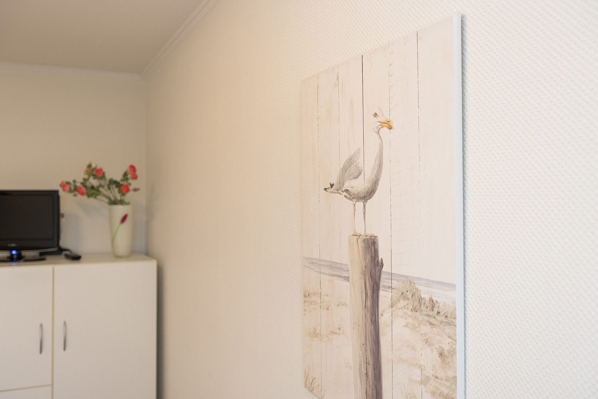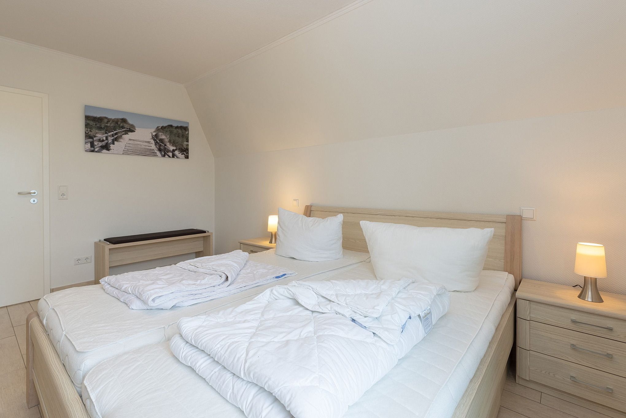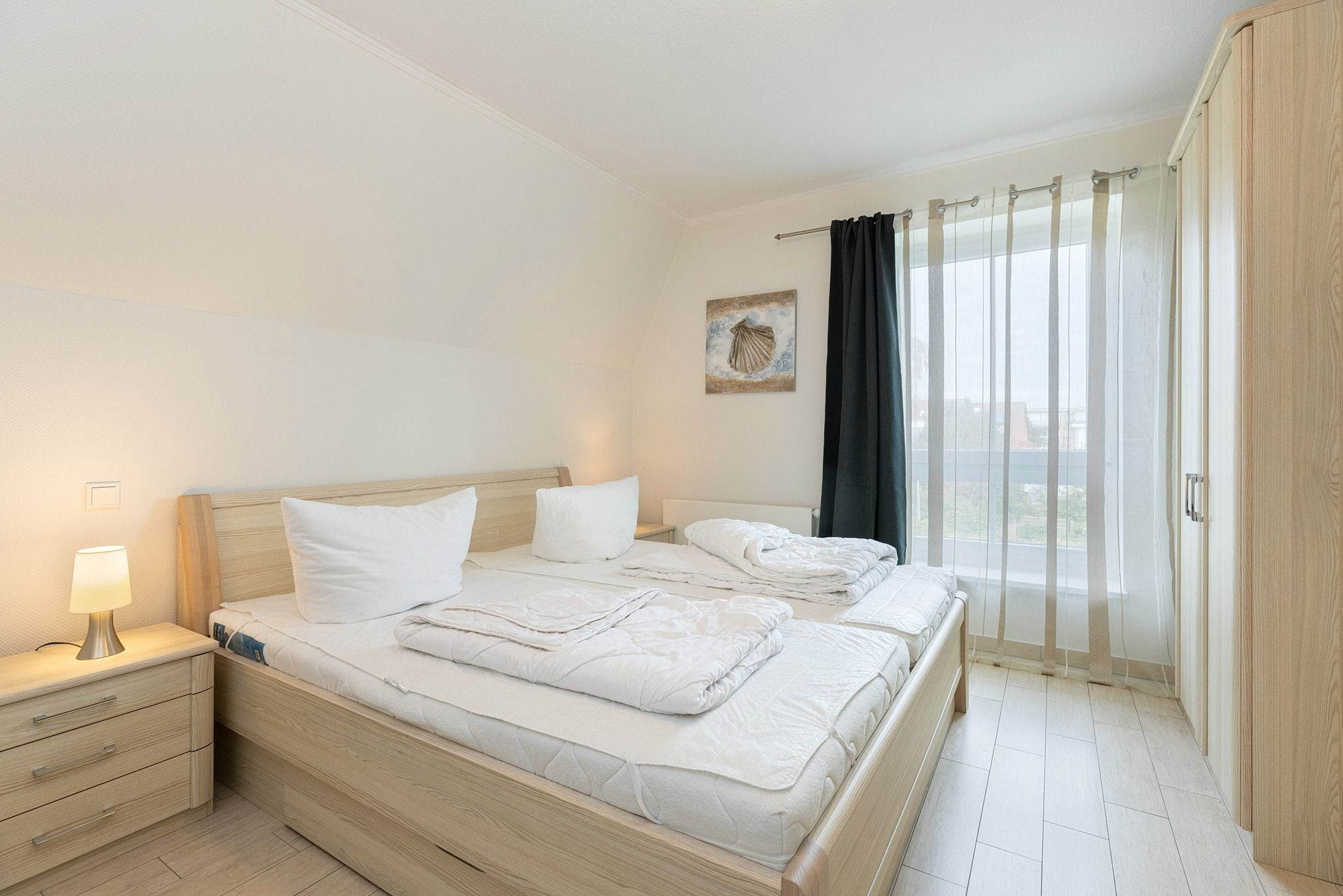 Modernes, freundliches, Schlafzimmer mit einem Doppelbett (2x 100x200cm), 2 Nachttischen, einer Kommode und einem Kleiderschrank. Das Schlafzimmer verfügt ebenfalls über einen Fernseher. Das Fenster lässt sich durch einen Vorhang und ein Innenrollo blickdicht verdunkeln. Das Zimmer ist mit Designer-Planken ausgelegt.